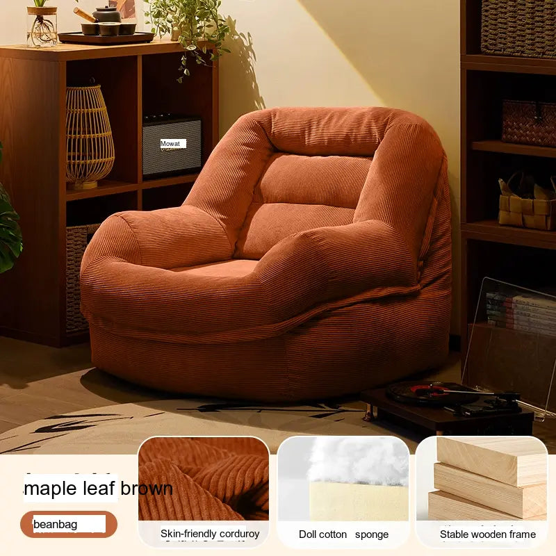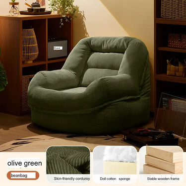 The Callahan Bean Bag Sofa is adorned in a solid color pattern, which beautifully blends with any decor. Available in three stunning shades – Olive Green, Creamy White, and Maple Leaf Brown – this sofa not only offers visual appeal but also brings a touch of elegance to your room. The skin-friendly corduroy fabric adds a soft texture that invites relaxation, while the minimalist modern style ensures it complements both contemporary and classic interiors.
