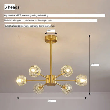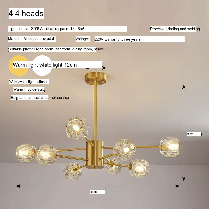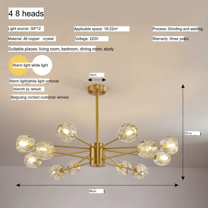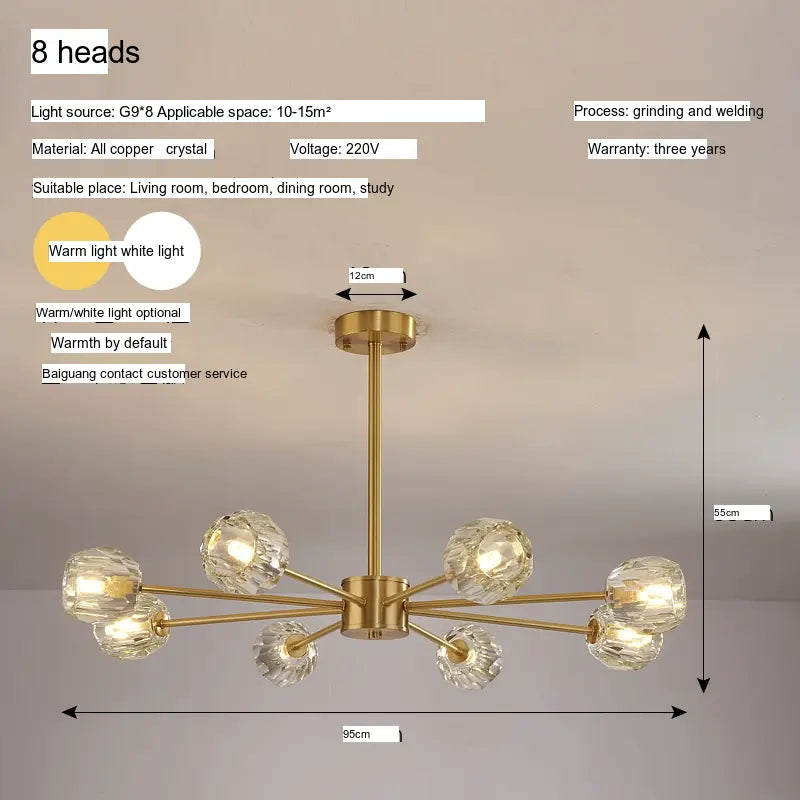 - High-Quality Construction: Crafted from premium materials, this chandelier is constructed with a durable copper body and has been meticulously detailed with high-grade crystals. This guarantees both its longevity and sustained brilliance, ensuring that your chandelier remains a striking centerpiece for years to come.
