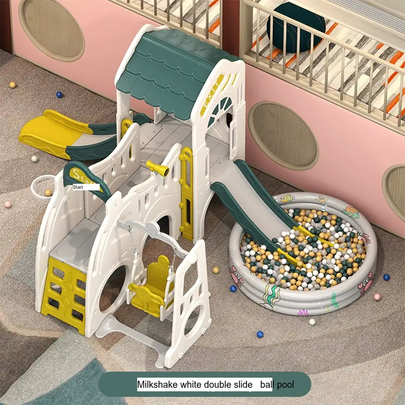 This interactive castle slide presents a three-stage buffer slide that is uniquely designed for optimal safety. It features a gentle slope, allowing children to slide down smoothly without fear of falling. The innovative design includes a dual ladder system, enabling multiple kids to climb and enjoy at the same time. The integrated swing adds an extra level of excitement, allowing your little ones to enjoy swaying motion within a secure framework that prevents leaning or falling.