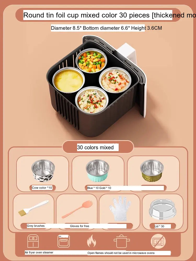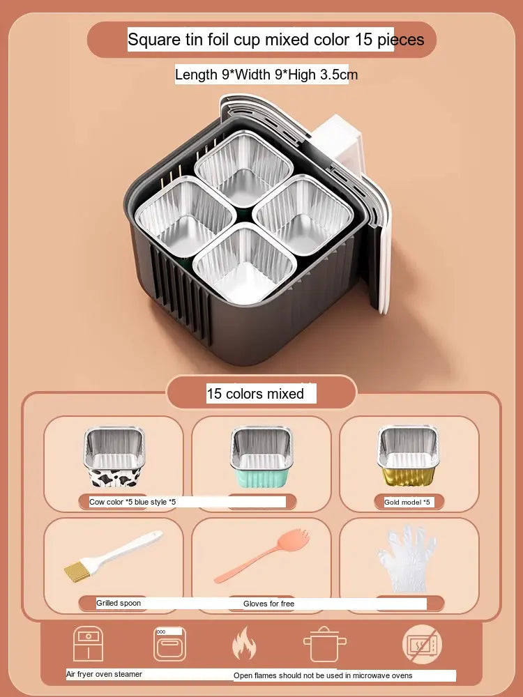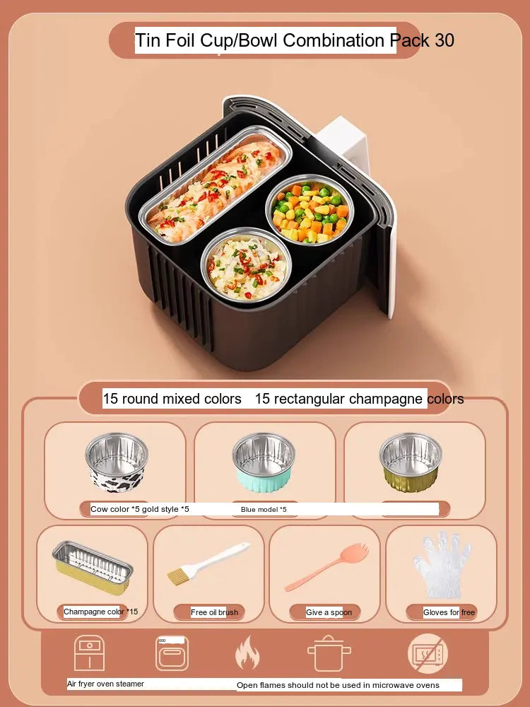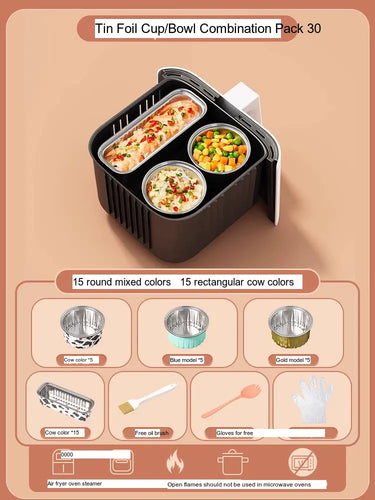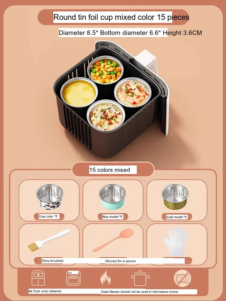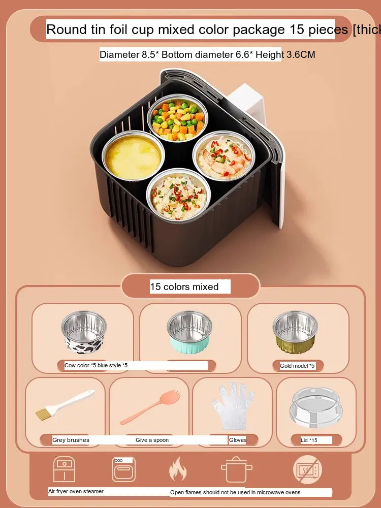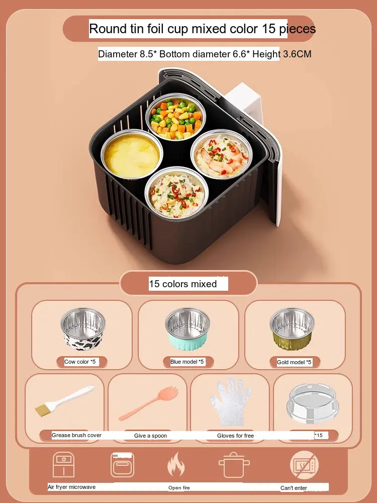 - [Value Combination Pack]: Enjoy 15 aluminum foil cups in assorted colors plus 15 bowls (Cow, Gold, or Light Blue), making it ideal for cooking up to three meals simultaneously.