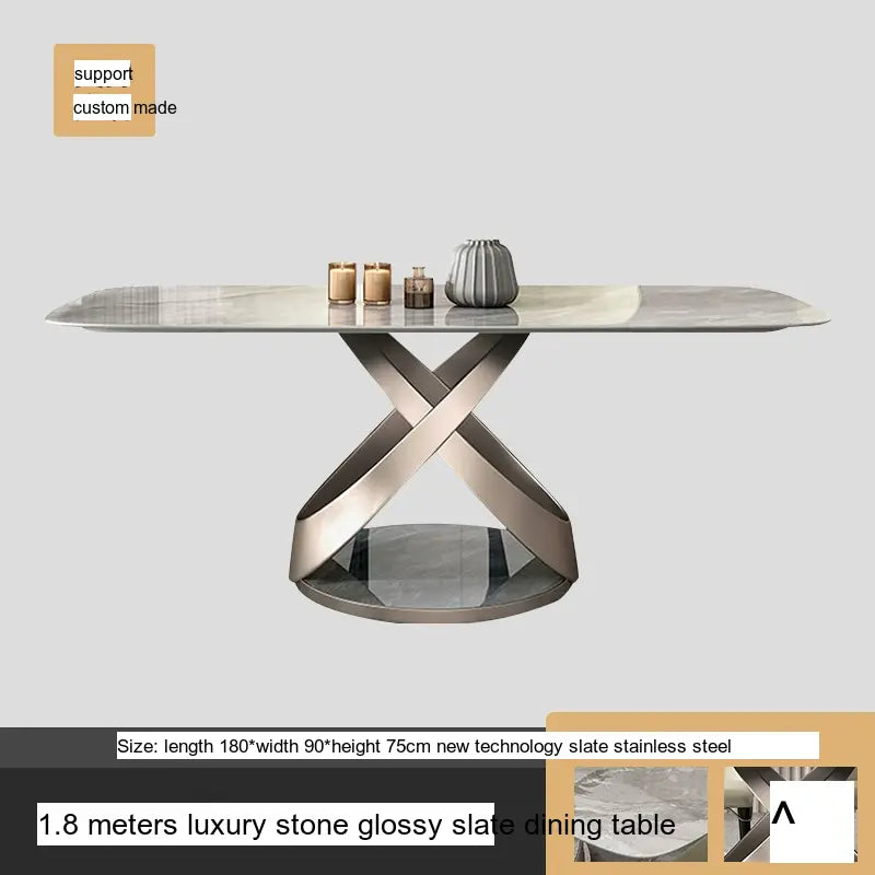 The JIUHUANG Oliver dining table features a breathtaking rectangular shape, complemented by a high-quality luxury stone light rock plate surface that exhibits a brilliant shine. The exquisite marble finish not only enhances the elegance of your dining space but is also highly durable and easy to maintain. Choose from three different table lengths of 1.4 meters, 1.6 meters, and 1.8 meters to perfectly fit your dining area and accommodate your needs.