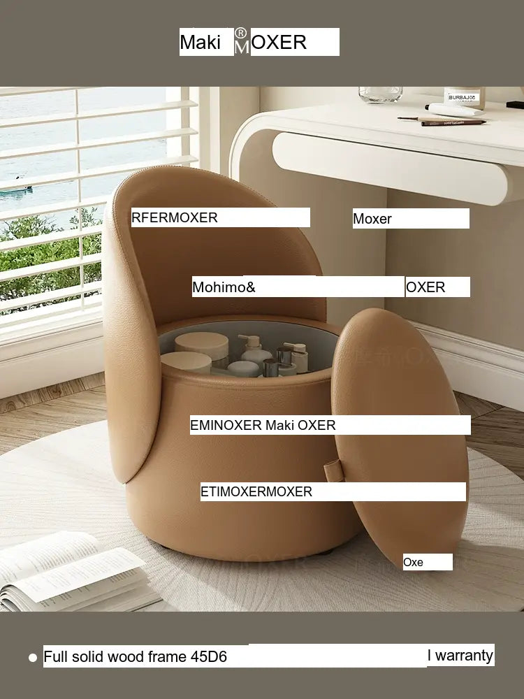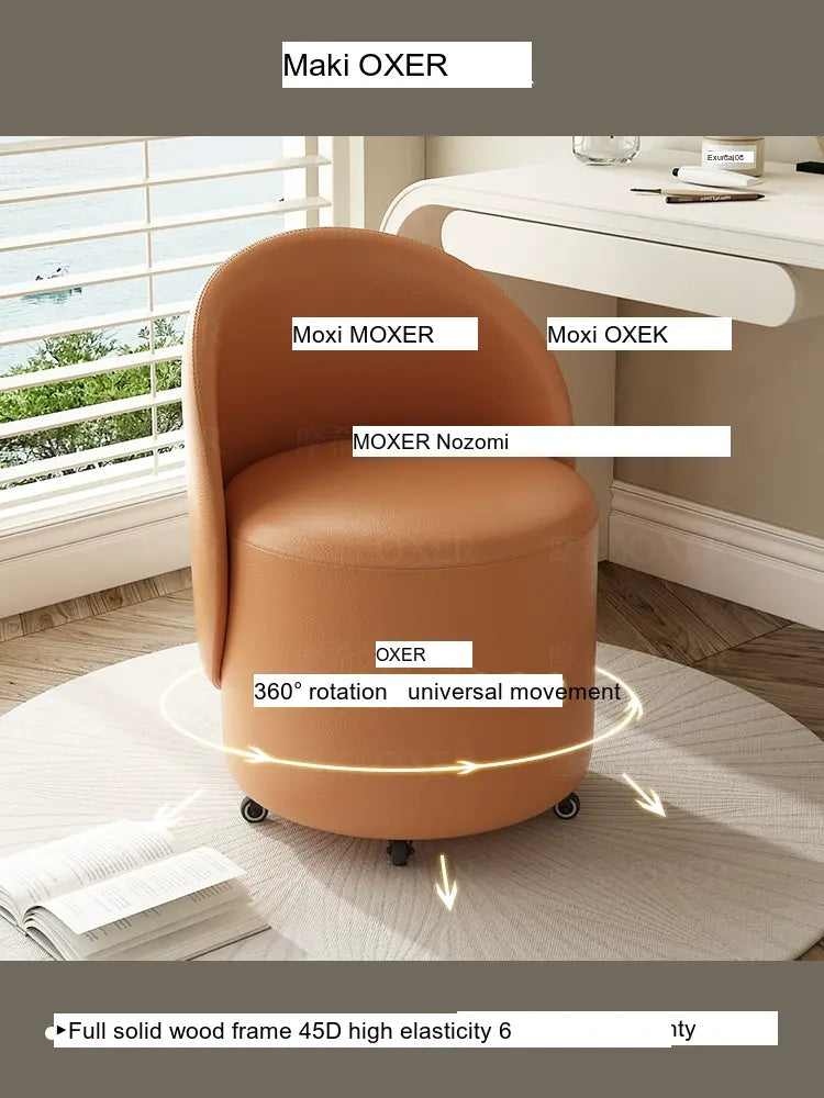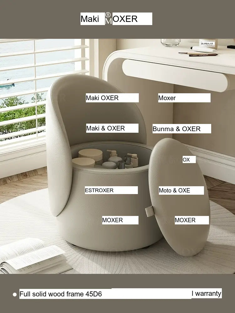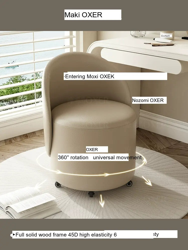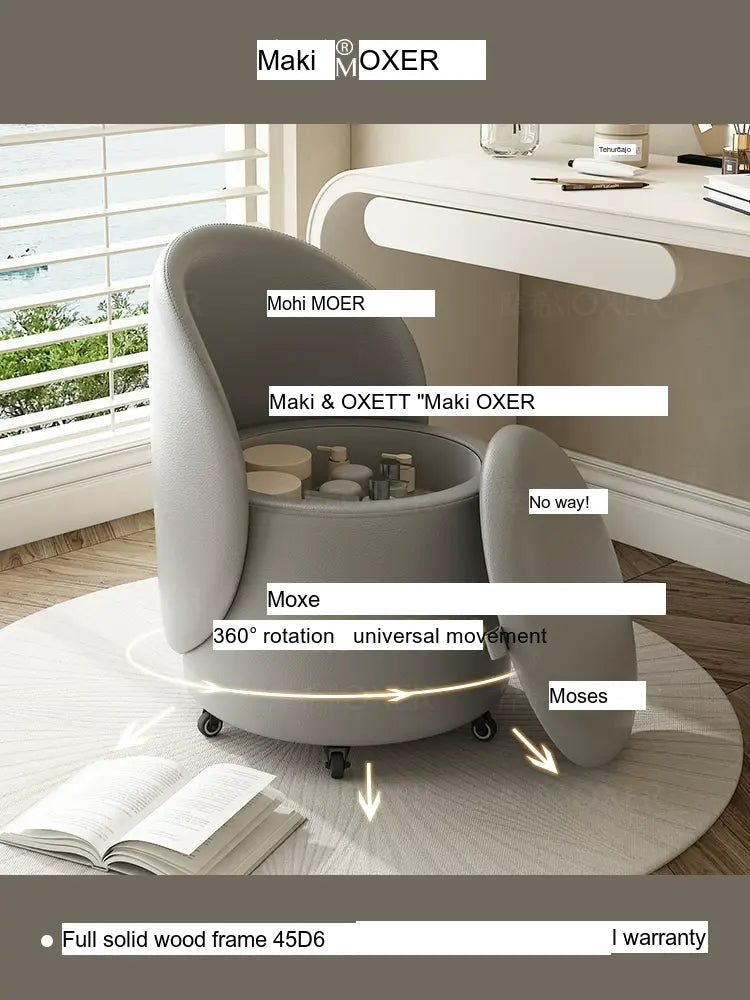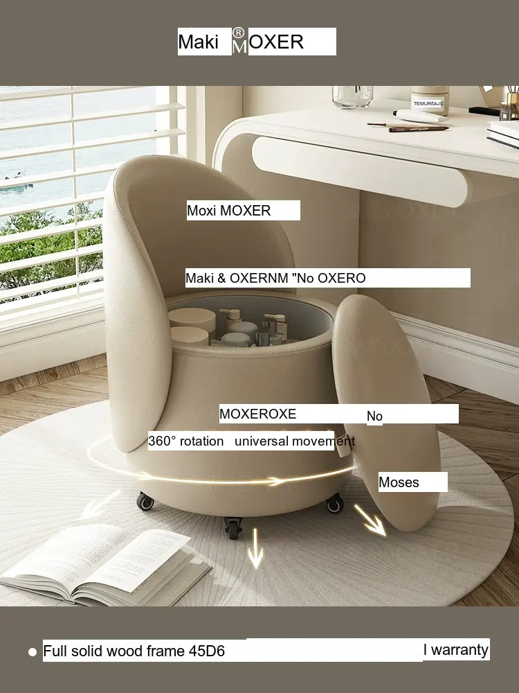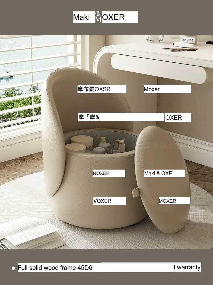 Constructed with a strong solid wood frame made from imported larch, the MOXER Aria stool offers both durability and stability. The high-density rebound sponge ensures maximum comfort, making it perfect for extended use during makeup sessions or leisure moments. Its seating surface is available in top-layer genuine leather or imported microfiber leather, providing a soft and luxurious touch that is also wear-resistant and easy to clean.