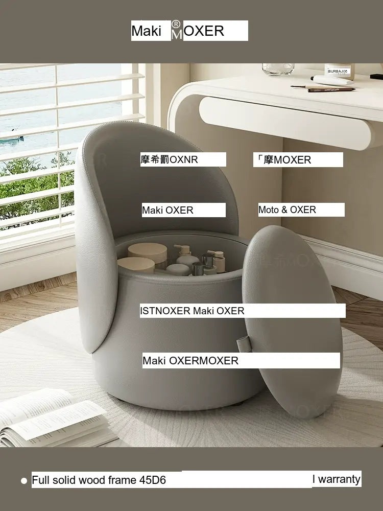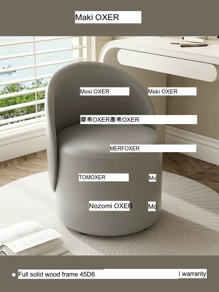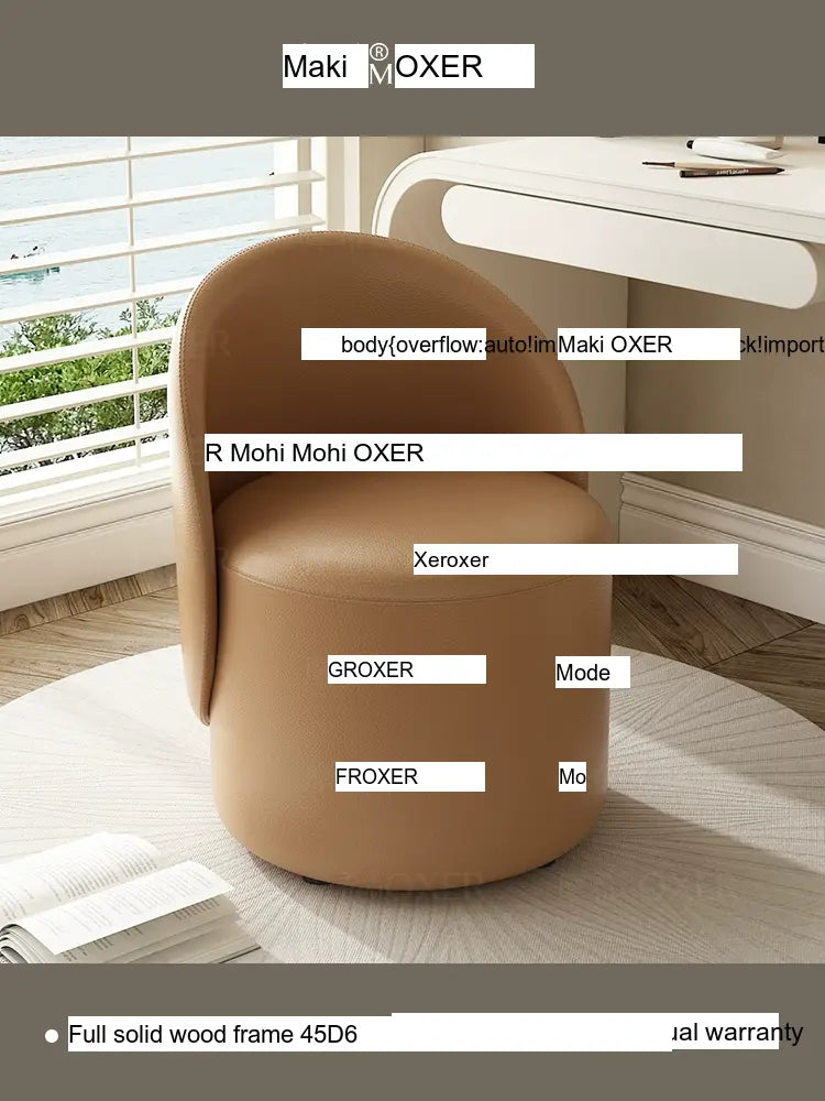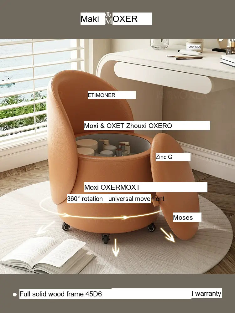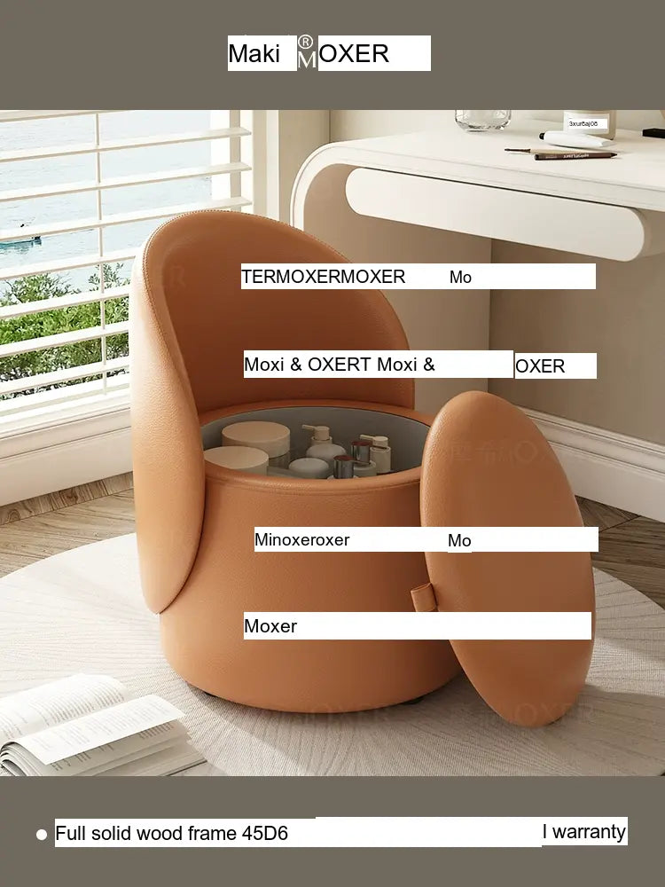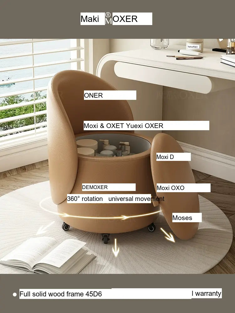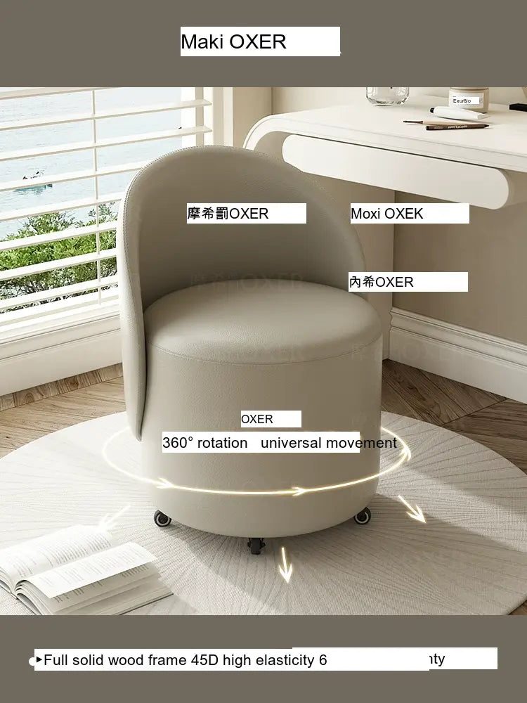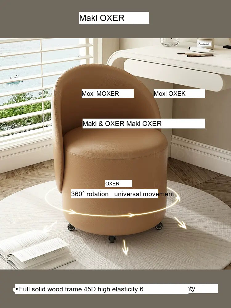 Constructed with a strong solid wood frame made from imported larch, the MOXER Aria stool offers both durability and stability. The high-density rebound sponge ensures maximum comfort, making it perfect for extended use during makeup sessions or leisure moments. Its seating surface is available in top-layer genuine leather or imported microfiber leather, providing a soft and luxurious touch that is also wear-resistant and easy to clean.