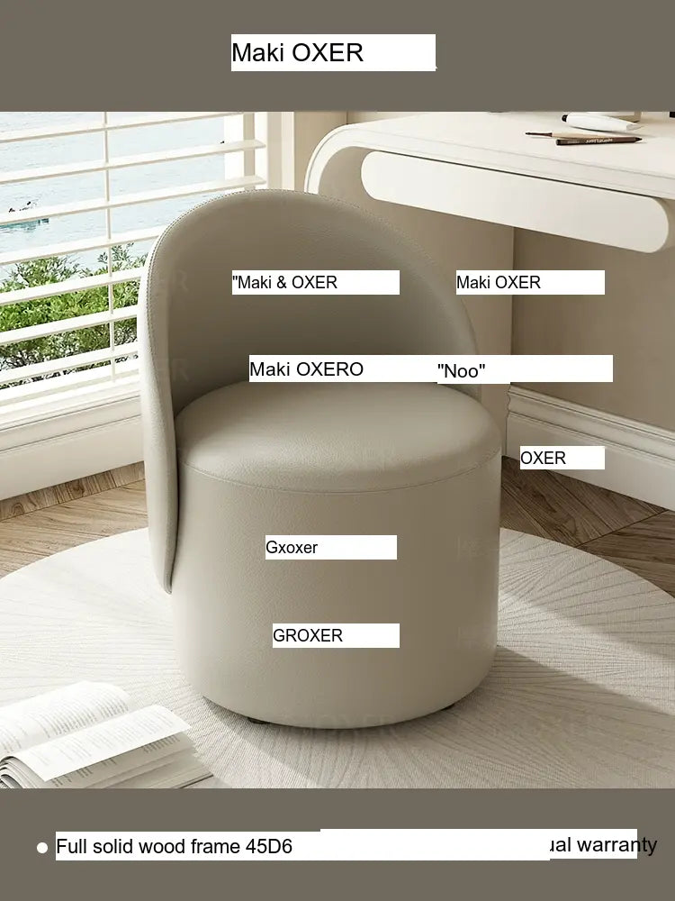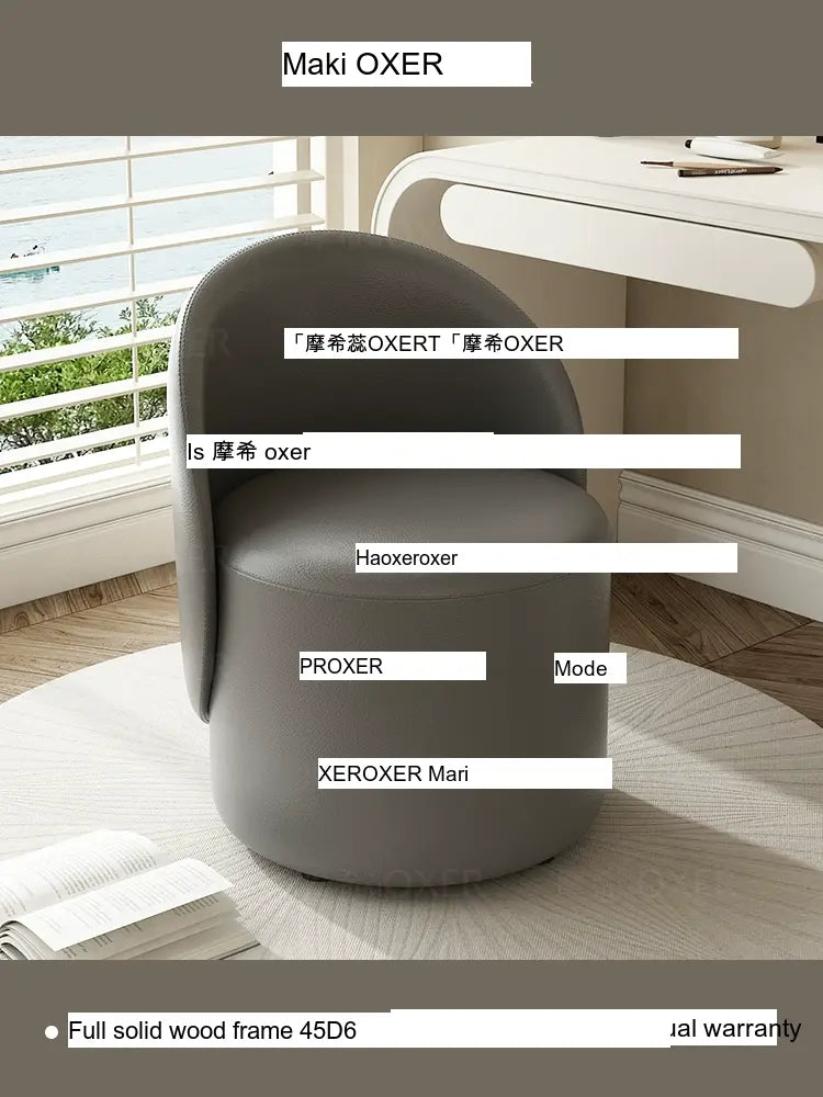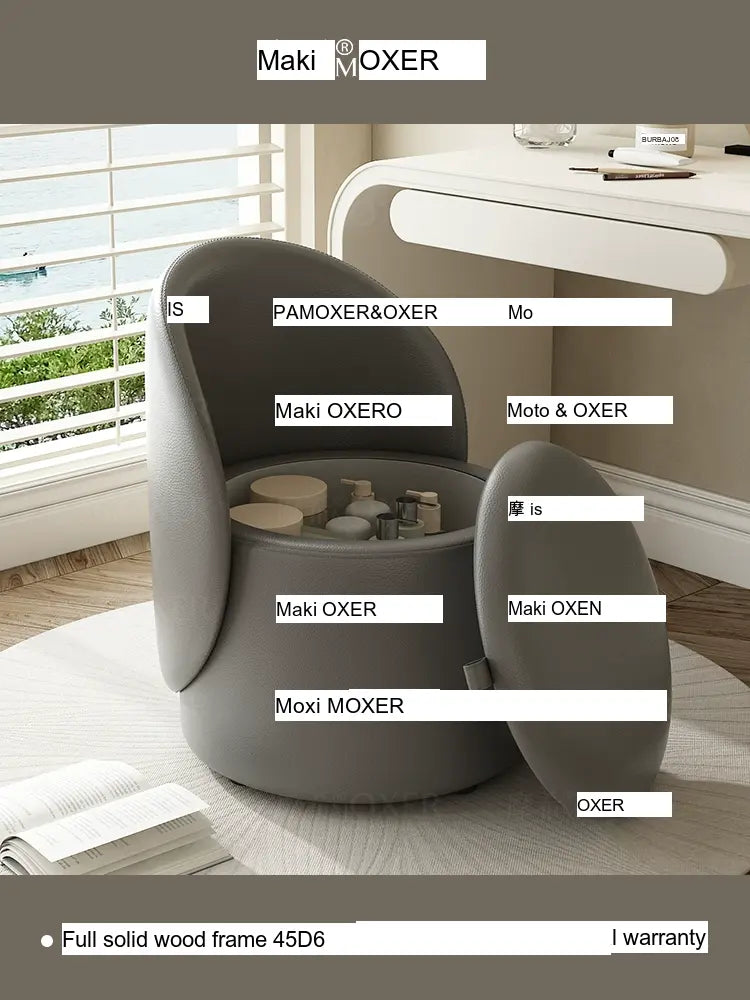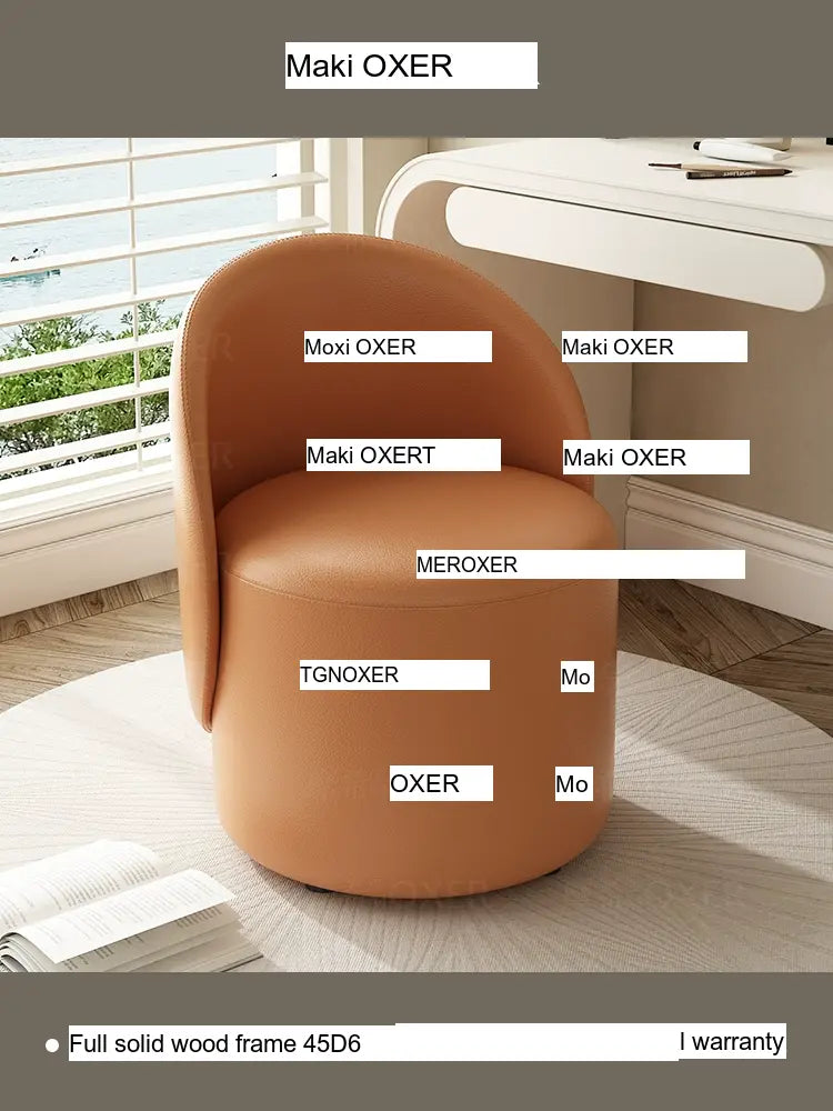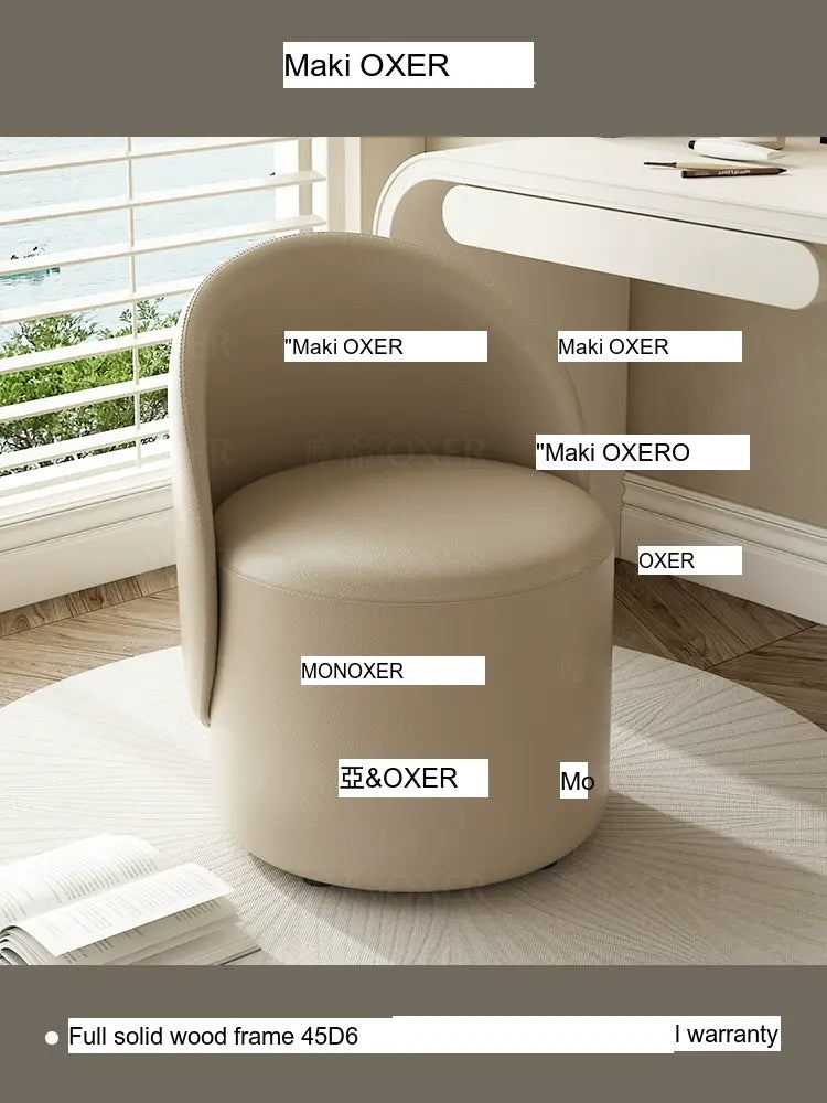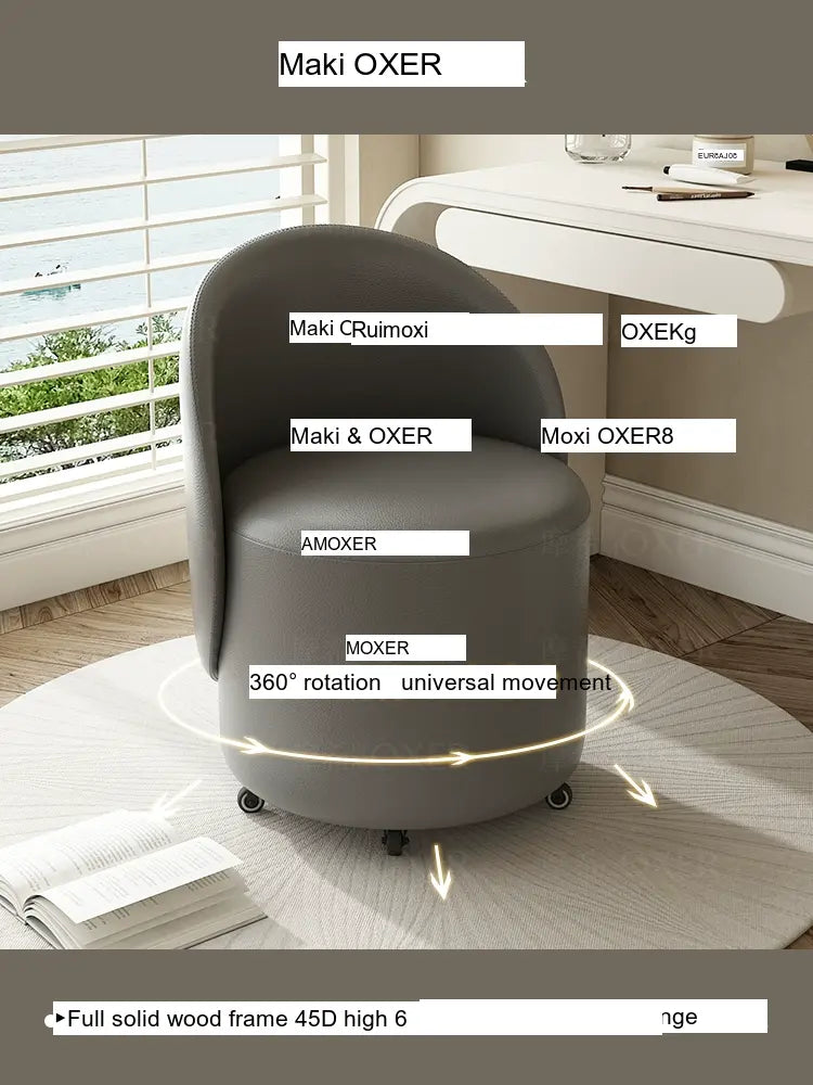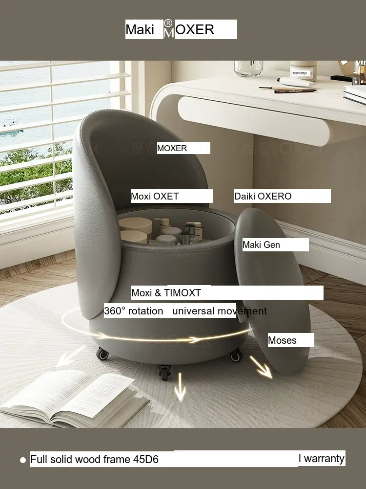 Constructed with a strong solid wood frame made from imported larch, the MOXER Aria stool offers both durability and stability. The high-density rebound sponge ensures maximum comfort, making it perfect for extended use during makeup sessions or leisure moments. Its seating surface is available in top-layer genuine leather or imported microfiber leather, providing a soft and luxurious touch that is also wear-resistant and easy to clean.
