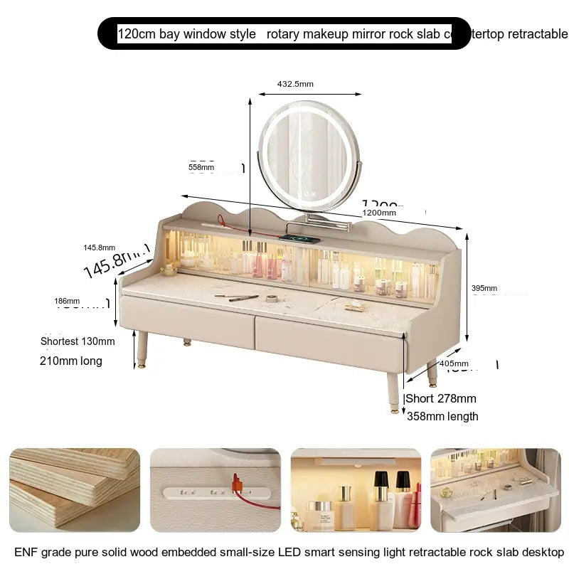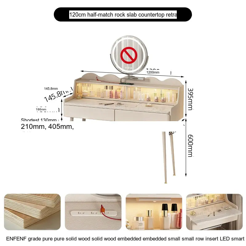 Designed with a frame structure to ensure stability, this makeup table provides both elegance and strength. Every element of the makeup table, from the solid wood to the stone slab, has been chosen for its quality. With a ten-year warranty on the wood, you can trust that your investment in this luxury vanity table will stand the test of time.