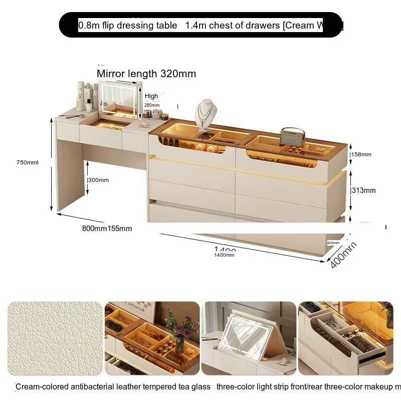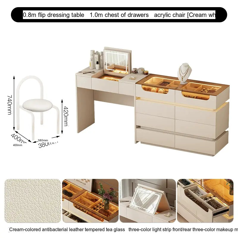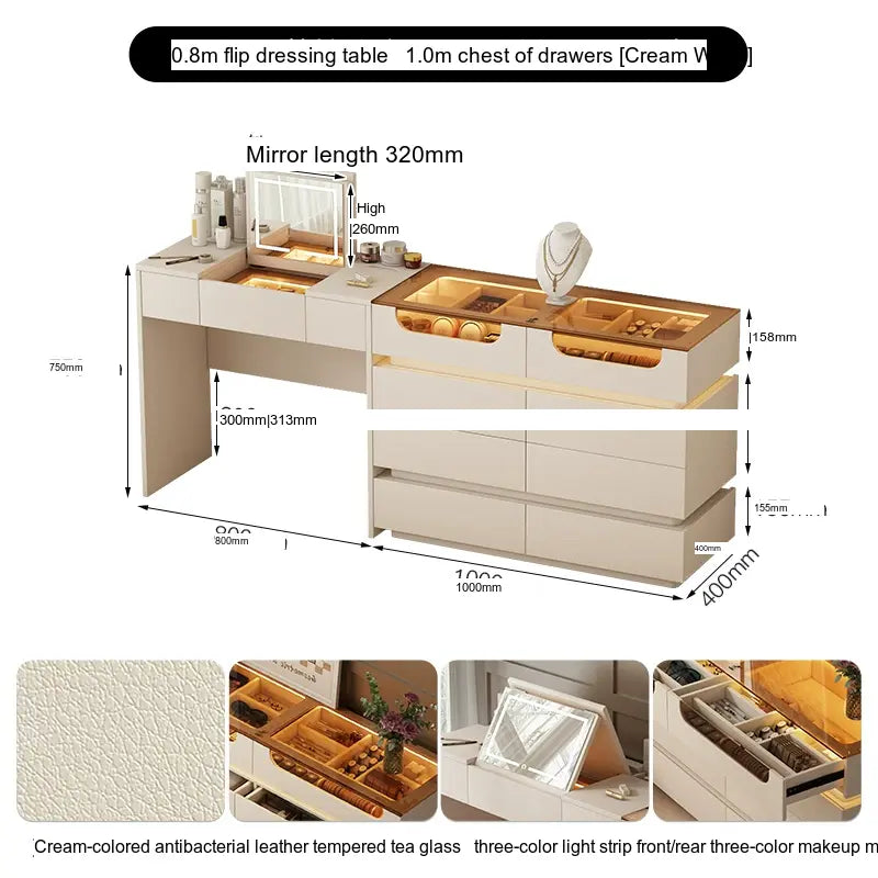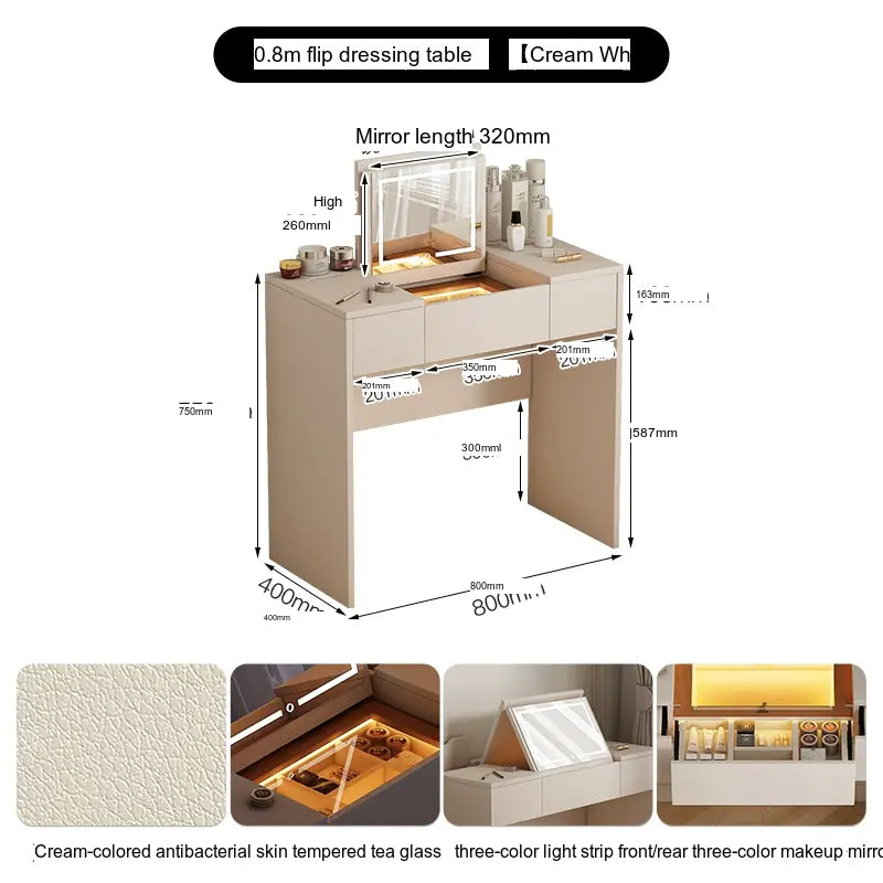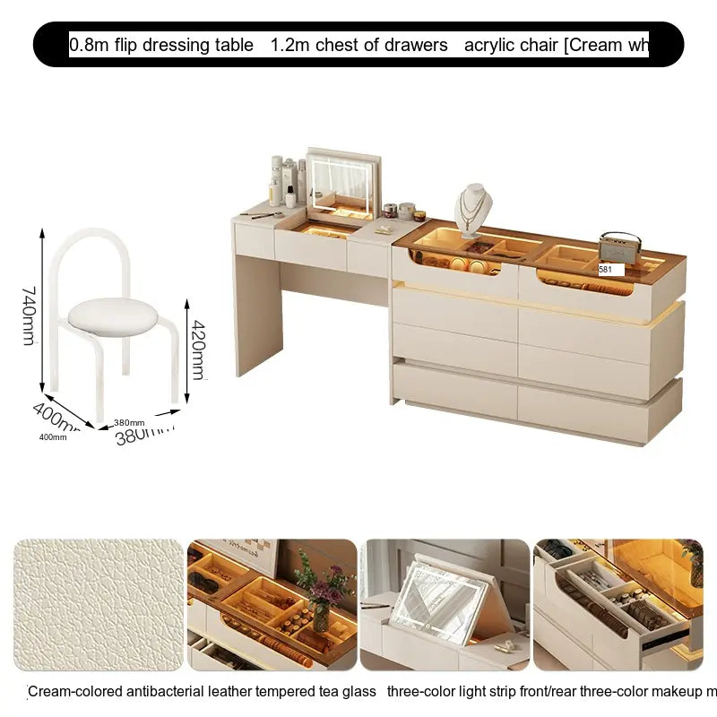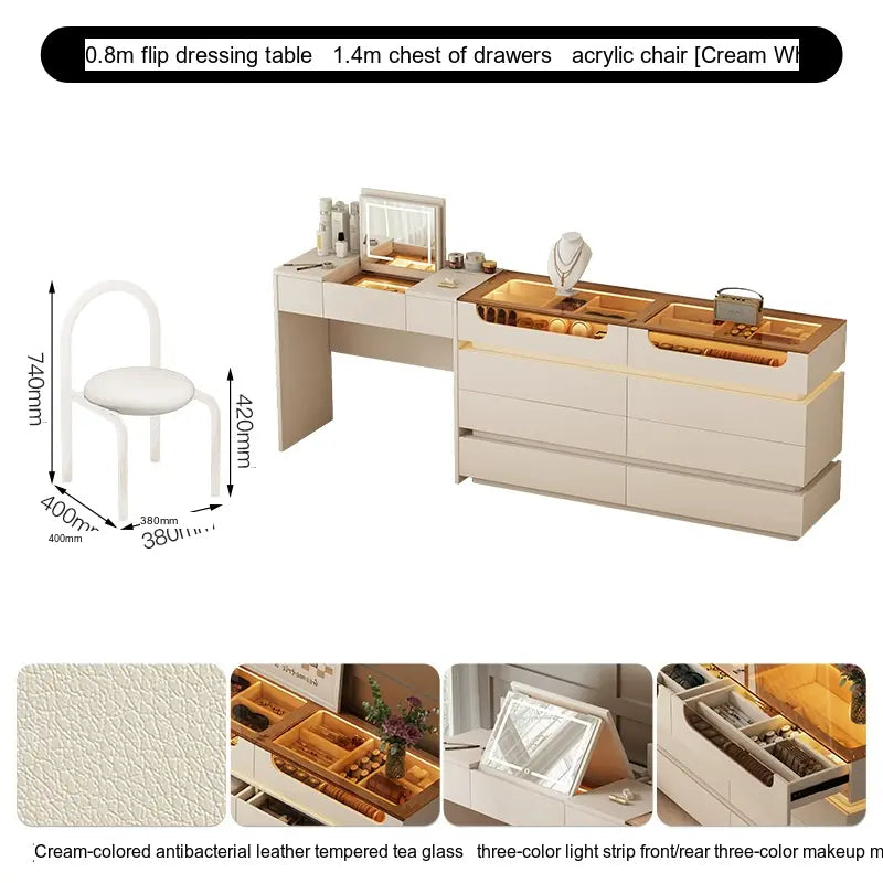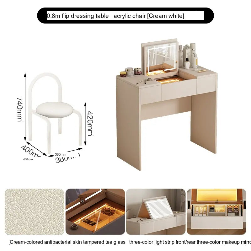 This dressing table comes with varied size options, allowing you to choose the one that best fits your space. With versions available in 0.8m, 1.0m, 1.2m, and 1.4m, you can easily find the perfect match for your room’s configuration. Each option incorporates a spacious layout designed for optimal storage, accommodating everything from makeup to accessories, maintaining an organized space that's easy to navigate.