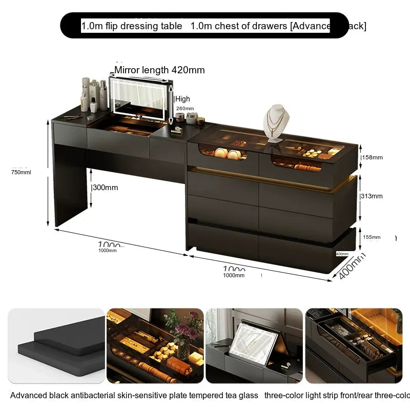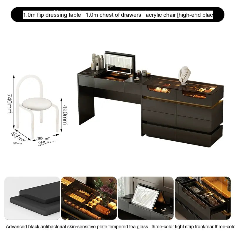 Aside from its elegant look, the dressing table features a stylish mirror that adds an extra layer of convenience allowing you to refine your look without hassle. The additional LED touch lighting provides adjustable brightness levels to suit your makeup needs, ensuring you have the right illumination at all times. The mirrors are designed to be both functional and sophisticated, further enhancing the luxurious atmosphere of your dressing area.