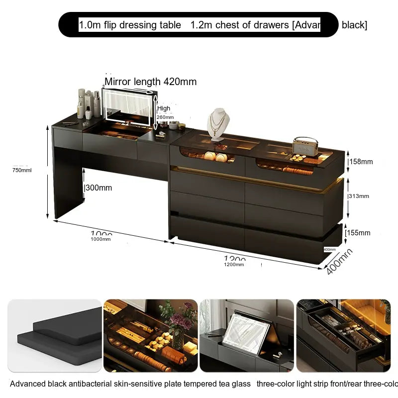 Crafted in the vibrant city of Huizhou, within Guangdong Province, this dressing table exemplifies luxury and sophistication. It is made to order, assuring that each piece meets our exacting quality standards. The minimalist frame structure combines seamlessly with a decorative anti-bacterial rock slab surface, promoting both durability and hygiene. The innovative design emphasizes a flip-folding mechanism, making it easy to store and use in varying spaces while elegantly complementing any room layout.