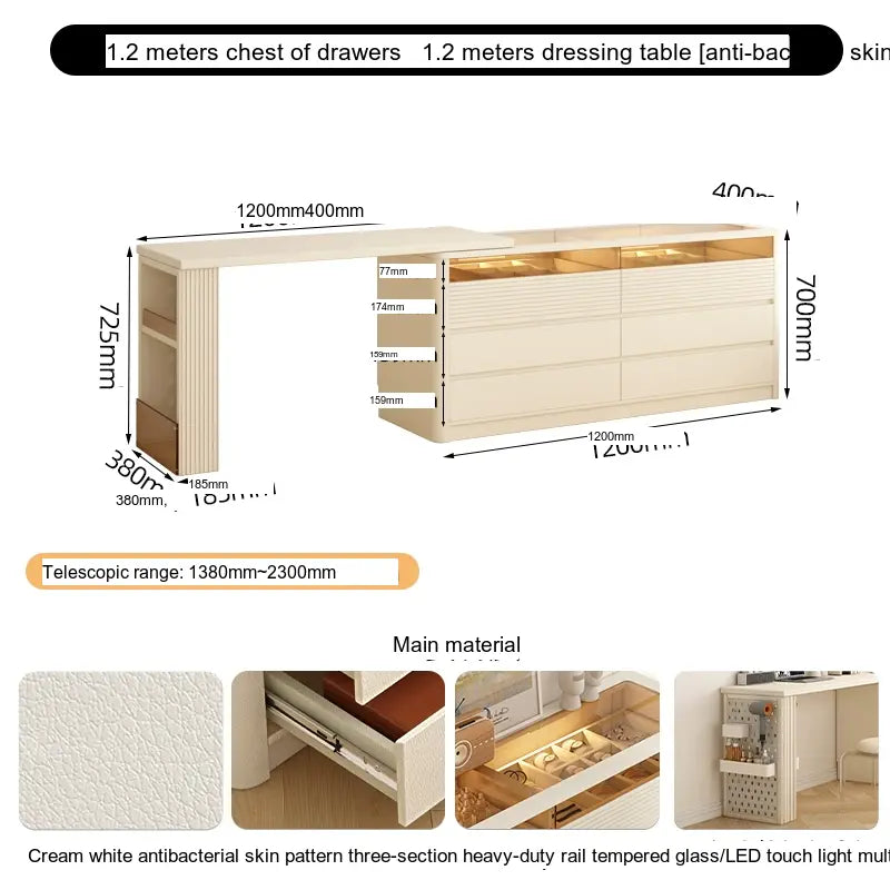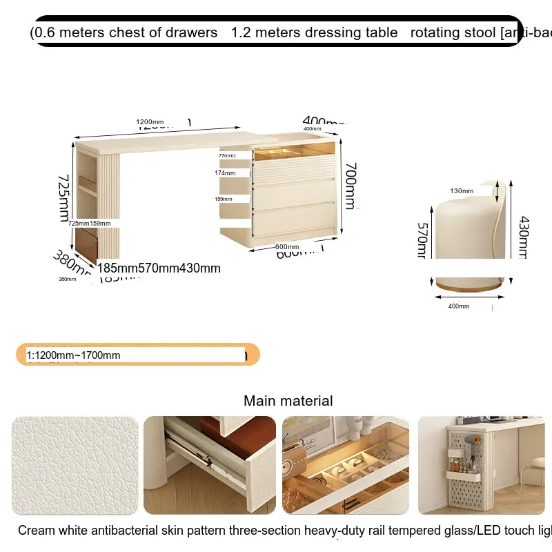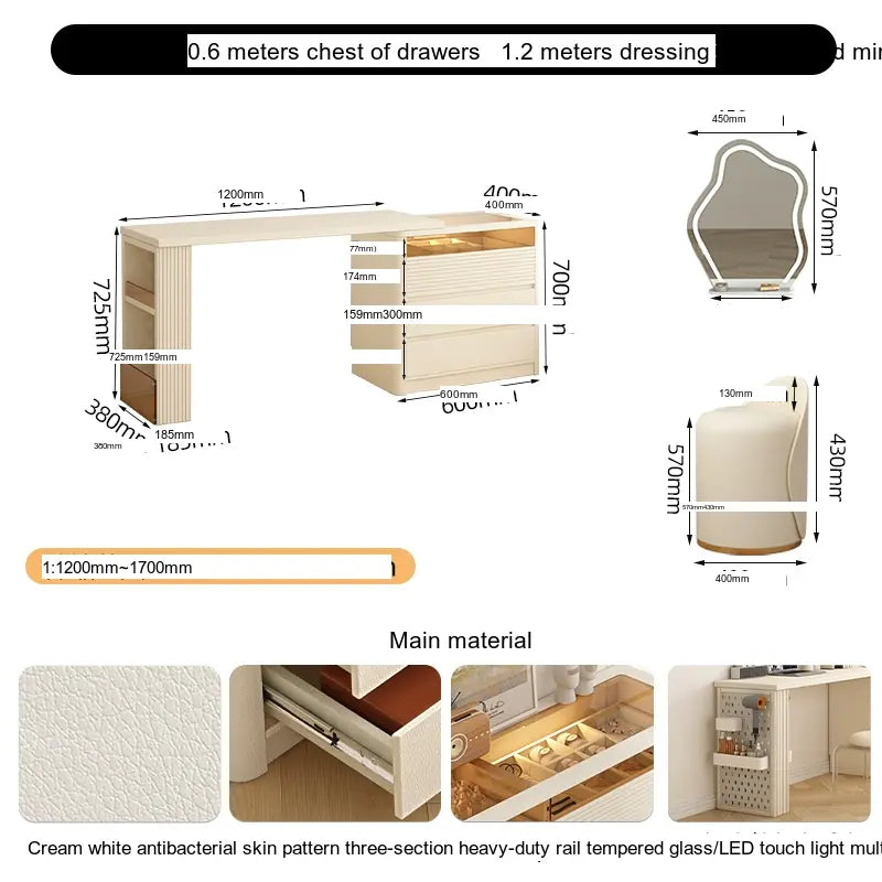 Crafted in the renowned Guangdong Province, the ZOSTON Isolde Dressing Table is a testament to quality and artistry. Every aspect of its design, from the robust frame to the lustrous surfaces, reflects meticulous craftsmanship. The table is made from anti-bacterial materials that mimic the luxurious feel of genuine leather while promoting a healthy living environment. This unique attribute makes it not only aesthetically pleasing but also a smart choice for your daily beauty regimen.