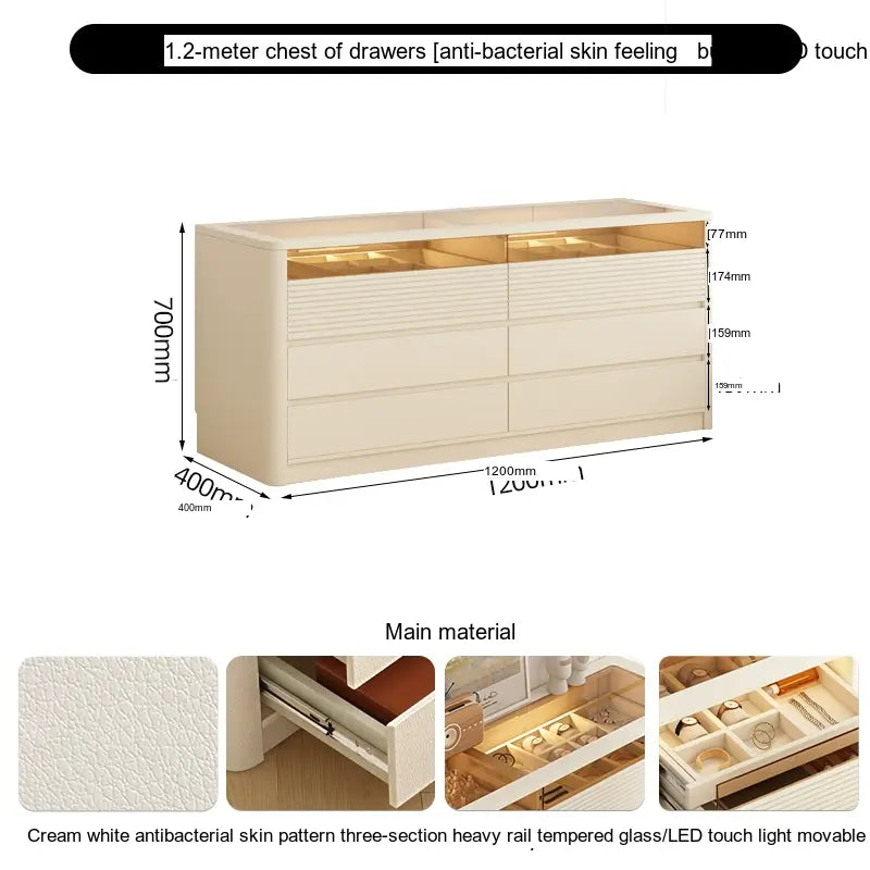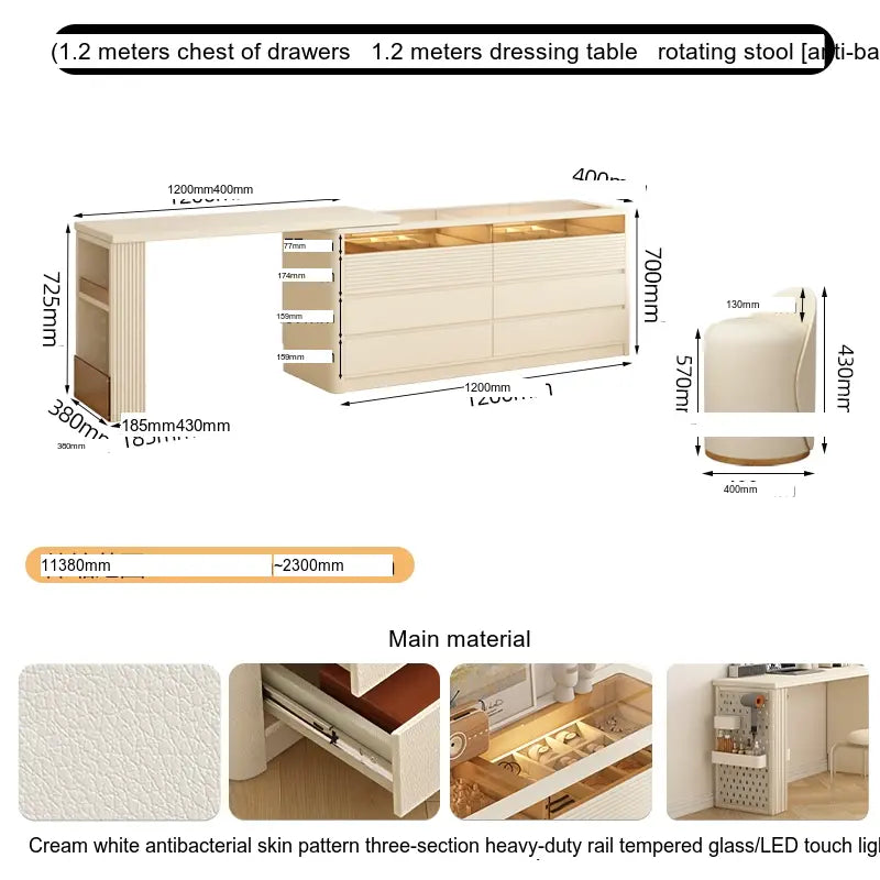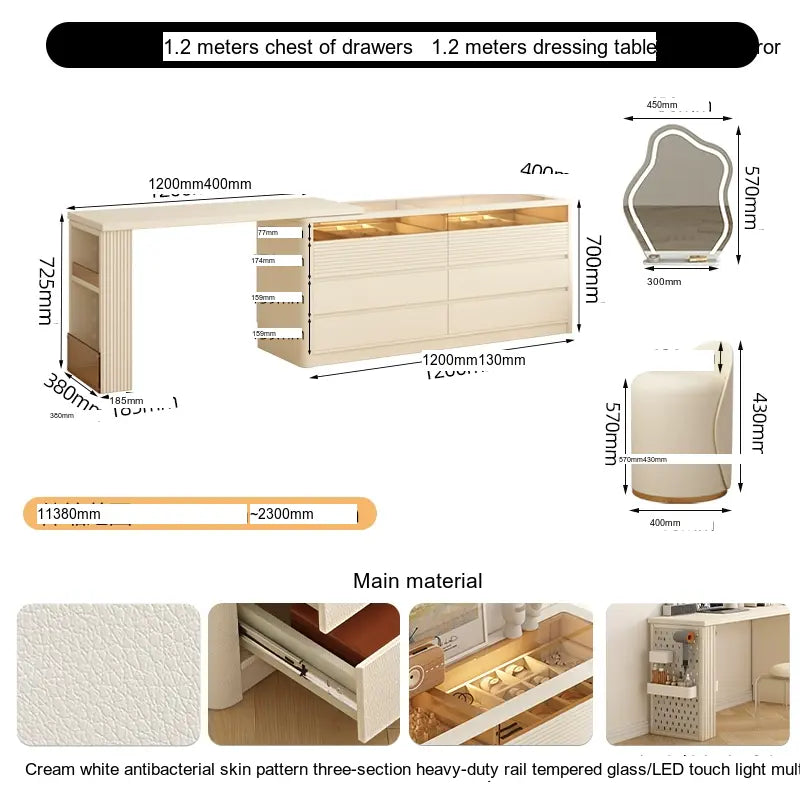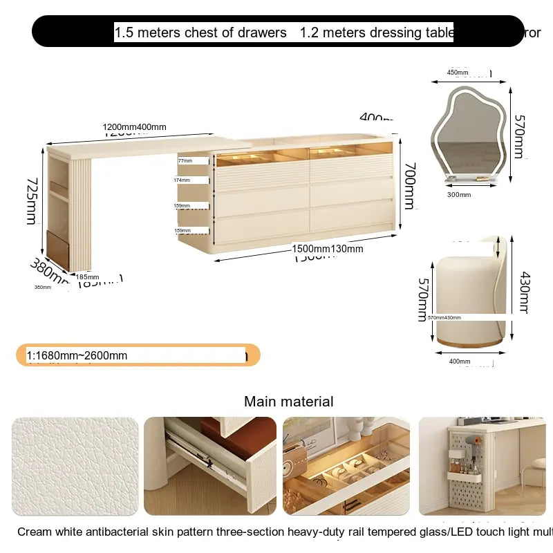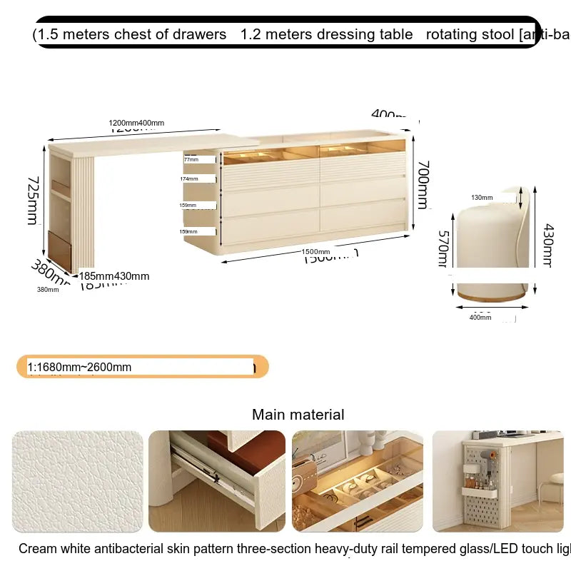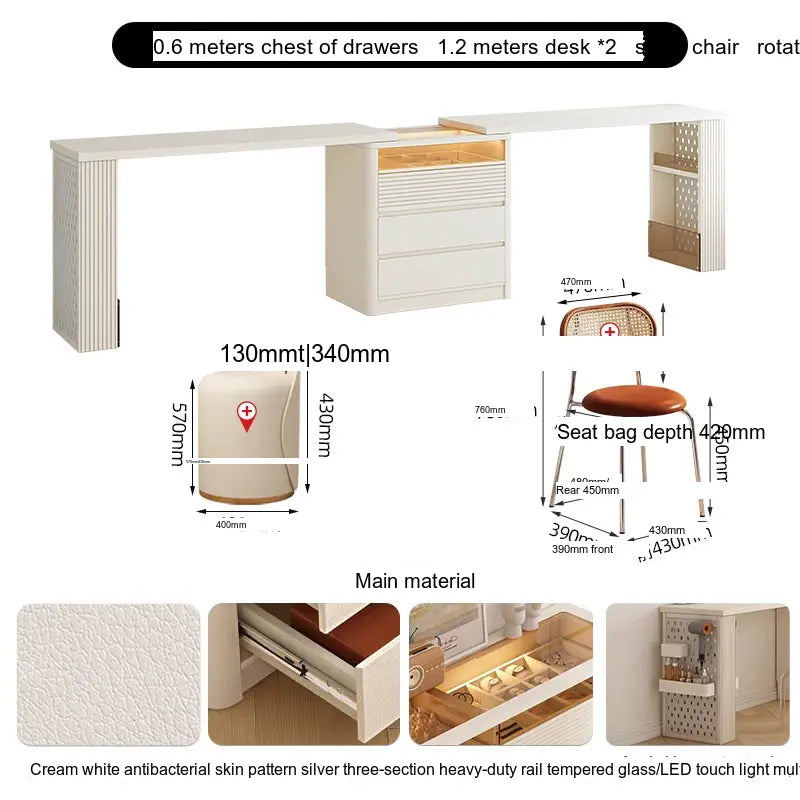 Designed for versatility, the ZOSTON Isolde offers a range of configurations to suit your unique needs. Opt for the compact 0.6m chest of drawers or go for the spacious 1.5m setup that comes with a coordinating dressing table. Its built-in LED touch lights provide effortless illumination for your makeup area, ensuring that you look your best in any lighting condition.