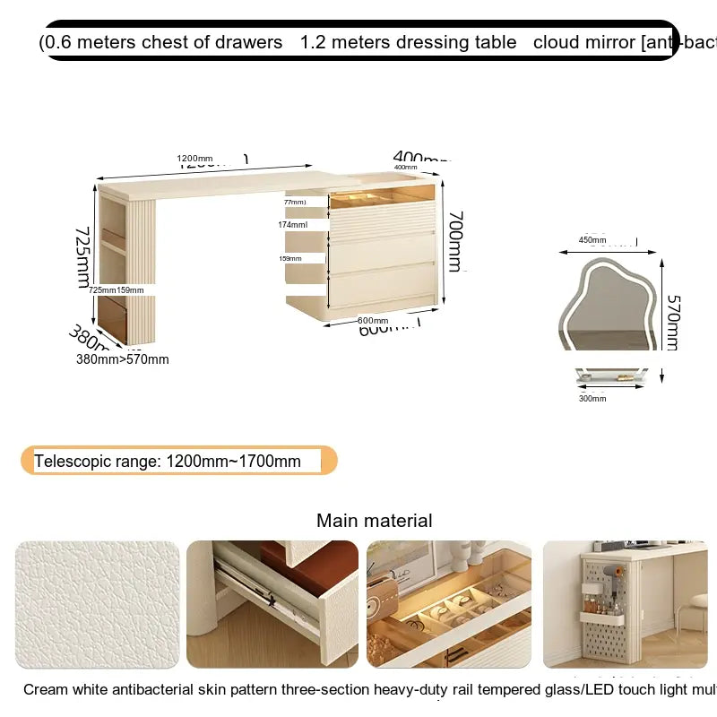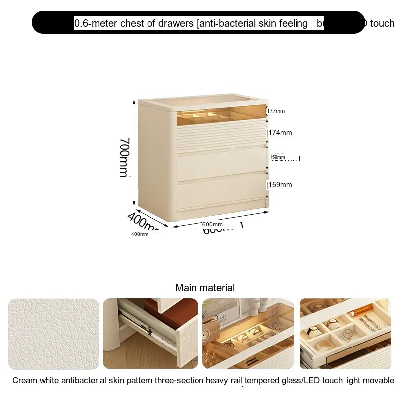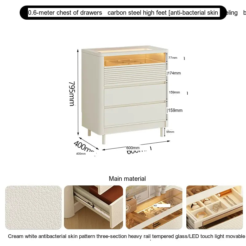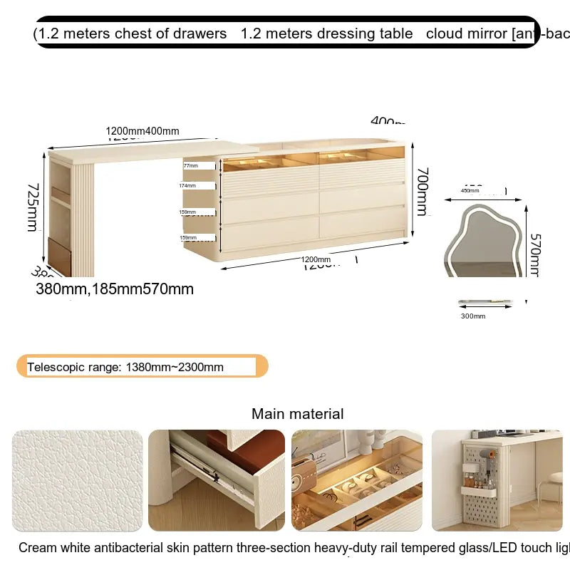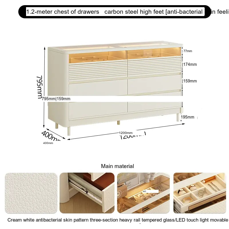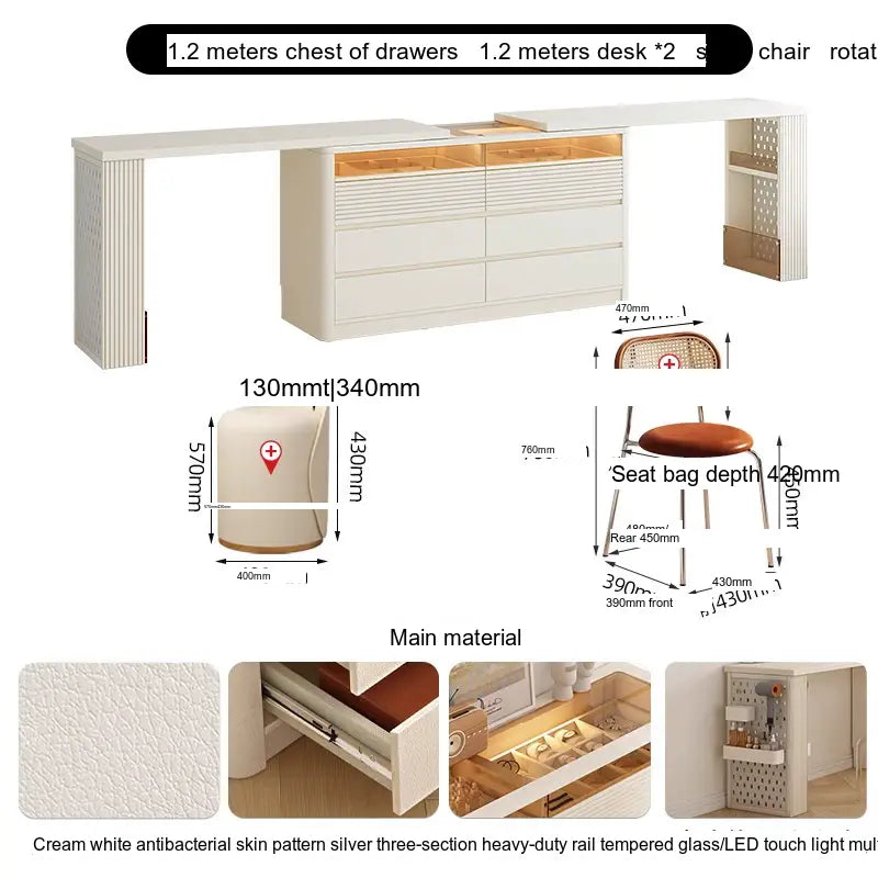 Designed for versatility, the ZOSTON Isolde offers a range of configurations to suit your unique needs. Opt for the compact 0.6m chest of drawers or go for the spacious 1.5m setup that comes with a coordinating dressing table. Its built-in LED touch lights provide effortless illumination for your makeup area, ensuring that you look your best in any lighting condition.