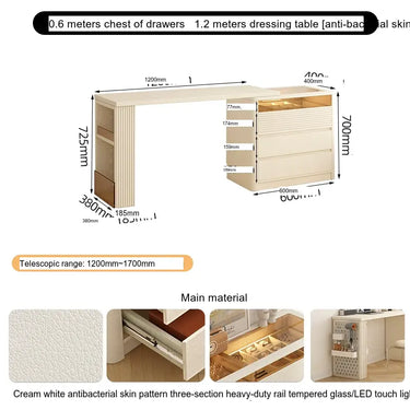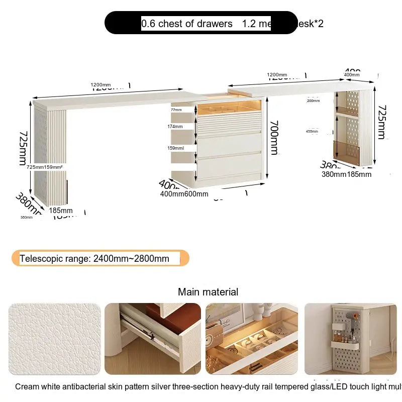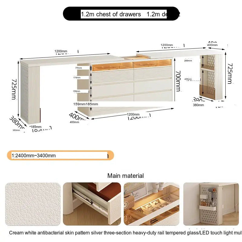 The spacious countertop of the ZOSTON Isolde is perfect for displaying your collection of skincare and beauty products. The innovative retractable design enables seamless integration into your room, making it suitable for both small apartments and larger spaces without compromising style or functionality. Additionally, the generous storage offered by six drawers ensures that you can keep your items organized and your tabletop clutter-free.