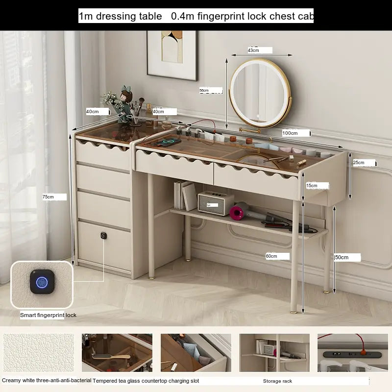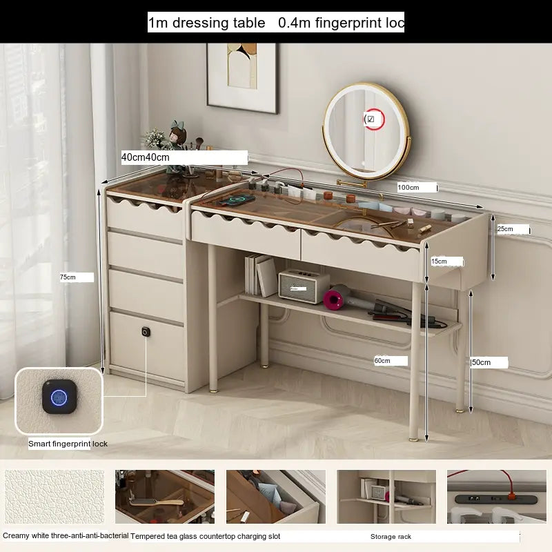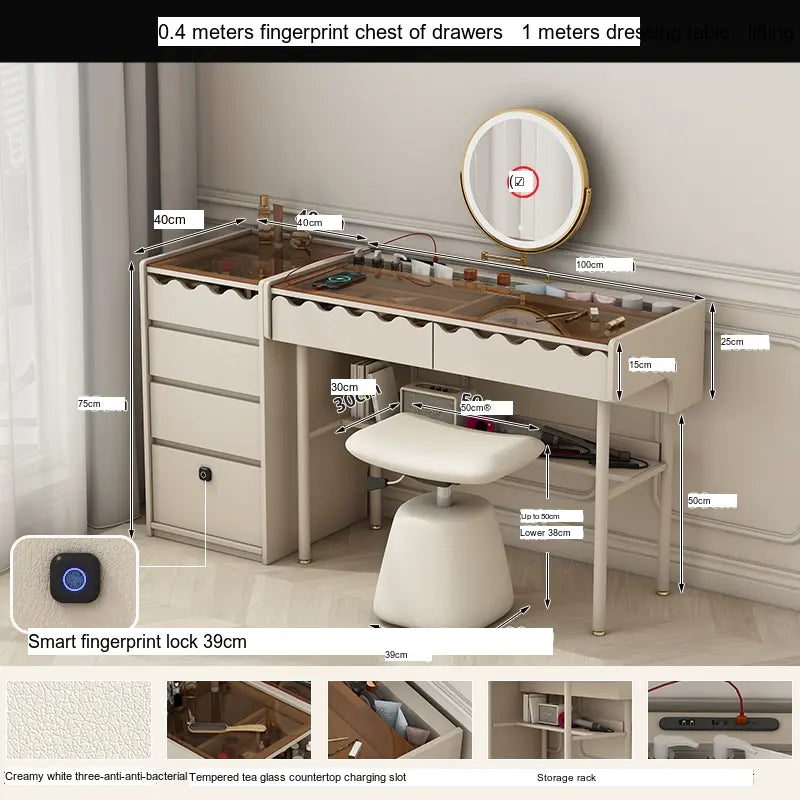 Storage will never be a concern with the ZOSTON Isolde. The dressing table features multiple drawers and compartments, allowing for seamless organization of your makeup, skincare products, and daily accessories. The integrated fingerprint lock adds an extra layer of security, ensuring that your personal items remain safe and secure. With options for pre-sale and customization, the ZOSTON table is designed to meet individual needs and preferences.