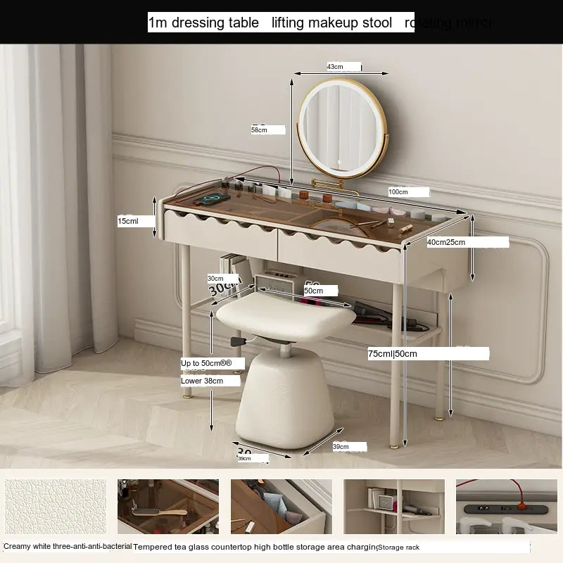 Designed in Huizhou, Guangdong Province, the dressing table stands out with its luxurious finish and high-quality materials. Made from an eco-friendly high-density fiberboard base, it boasts a three-proof antibacterial leather pattern board that is not only visually appealing but also functional. The surface is layered with advanced protection, ensuring it remains waterproof, anti-fouling, and resistant to mold, effectively maintaining cleanliness and hygiene in your space.