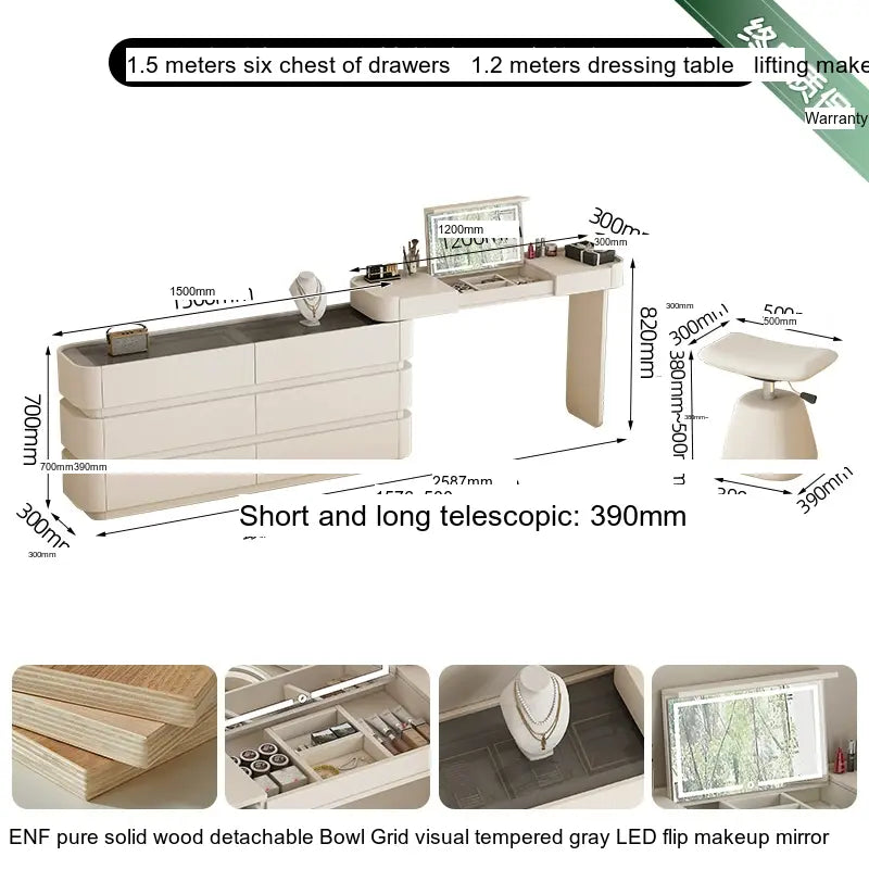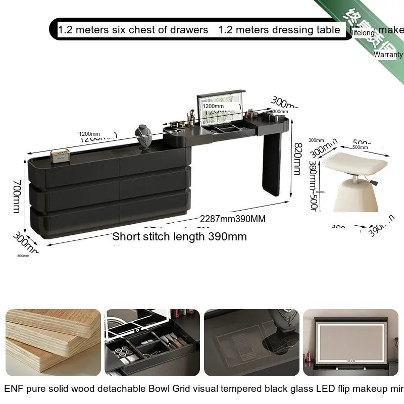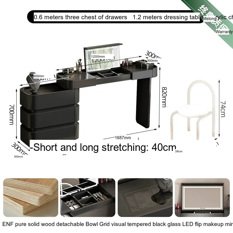 The makeup table is offered in several color classifications, including a refined cream white with tempered glass and a stylish minimal black with tempered glass, ensuring that it will fit seamlessly with your existing decor. Each variation has been crafted to suit diverse tastes, guaranteeing that you will find the perfect match for your home.