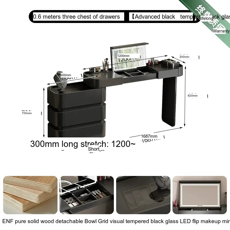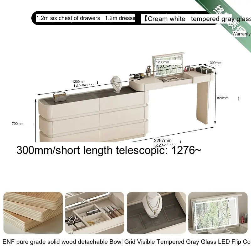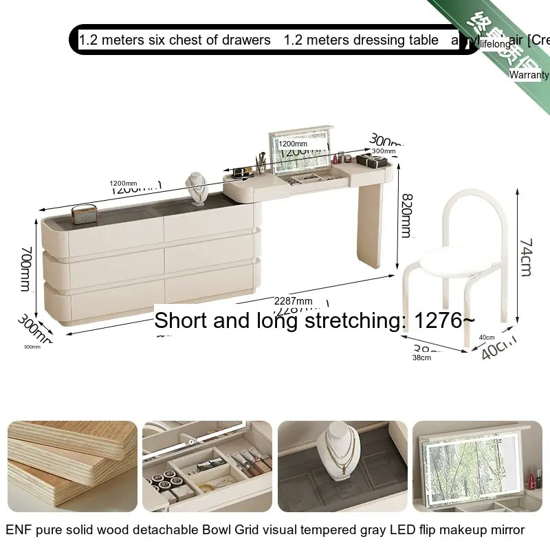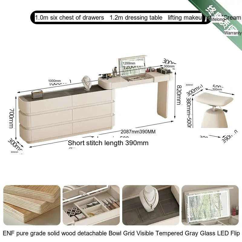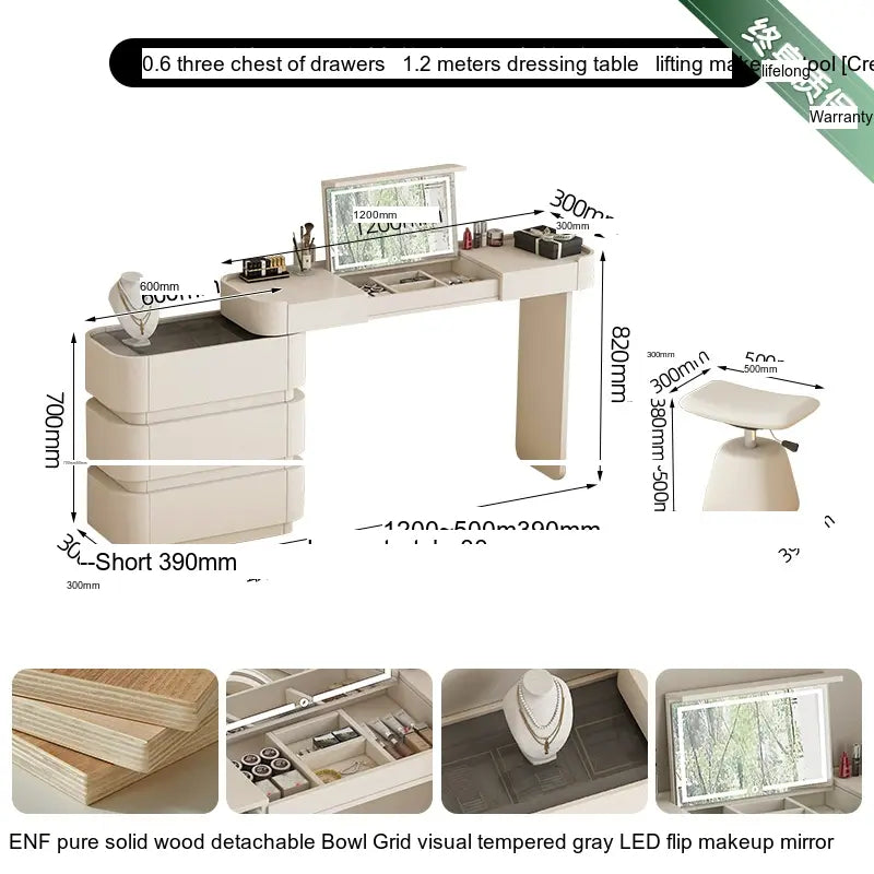 Crafted from ENF Pure Grade Solid Wood, the ZOSTON Lysandra dressing table exemplifies superior craftsmanship. This robust material ensures durability while maintaining an attractive appearance. Multi-layer solid wood boards are used to reinforce stability, making this dressing table a solid investment that promises longevity. The craftsmanship is evident in every detail, from its elegantly shaped legs to the meticulous finish, ensuring that it's not just furniture, but a work of art.