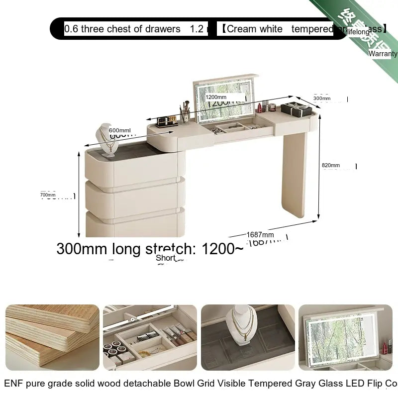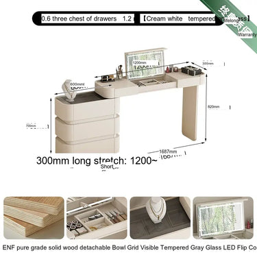 The ZOSTON Marisol dressing table is currently available for pre-sale, allowing you to secure your piece before it hits the market. Though customization options are limited, the existing color classifications offer stylish alternatives to fit various interior designs. Choose between cream white tempered gray glass and minimalist black tempered black glass.