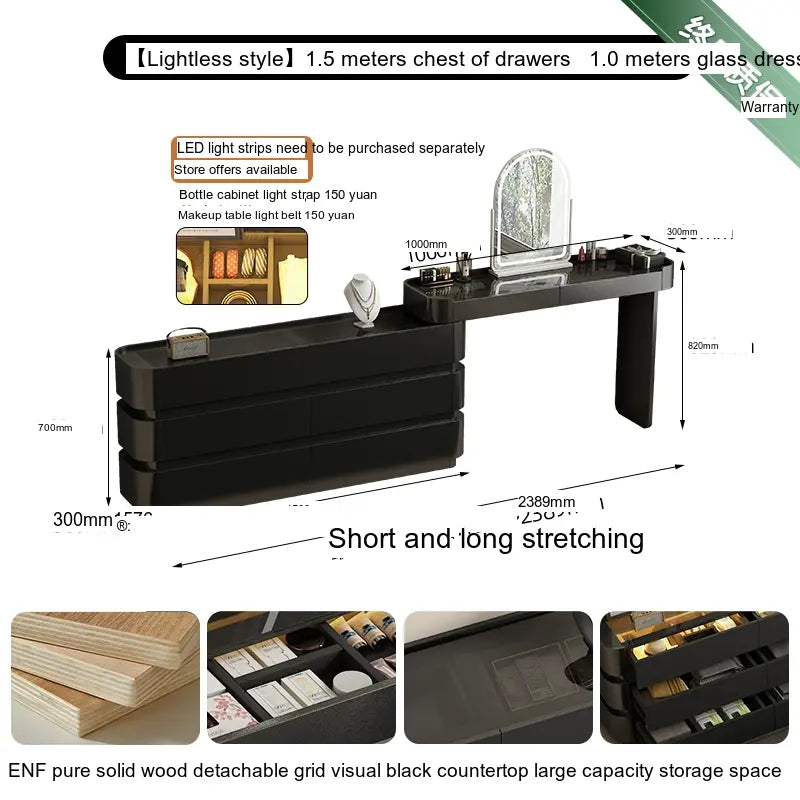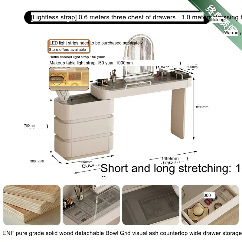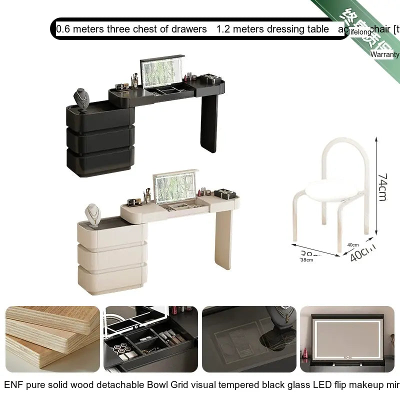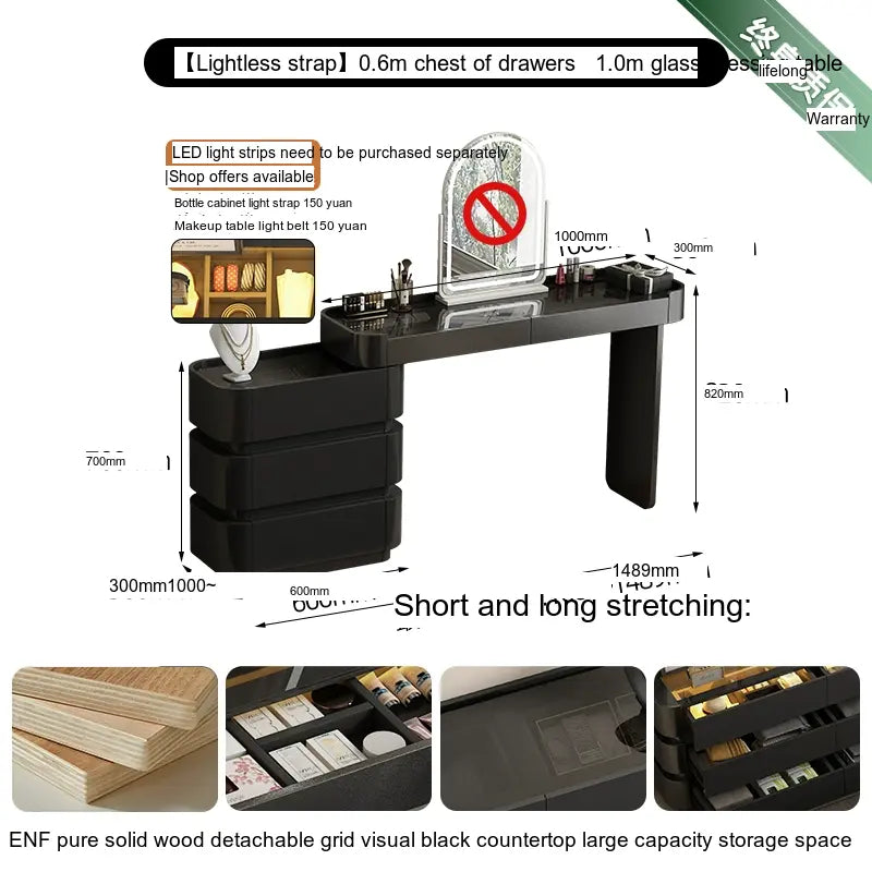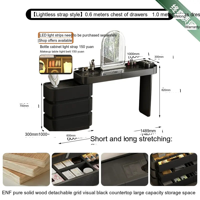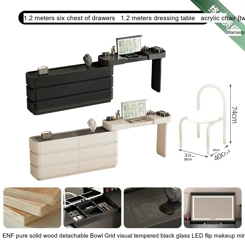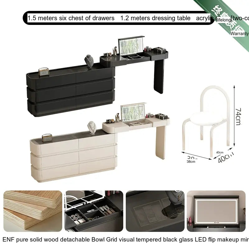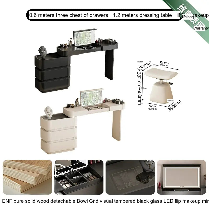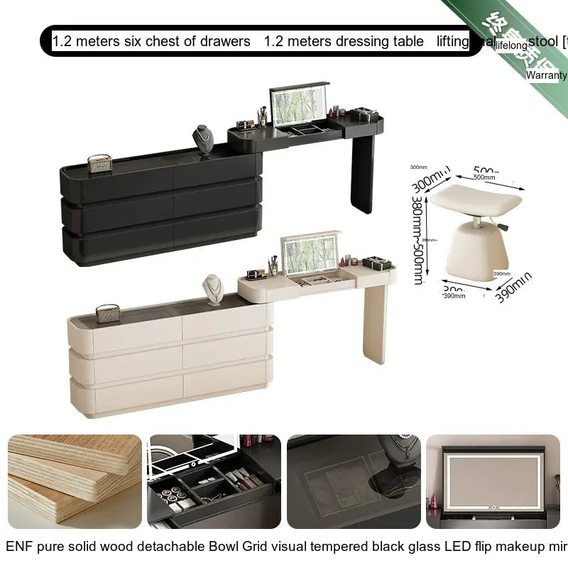 This dressing table offers ample storage with multiple configurations available. You can choose between two options of storage chest sizes: either the sleek 0.6m three chests of cabinets or the spacious 1.2m six chests of cabinets. Boasting a frame structure designed for longevity, this table is designed to cater to all your organizational needs while keeping your space tidy.