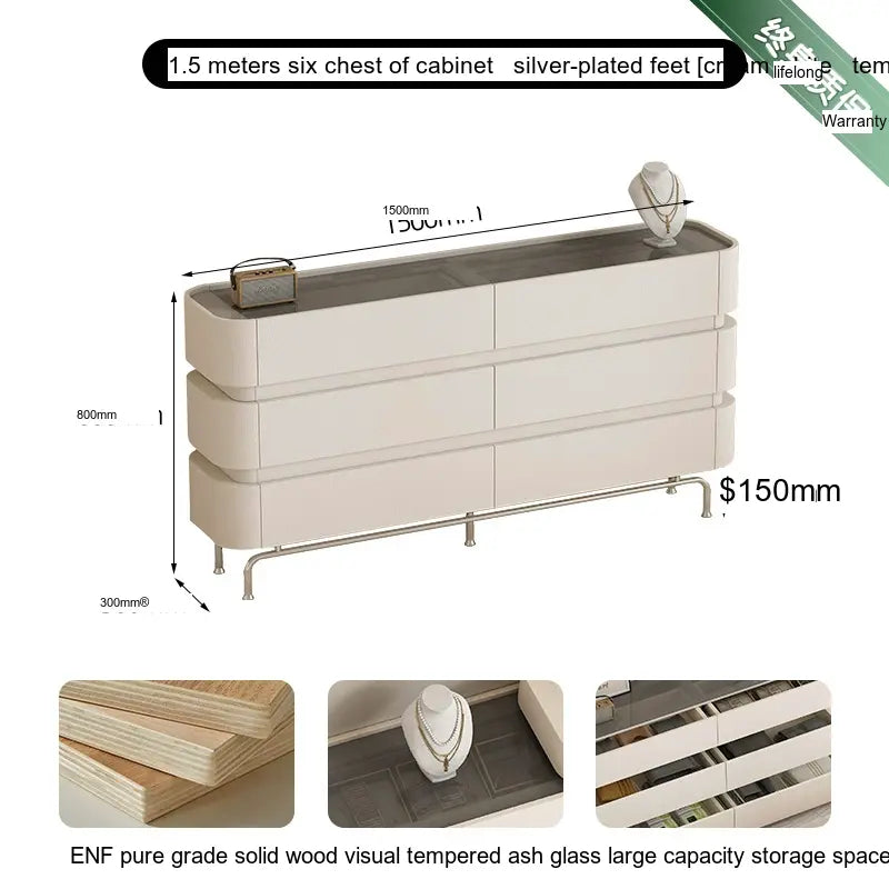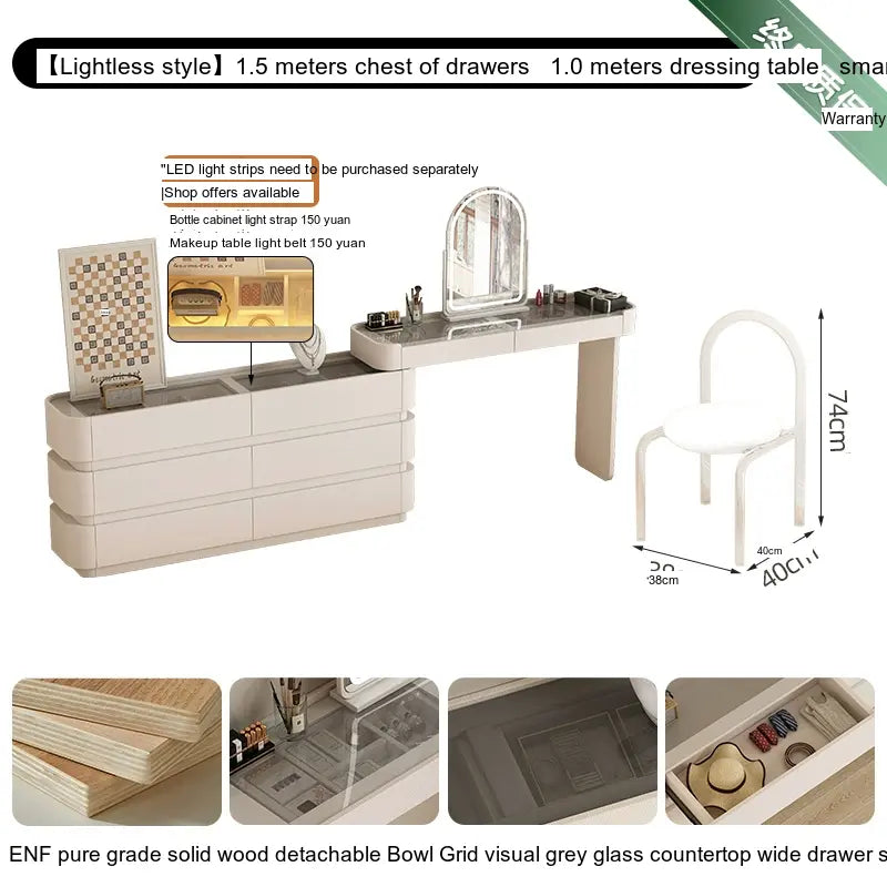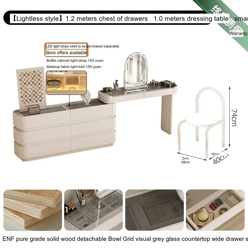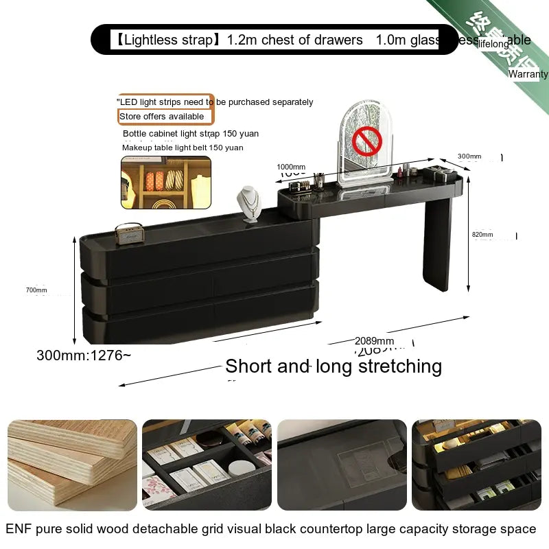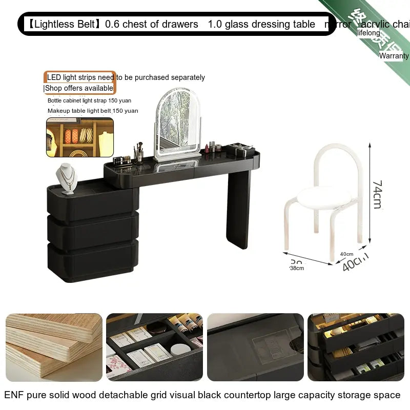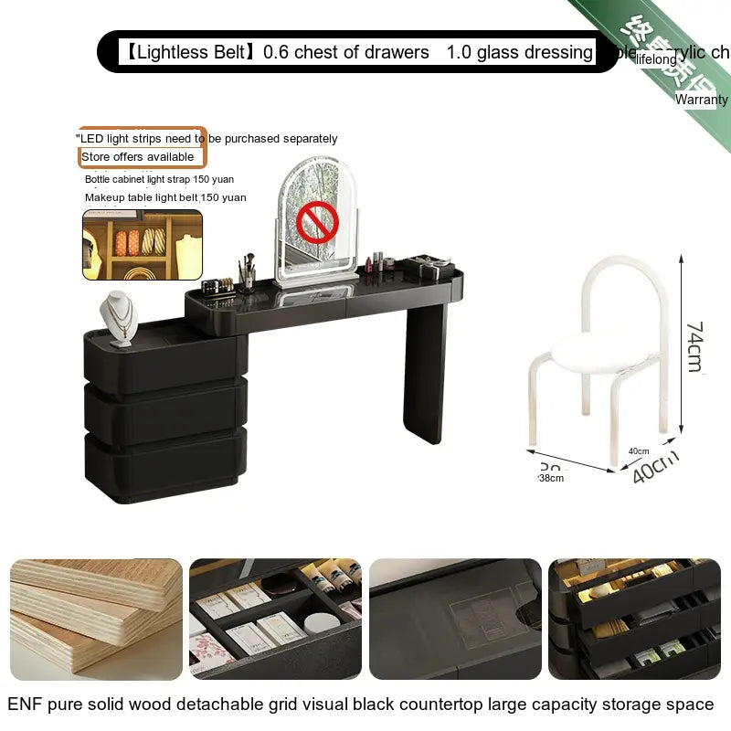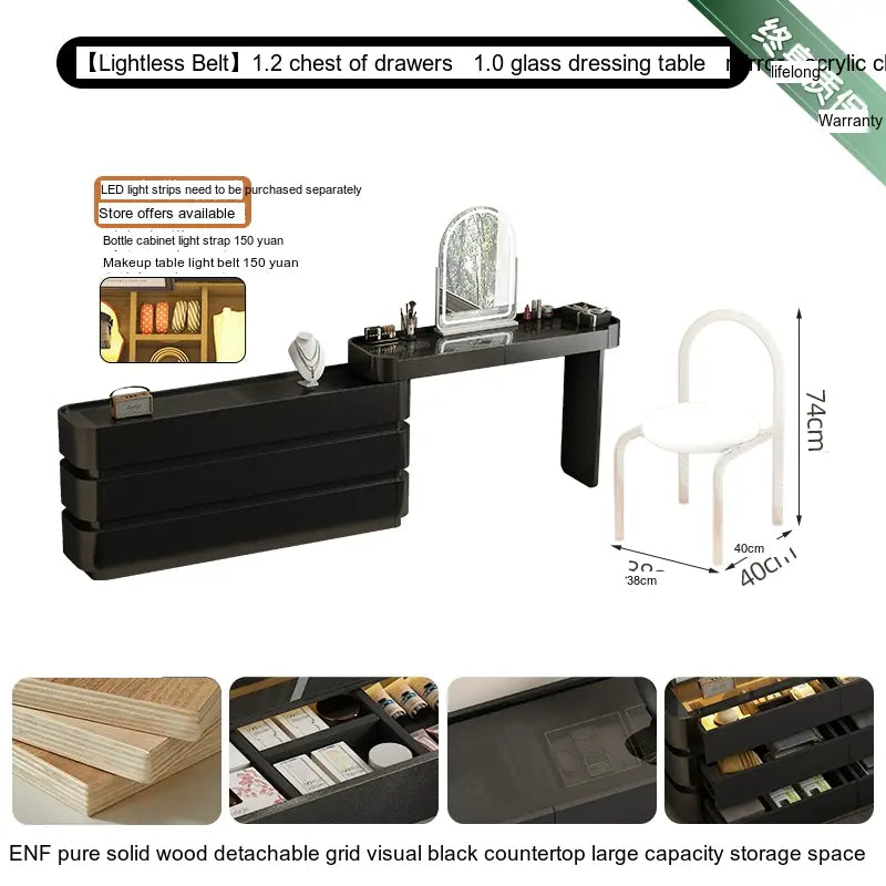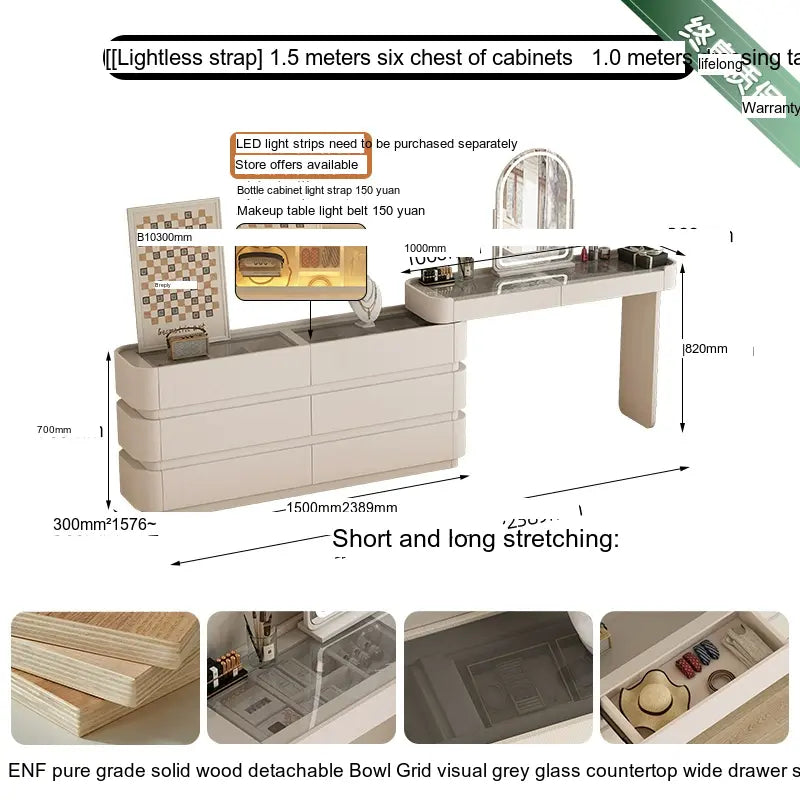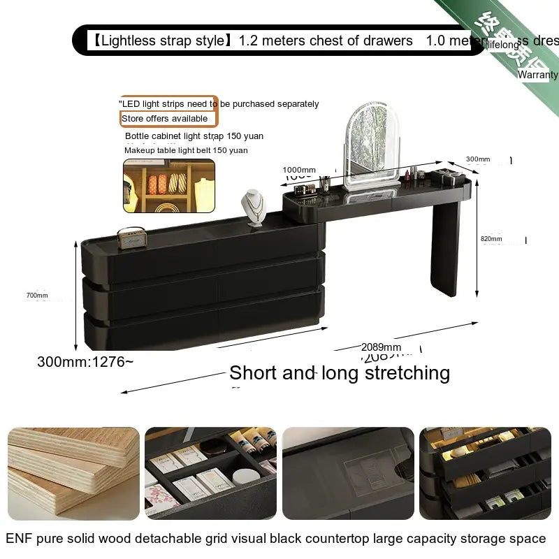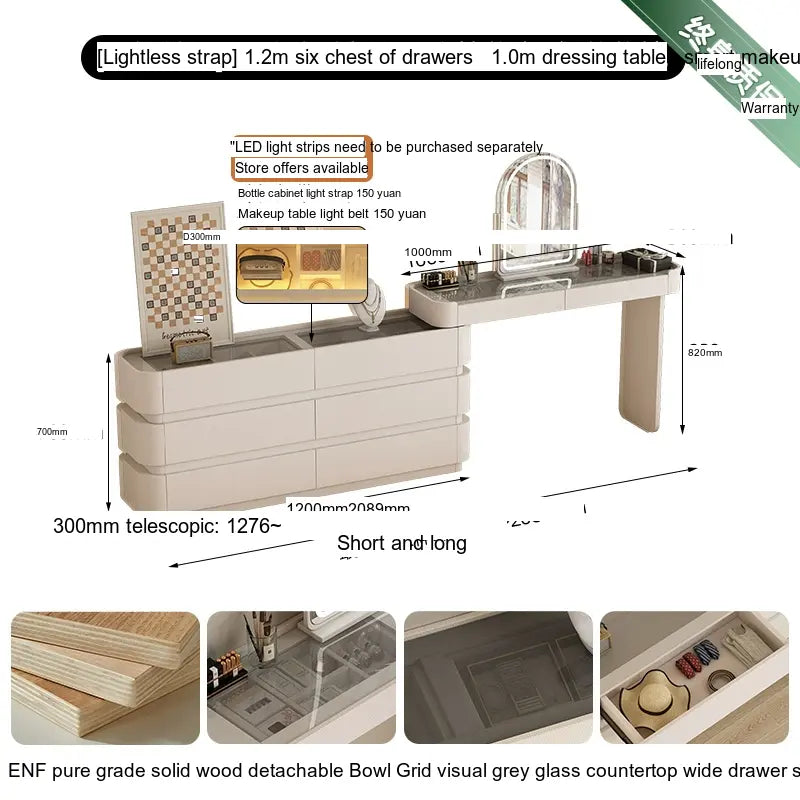 This dressing table offers ample storage with multiple configurations available. You can choose between two options of storage chest sizes: either the sleek 0.6m three chests of cabinets or the spacious 1.2m six chests of cabinets. Boasting a frame structure designed for longevity, this table is designed to cater to all your organizational needs while keeping your space tidy.