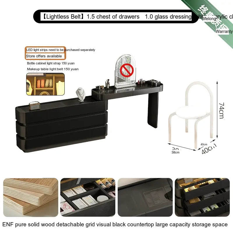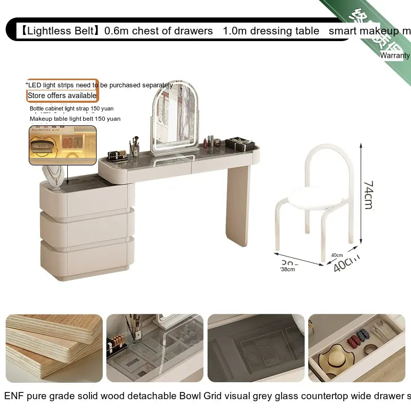 The table is not merely about storage; it also emphasizes aesthetics. The minimalist approach features a detachable mirror that offers a panoramic view, helping you perfect your look from every angle. The mirror is thoughtfully designed to be height-adjustable, ensuring comfort for users of various heights.