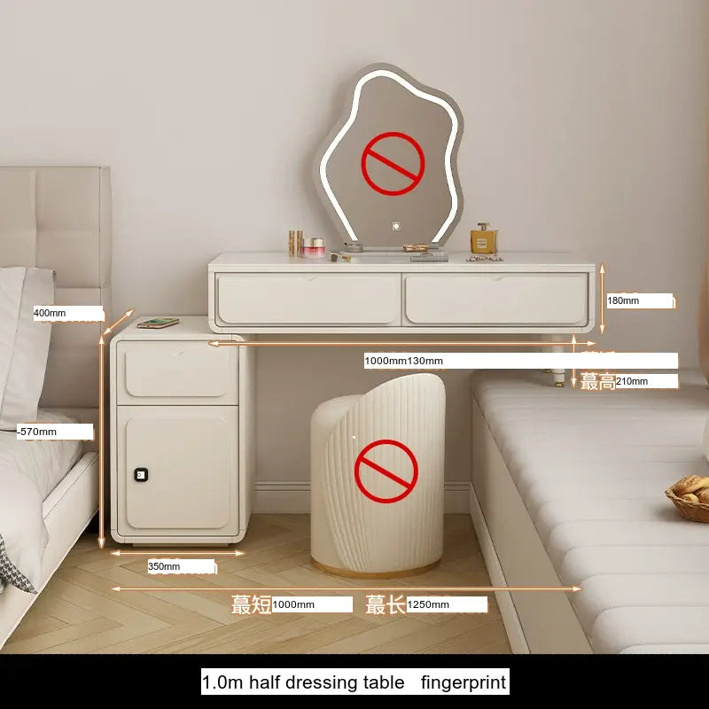 The Seraphina's sleek silhouette is characterized by clean, modern lines that exude sophistication. Constructed from a premium antibacterial rock plate, this makeup table is built to last while prioritizing hygiene and safety. Offering a remarkable ten-year warranty, the Seraphina ensures longevity against daily wear and tear. The rock slab countertop is not only resistant to high temperatures but also incredibly easy to clean, maintaining a fresh and pristine look for years to come. Moreover, an avant-garde fingerprint lock cabinet adds an element of security, safeguarding your valuable cosmetics and personal documents.