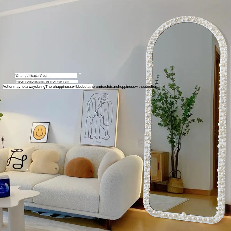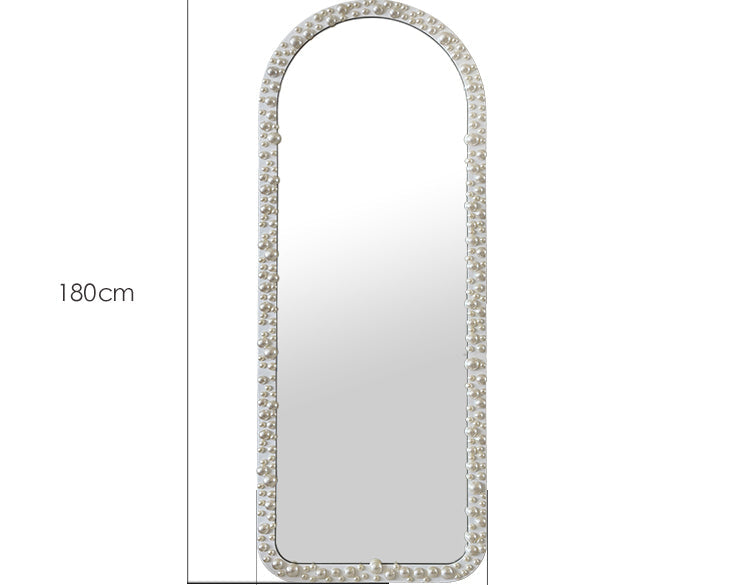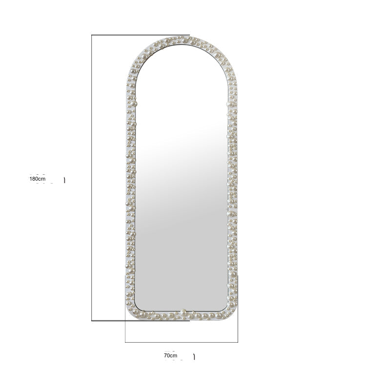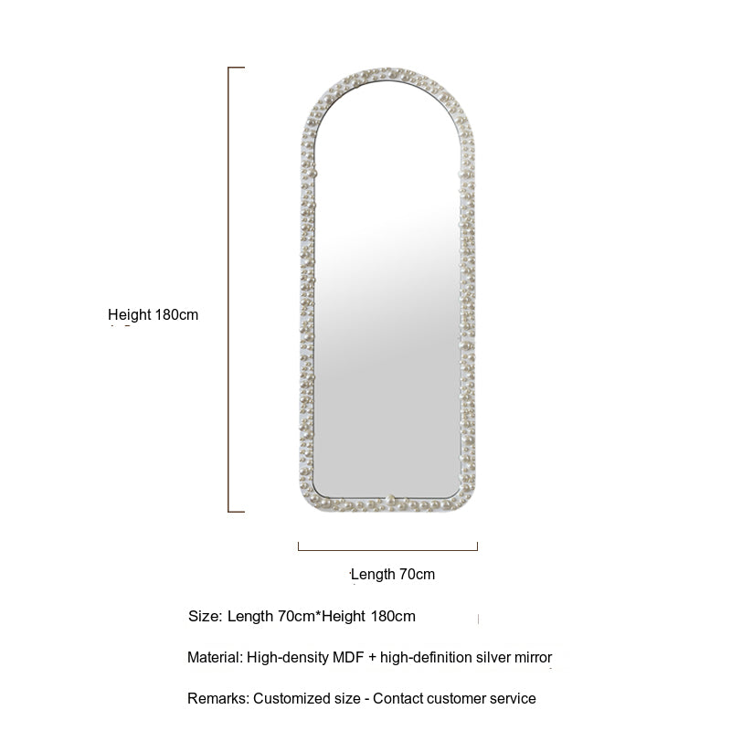 This full-length mirror features a unique special shape adorned with an elegant pearl frame design that creates a striking visual impact. The smooth curves and soft corners enhance safety, especially in households with children. Each piece is handmade, reflecting meticulous craftsmanship that stands the test of time.