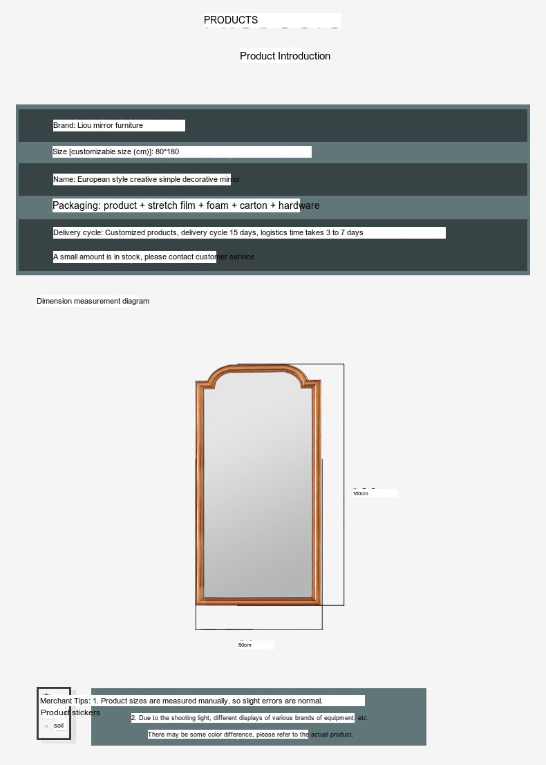Embodying the essence of European artistic style, this mirror is not just a functional item, but a statement piece that reflects your unique aesthetic. The mirror boasts a special shape, bringing a distinctive character to your space. Available in customizable sizes, you can choose the perfect fit for your home. With dimensions of either 80cm x 180cm or 100cm x 200cm, it fits seamlessly into various settings.