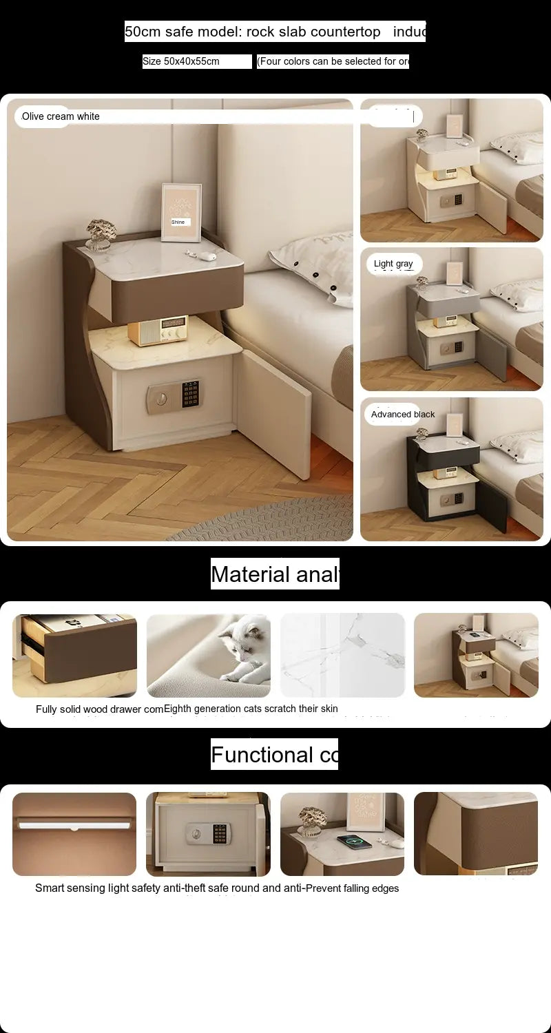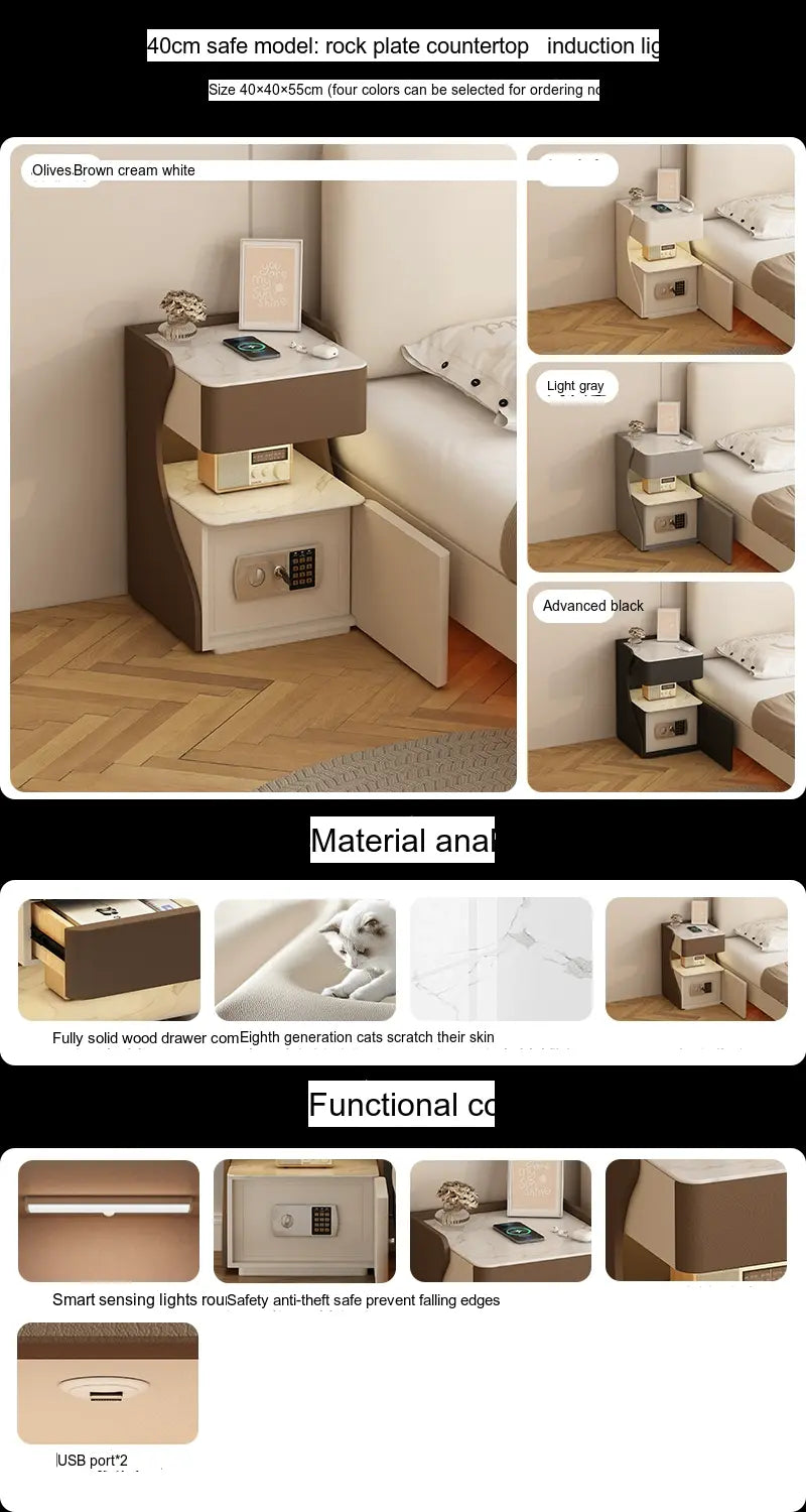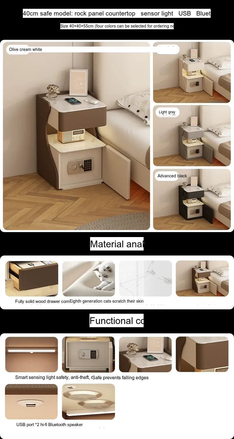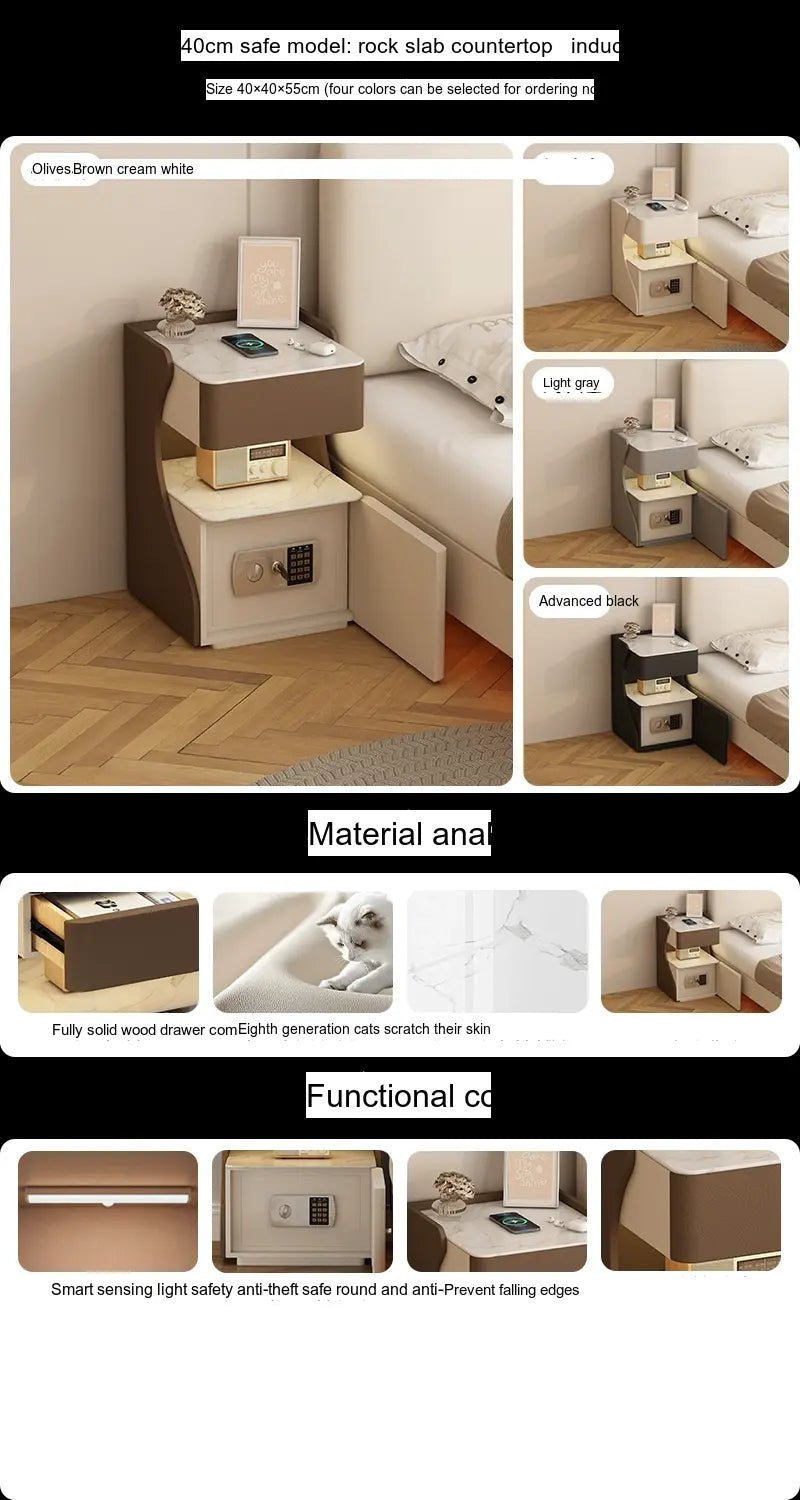 The nightstand is not just about security and tech, though. The upper surface is available in a choice of materials—featuring a high-quality antibacterial stone slab, which not only adds an elegant touch but also is easy to clean and maintain. It’s resistant to scratches, wear, and even high temperatures, making it a practical choice for everyday use. The eco-friendly substrate used in the cabinet body further complements the luxurious design, achieving a balance between beauty and sustainability.