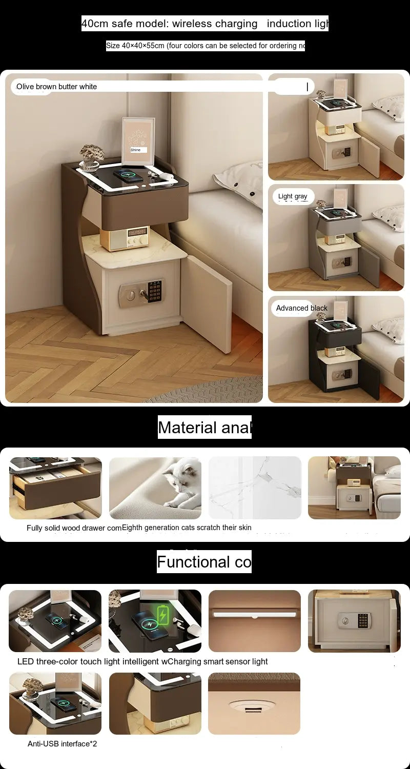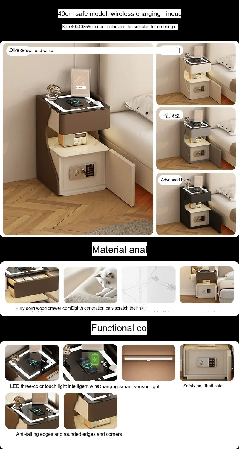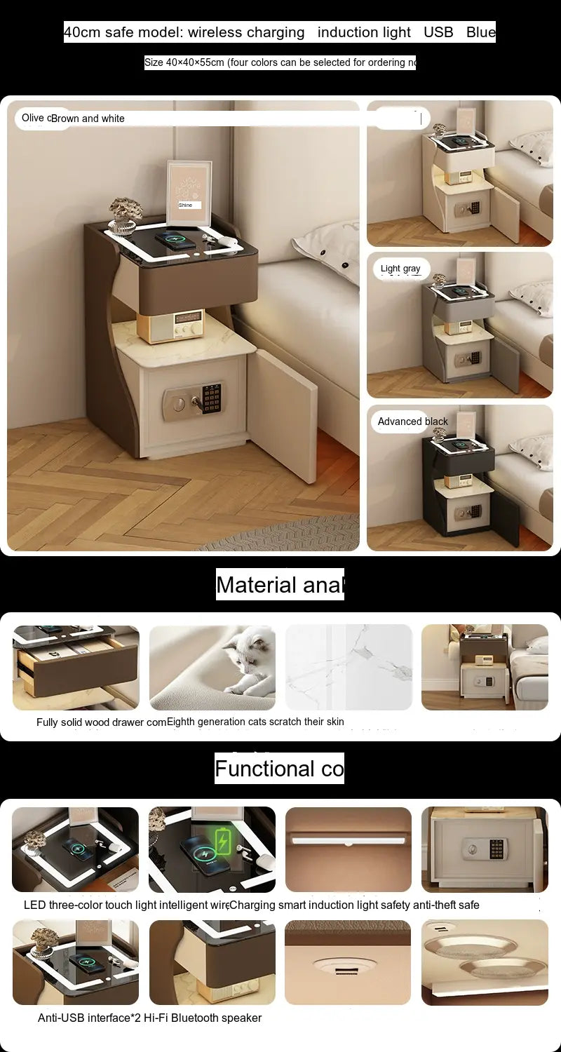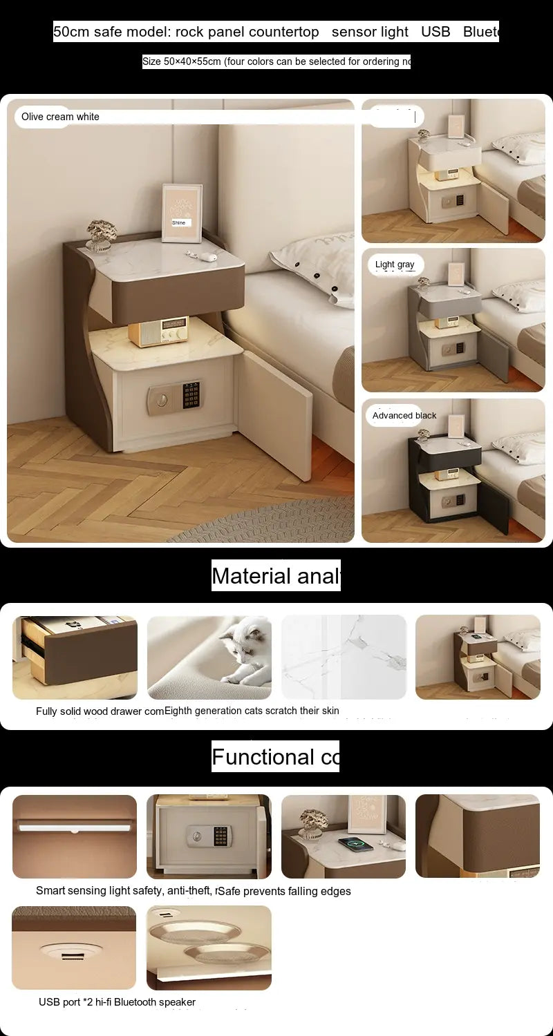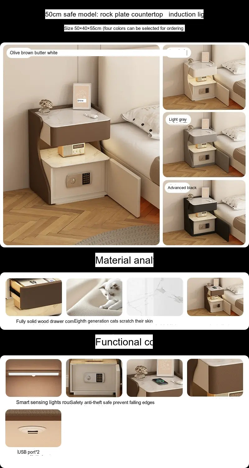 The nightstand is not just about security and tech, though. The upper surface is available in a choice of materials—featuring a high-quality antibacterial stone slab, which not only adds an elegant touch but also is easy to clean and maintain. It’s resistant to scratches, wear, and even high temperatures, making it a practical choice for everyday use. The eco-friendly substrate used in the cabinet body further complements the luxurious design, achieving a balance between beauty and sustainability.