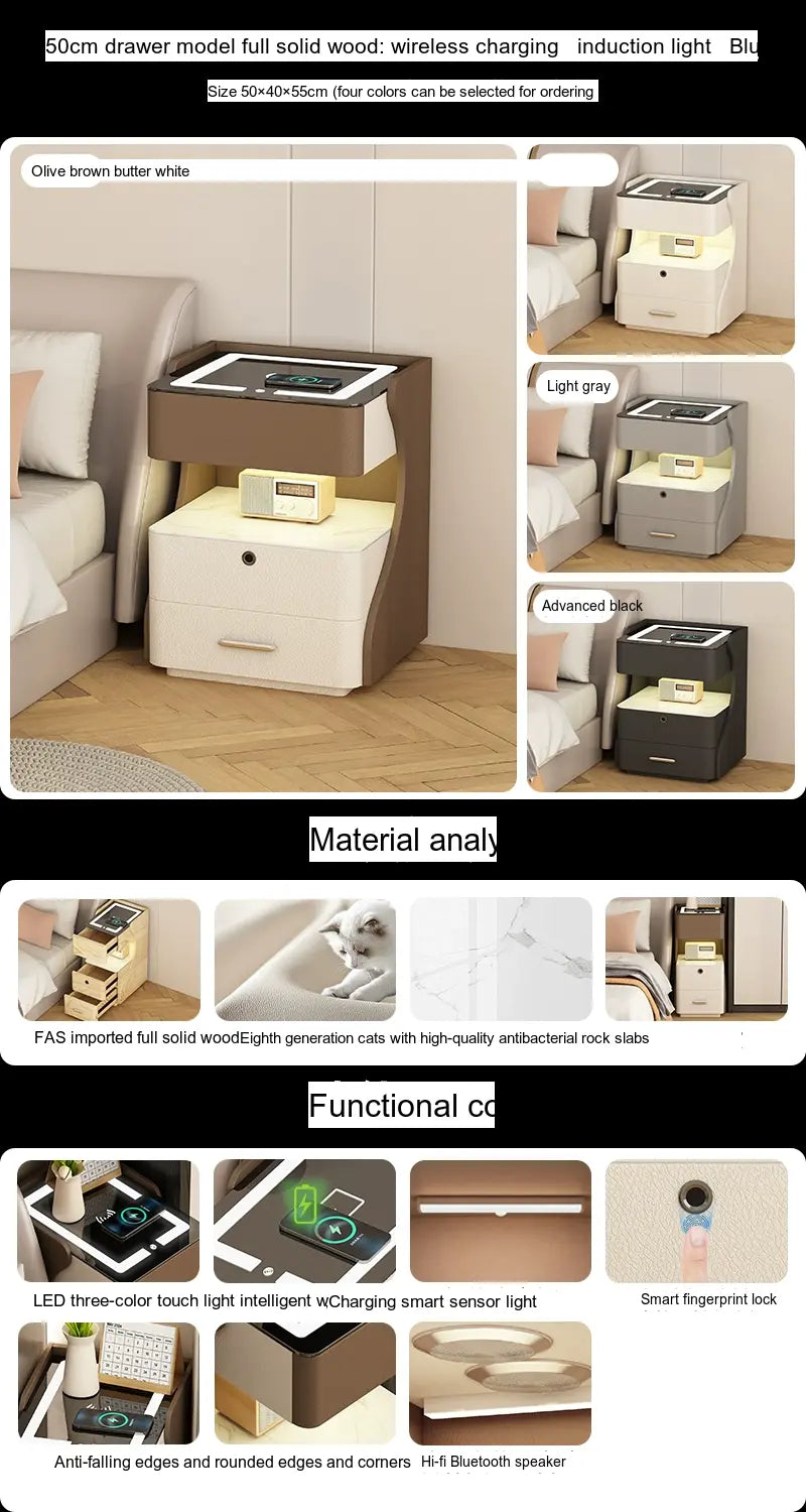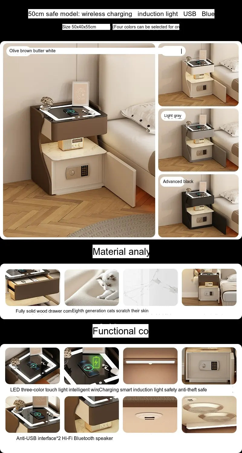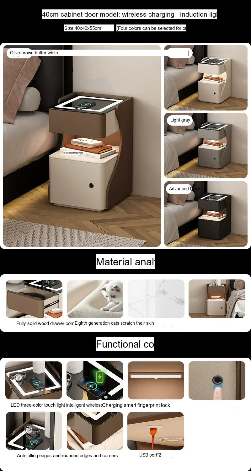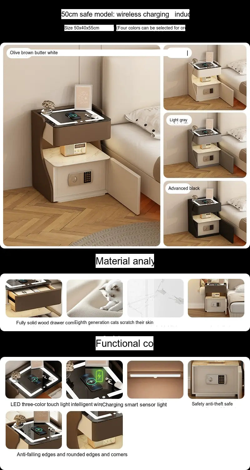 The nightstand is not just about security and tech, though. The upper surface is available in a choice of materials—featuring a high-quality antibacterial stone slab, which not only adds an elegant touch but also is easy to clean and maintain. It’s resistant to scratches, wear, and even high temperatures, making it a practical choice for everyday use. The eco-friendly substrate used in the cabinet body further complements the luxurious design, achieving a balance between beauty and sustainability.
