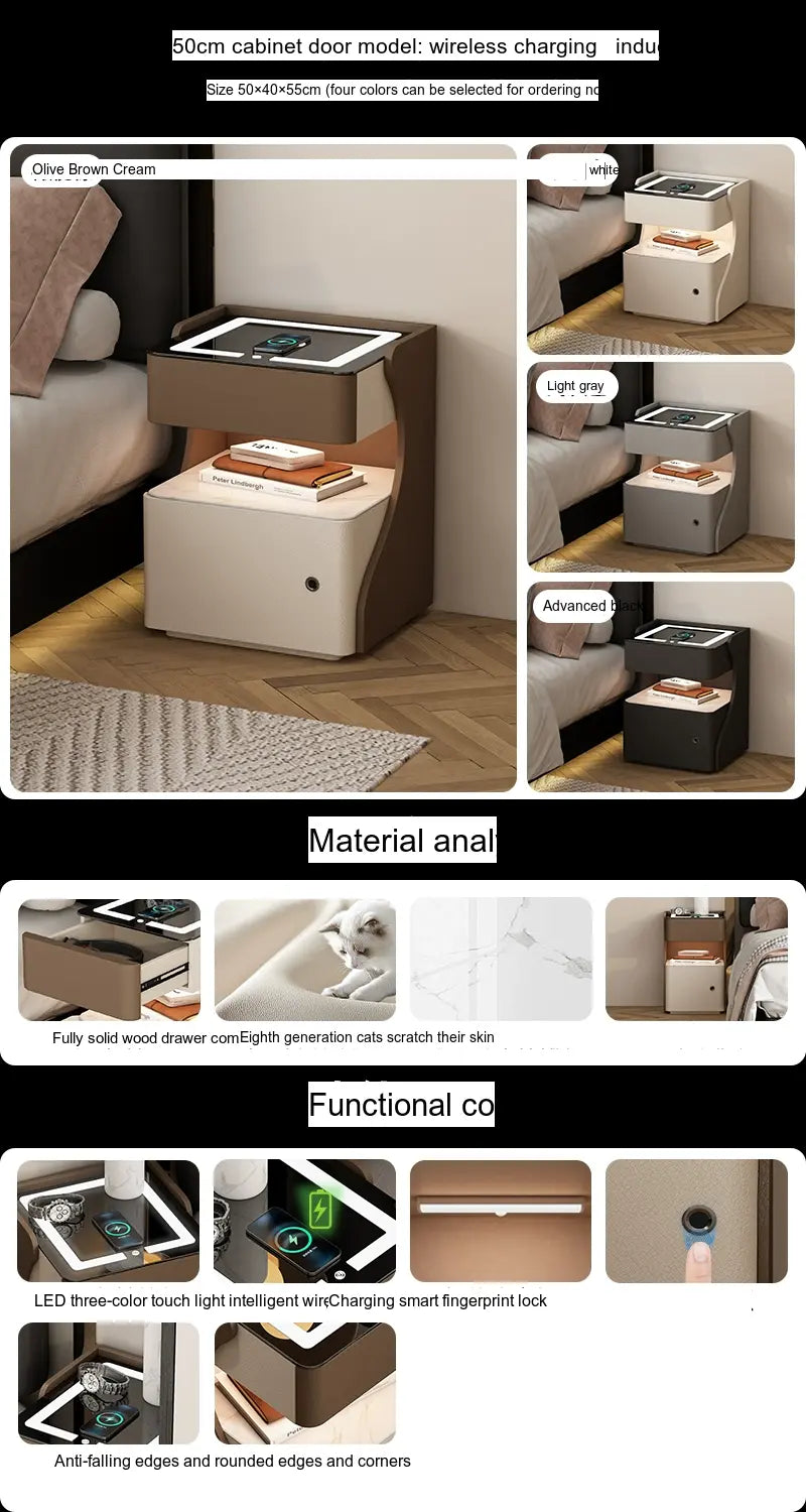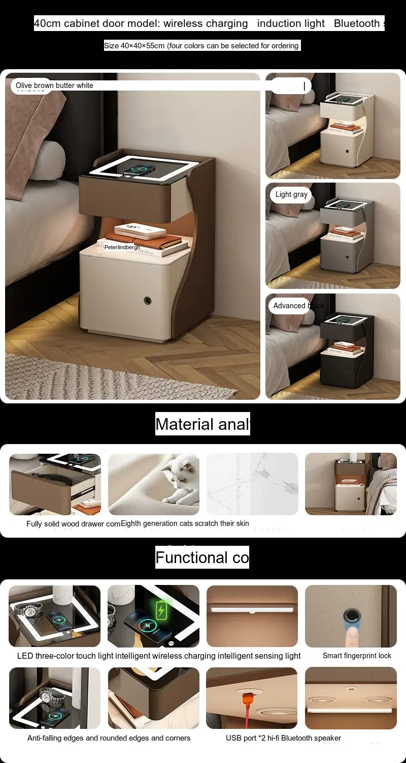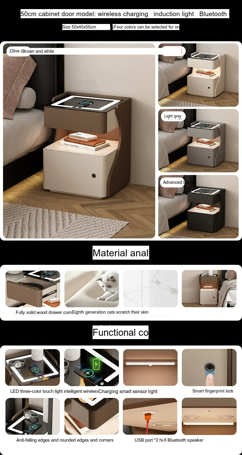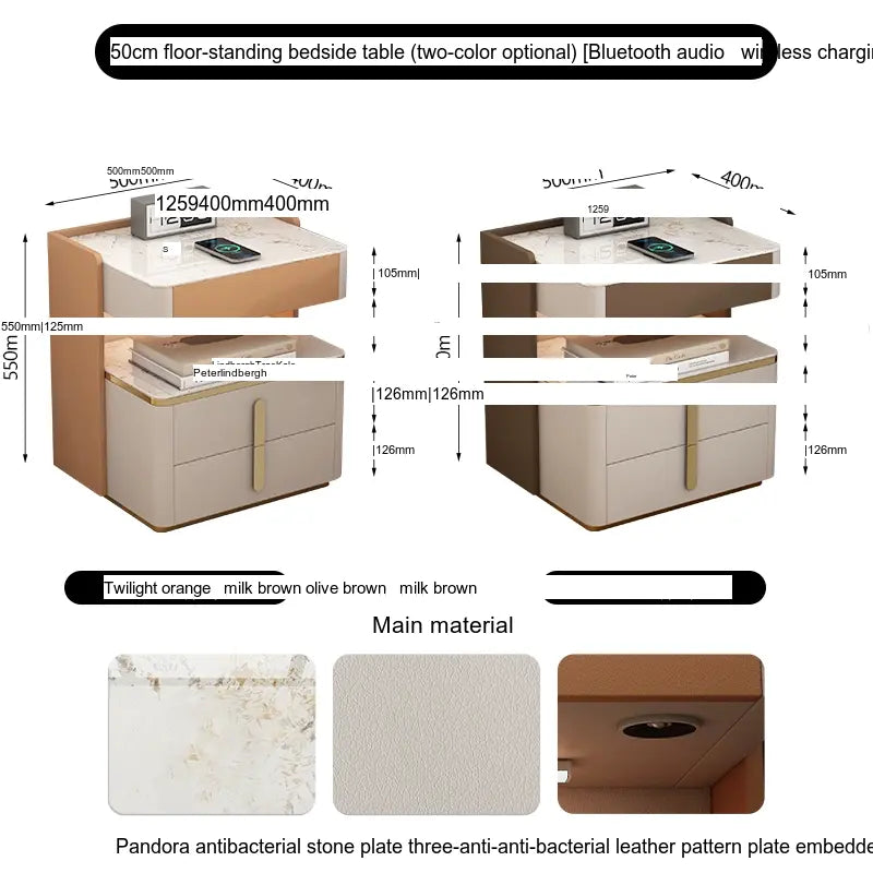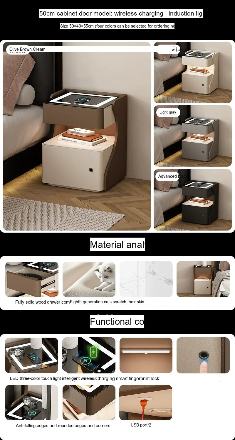The nightstand is not just about security and tech, though. The upper surface is available in a choice of materials—featuring a high-quality antibacterial stone slab, which not only adds an elegant touch but also is easy to clean and maintain. It’s resistant to scratches, wear, and even high temperatures, making it a practical choice for everyday use. The eco-friendly substrate used in the cabinet body further complements the luxurious design, achieving a balance between beauty and sustainability.
