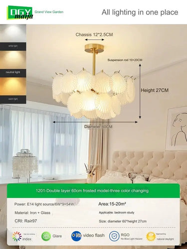 Introducing the GVG Crystal Scallop Shell Ceiling Lamp by DGY/Daguanyuan, a perfect blend of simple modern design and timeless luxury. This stunning glass chandelier adds a touch of refined elegance to any bedroom or study room with its exquisite craftsmanship and eye-catching style.