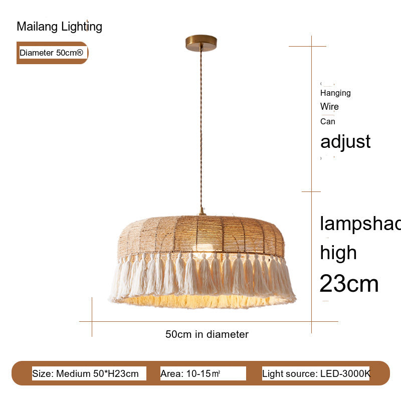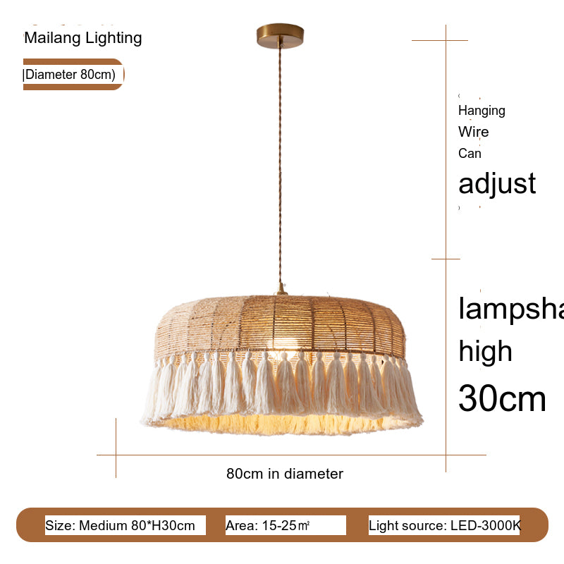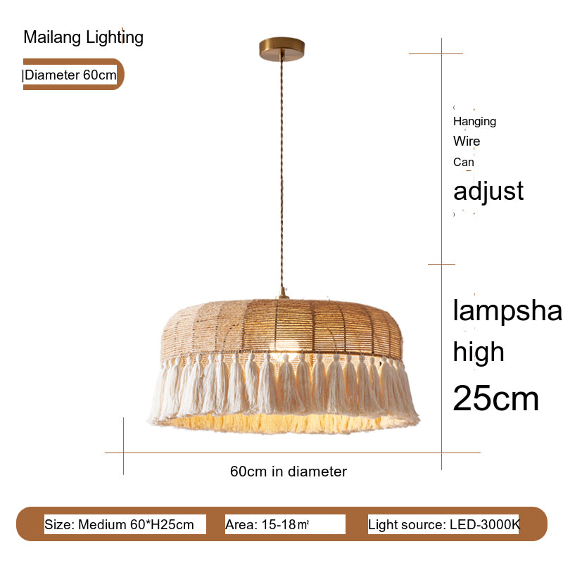 The Elowen ceiling lamp is a stunning representation of vintage chic aesthetics. Its lampshade, crafted from hex rope and paper rope, exudes a natural, earthy vibe while providing warm, inviting light. The intricate weave showcases exceptional craftsmanship and the blending of organic materials to create a visually appealing centerpiece. The tassel design offers a bohemian flair, making it a perfect fit for eclectic or artistic decor setups.