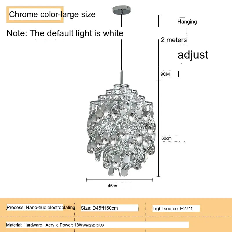 The Isadora ceiling lamp features a unique spiral design that captures the essence of elegance and contemporary art. Its chrome finish offers a sleek, reflective quality that enhances the overall ambiance of your living space. Measuring in two available sizes, Small (D35*H50cm) and Large (D45*H60cm), it is perfect for a range of environments, from cozy nooks to expansive living rooms.