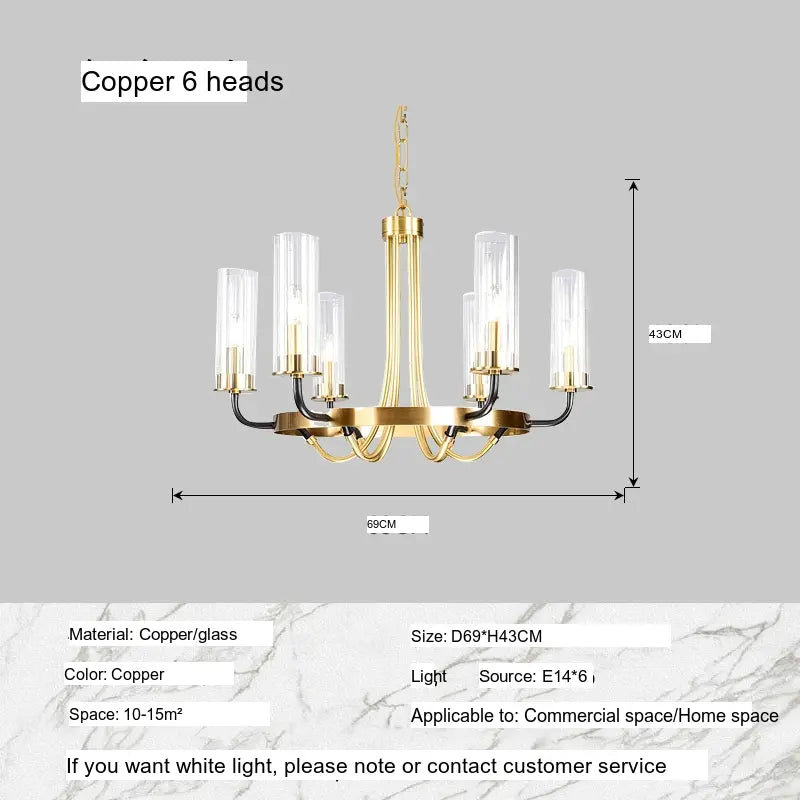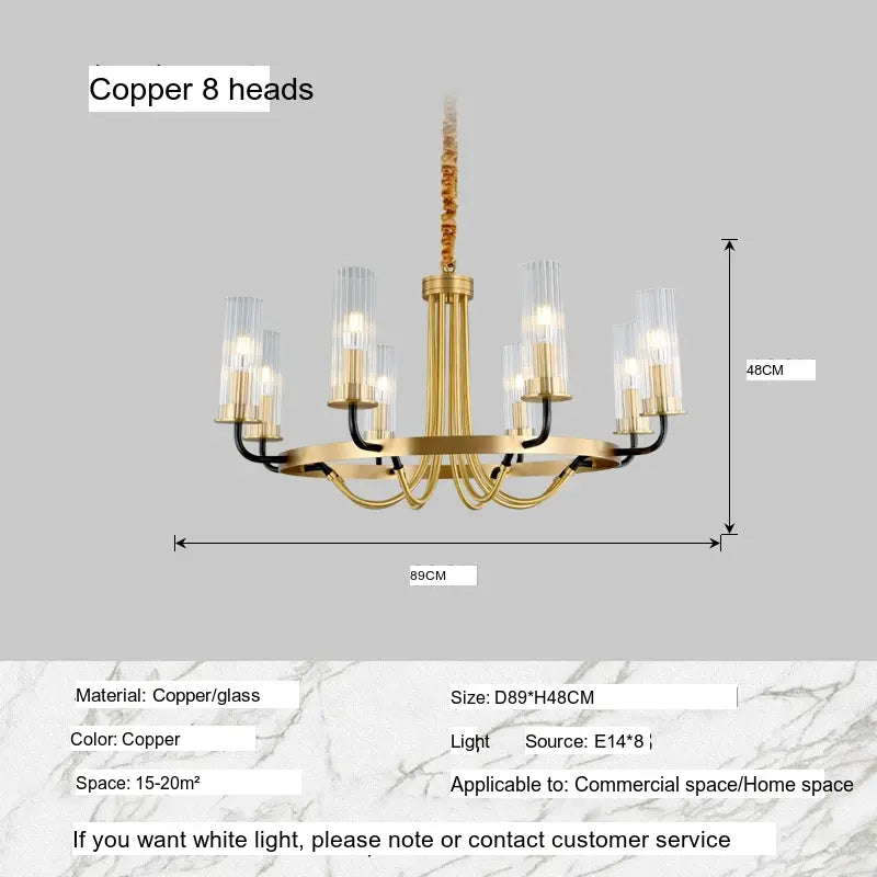 This incredible ceiling lamp embodies a chic American simple style that will seamlessly blend into any contemporary or traditional decor. Crafted primarily from high-quality copper, it exudes a sense of sophistication and durability. The lamp features an intricate chandelier design that captures attention with its stunning aesthetic appeal. The main lampshade is made from elegant glass, providing a beautiful contrast to the rich copper finish and ensuring a stunning visual effect when illuminated.