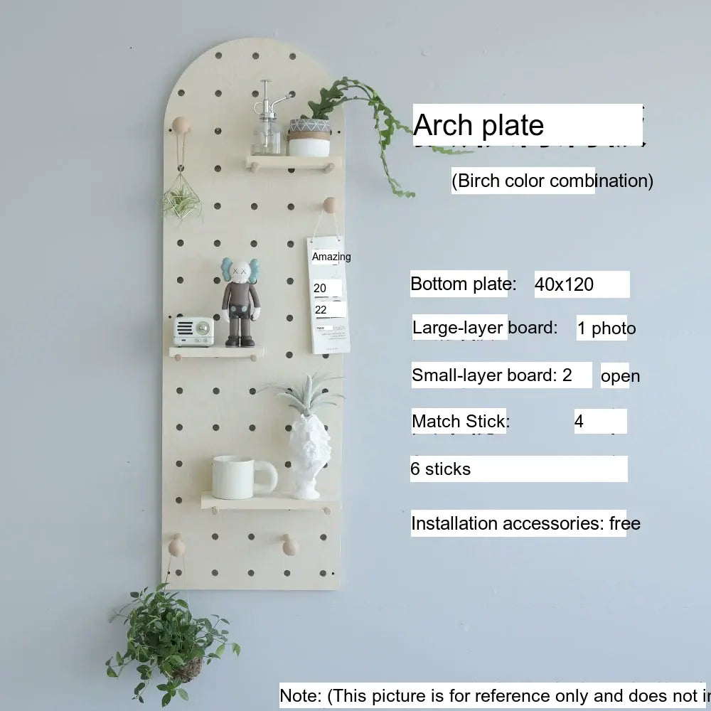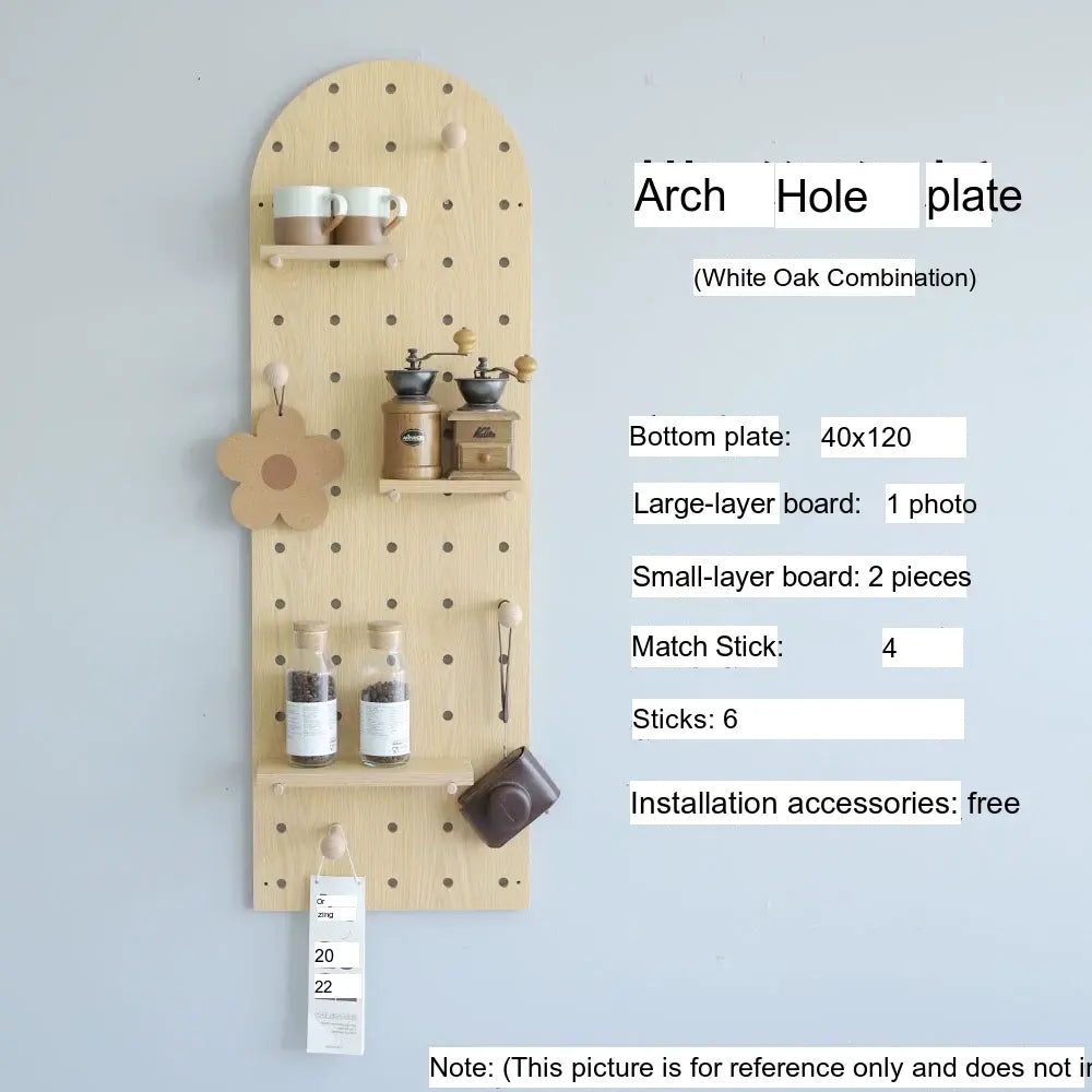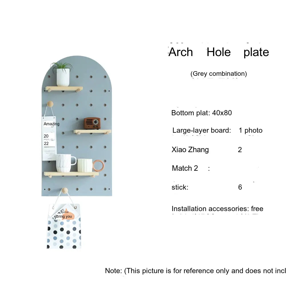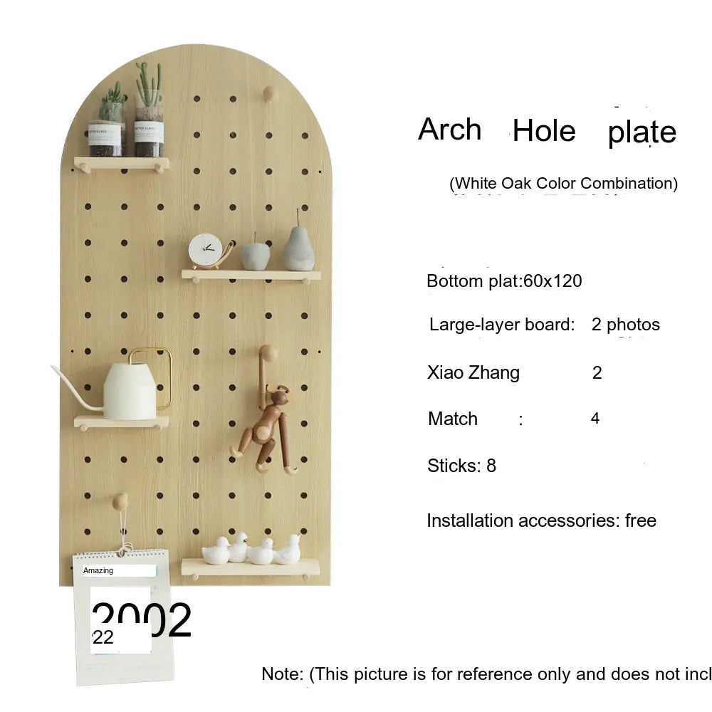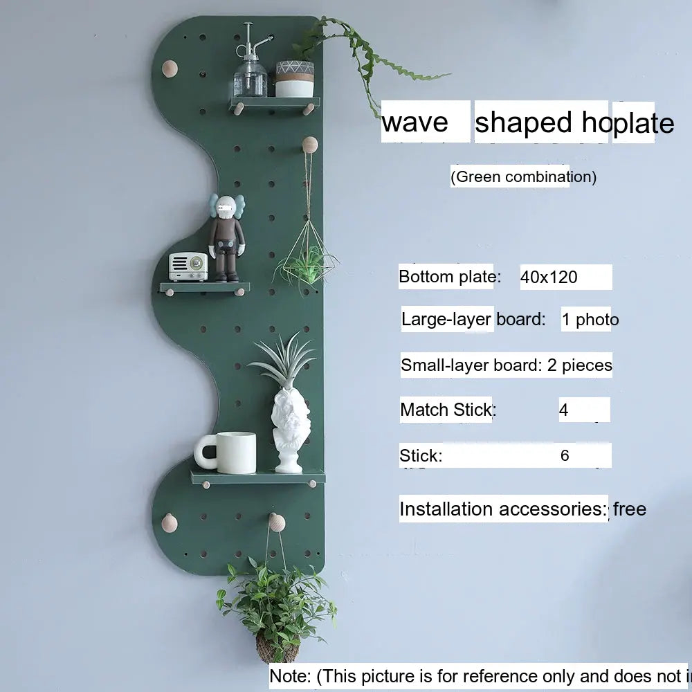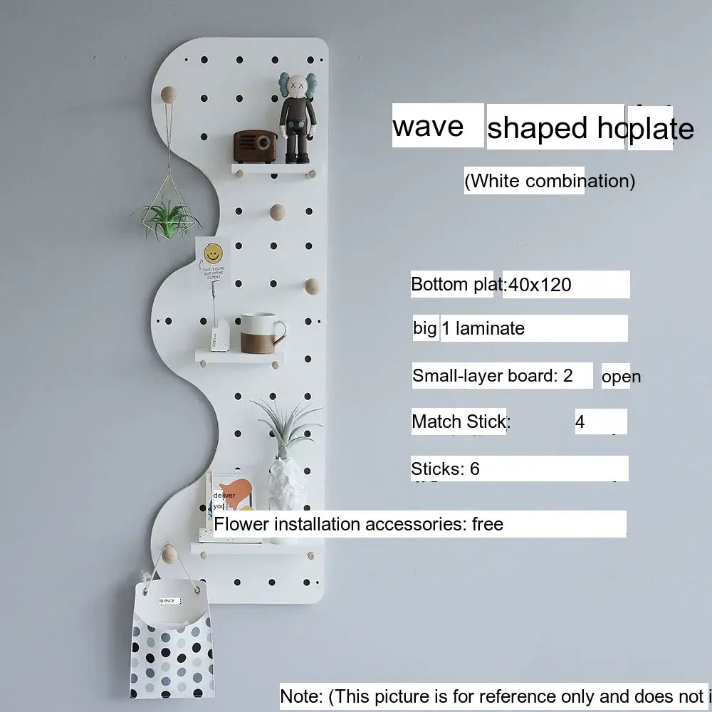 The pegboard structure offers flexible storage possibilities. Shelves, hooks, and accessories can be rearranged to store items such as bags, hats, keys, or decorative plants. With additional design elements like wave edges or layered panel shapes, it doubles as both storage and decor.