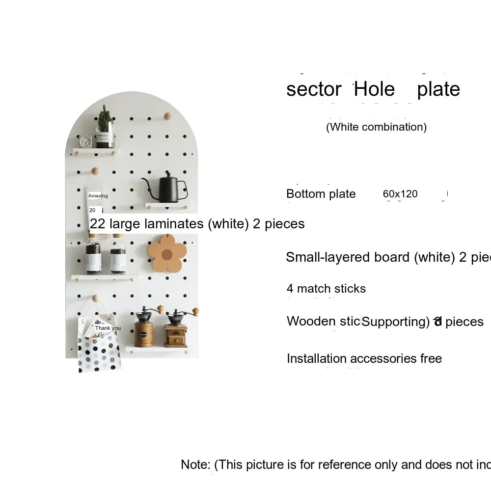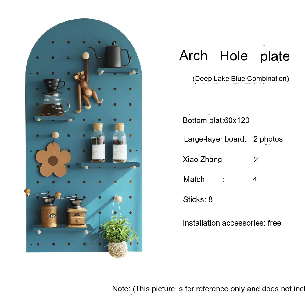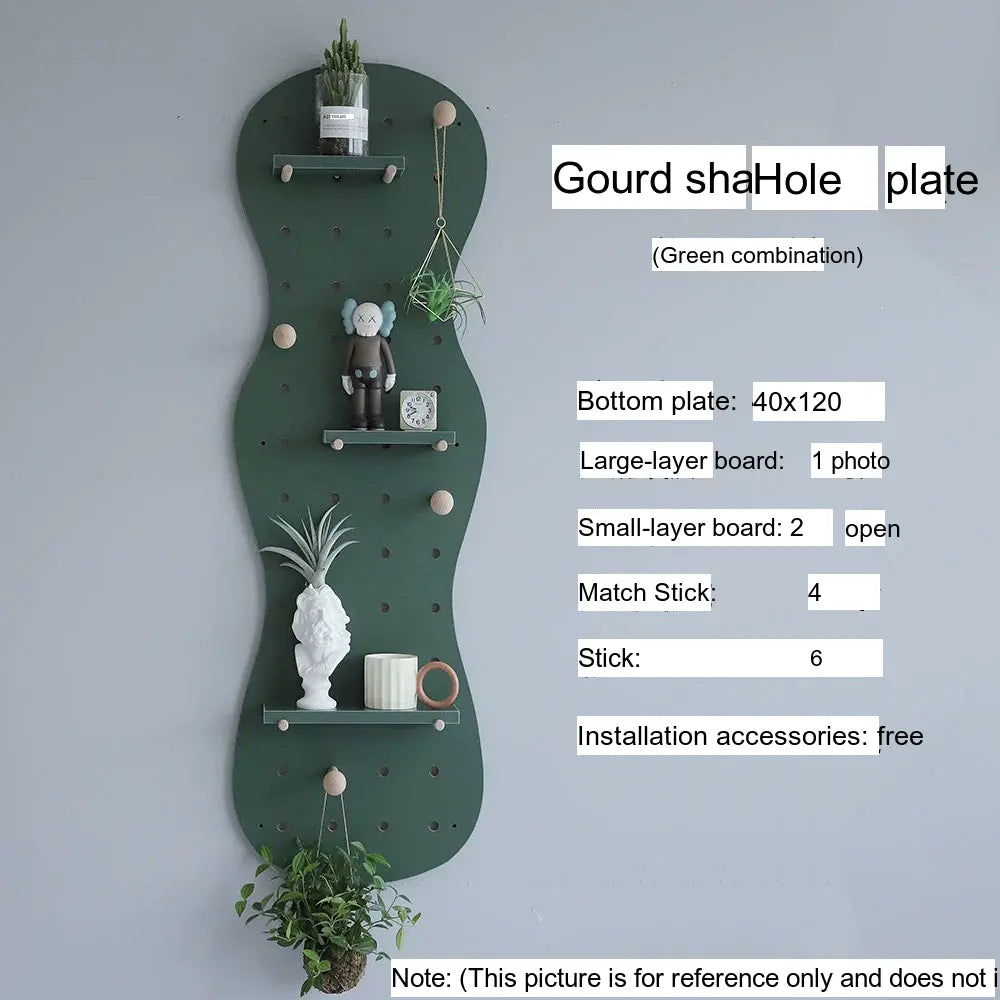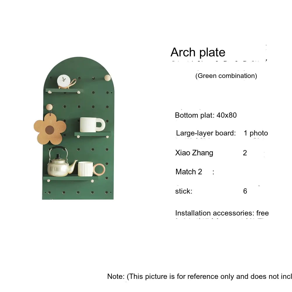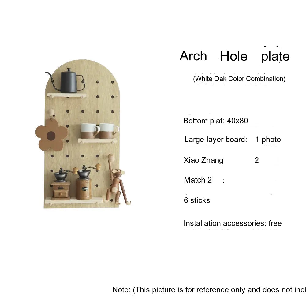 The pegboard structure offers flexible storage possibilities. Shelves, hooks, and accessories can be rearranged to store items such as bags, hats, keys, or decorative plants. With additional design elements like wave edges or layered panel shapes, it doubles as both storage and decor.