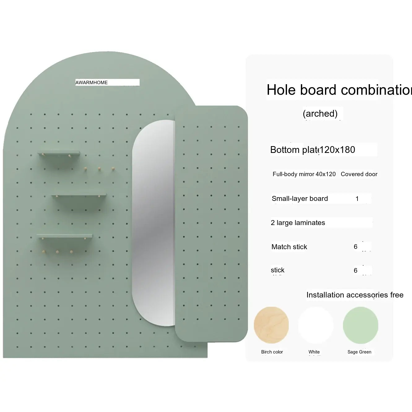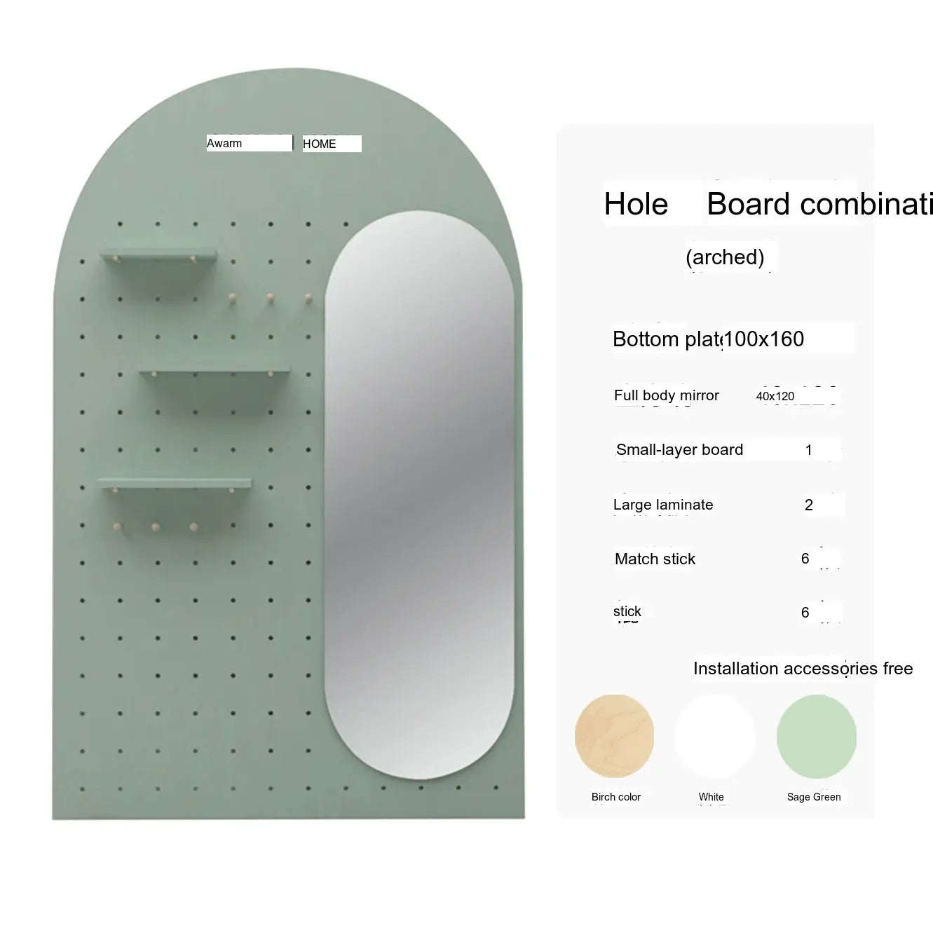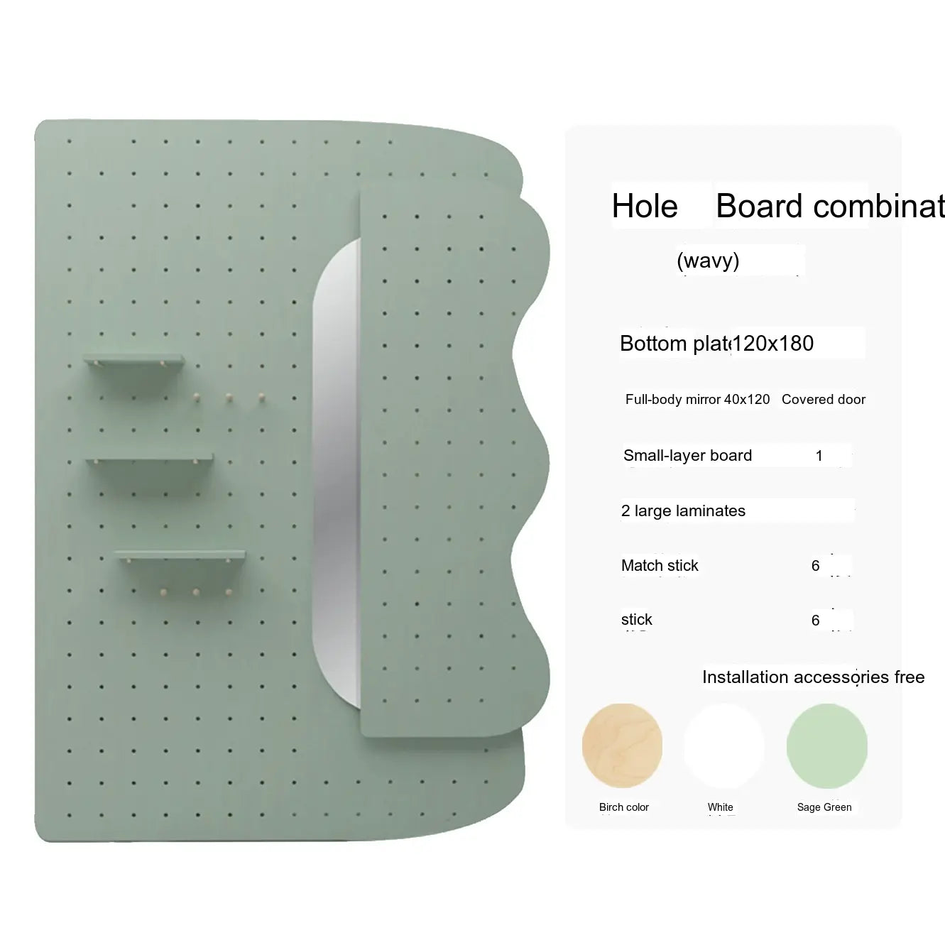 Crafted with premium wood and coated in a soothing sage green finish, the XIAOMU Ruri Mirror and Pegboard Decor set brings a fresh, modern charm to your living space. Its elegant arched shape and wide reflective surface are ideal for both full-body viewing and visually expanding smaller rooms. Available in various styles, this set includes full-length mirrors (100x160 cm, 120x180 cm) and integrated pegboard combinations to complement your aesthetic.