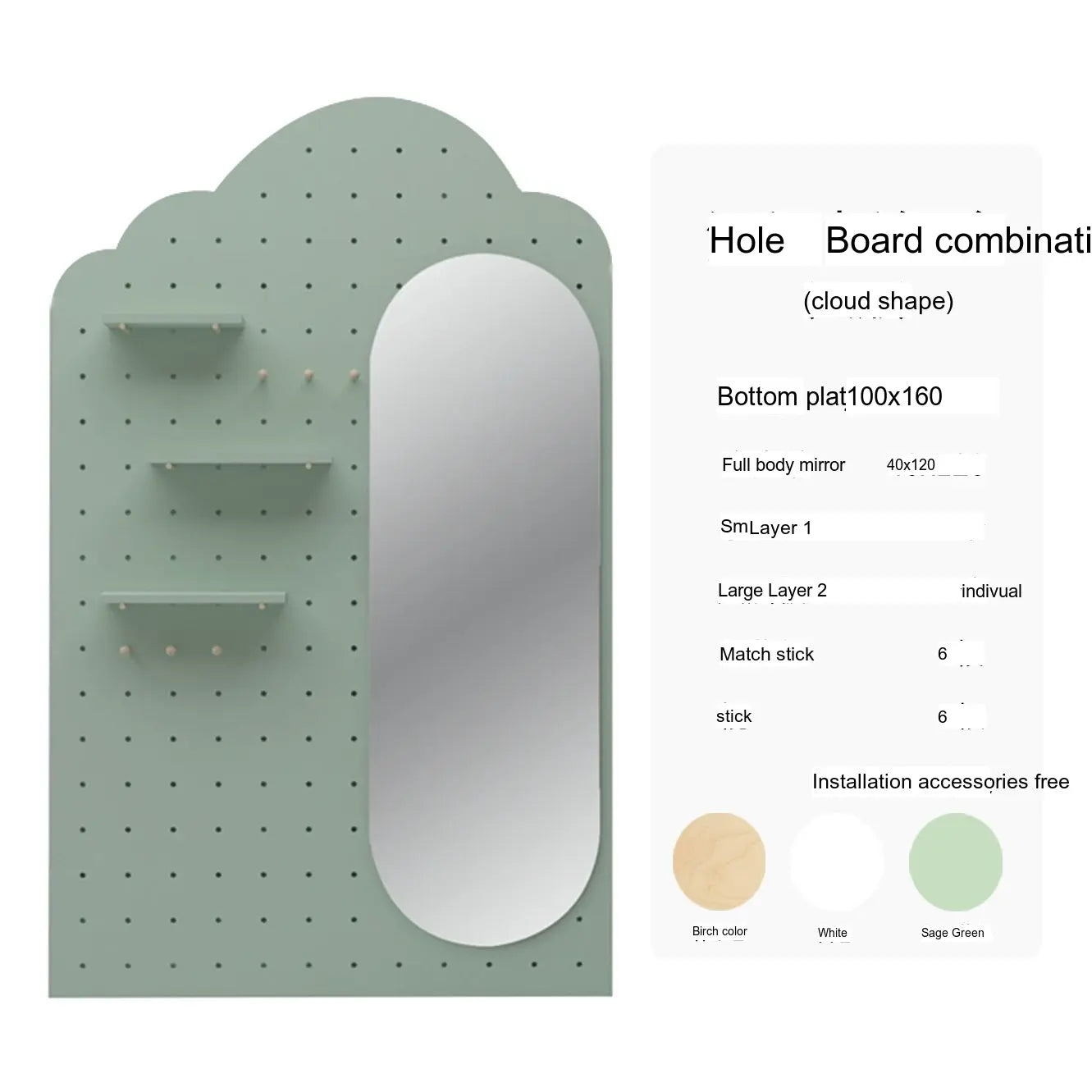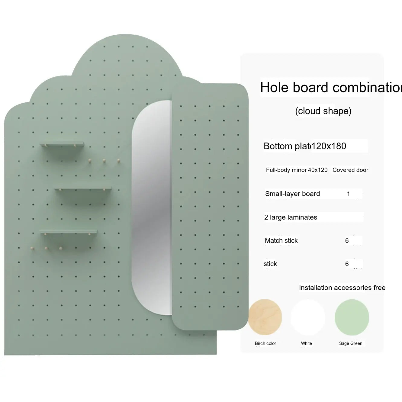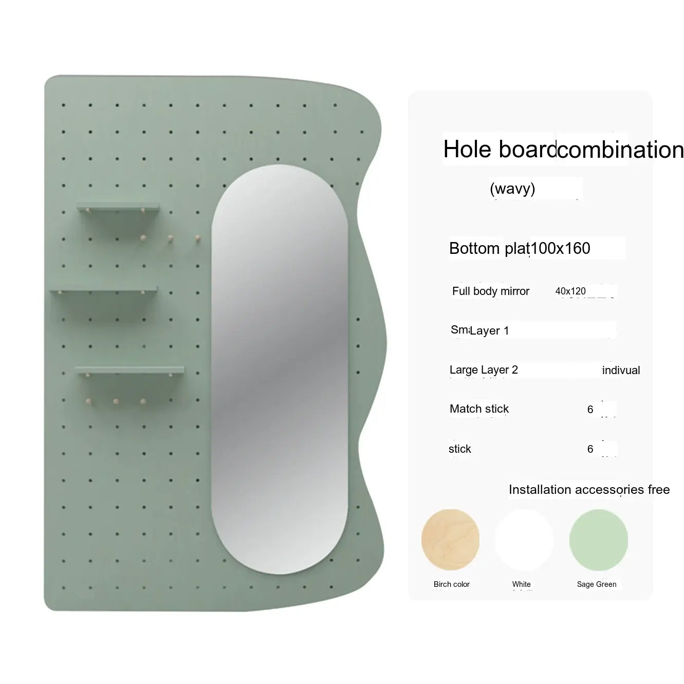 Crafted with premium wood and coated in a soothing sage green finish, the XIAOMU Ruri Mirror and Pegboard Decor set brings a fresh, modern charm to your living space. Its elegant arched shape and wide reflective surface are ideal for both full-body viewing and visually expanding smaller rooms. Available in various styles, this set includes full-length mirrors (100x160 cm, 120x180 cm) and integrated pegboard combinations to complement your aesthetic.