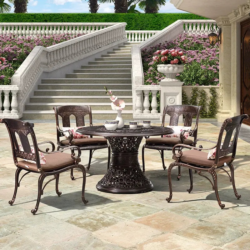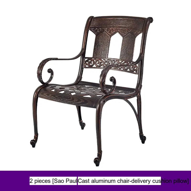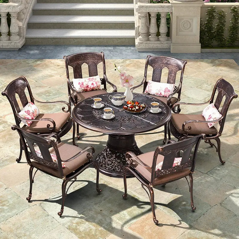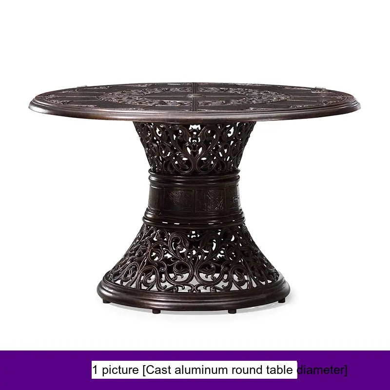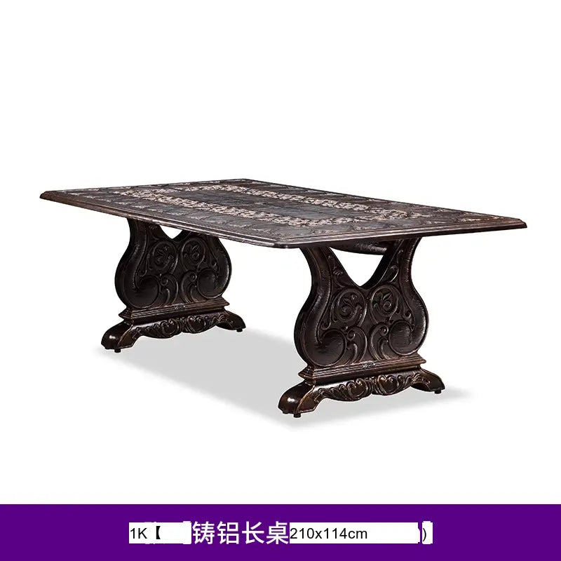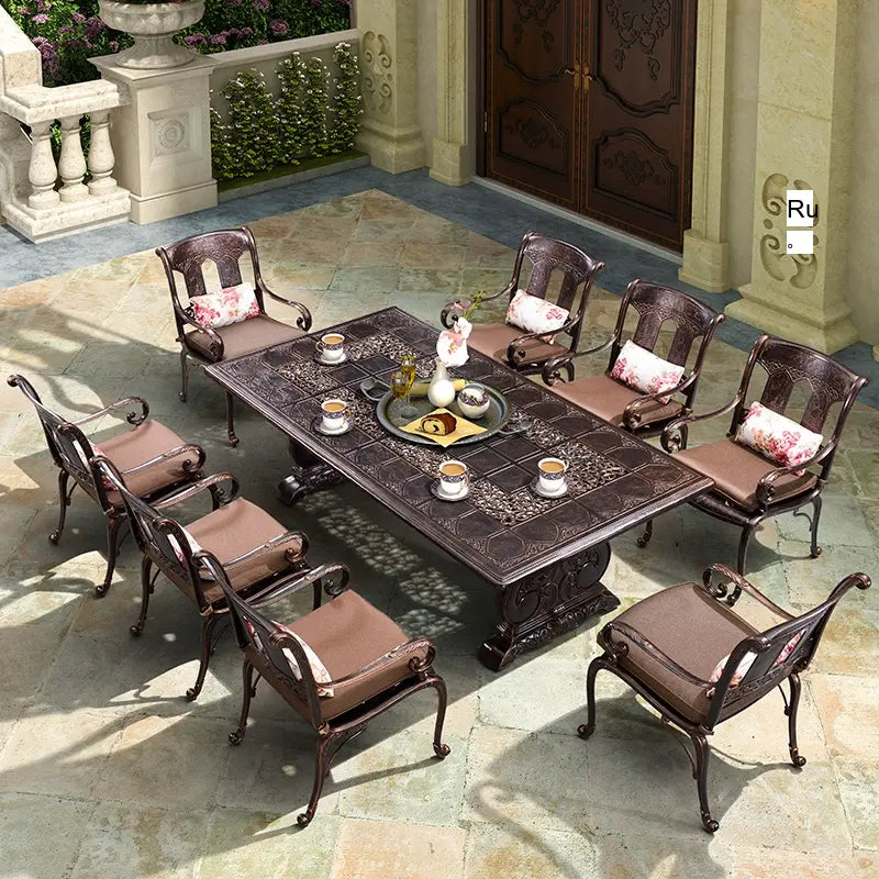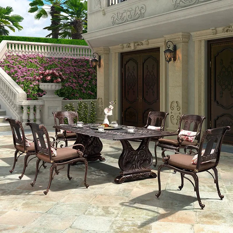 This set includes a robust cast aluminum long table (measuring 212x110 cm) paired with multiple chair options, ensuring both comfort and style for your gatherings. The aluminum structure is not only lightweight but also designed to withstand various outdoor elements, ensuring durability for years to come. The elegant contours and artistic patterns inspired by classic European designs add a sophisticated flair to any patio, garden, or balcony.