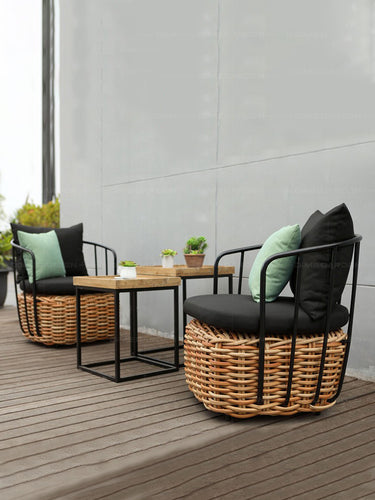 Crafted by DIME GARDEN, this rattan chair set (Model p-63) features a unique combination of sustainable materials and pastoral design elements. It consists of a single sofa, a double sofa, a chair, and solid wood coffee tables, all perfectly matched to create a cohesive and inviting environment. Whether you're hosting a summer barbecue or simply enjoying a quiet evening under the stars, this versatile seating arrangement caters to all your outdoor entertainment needs.