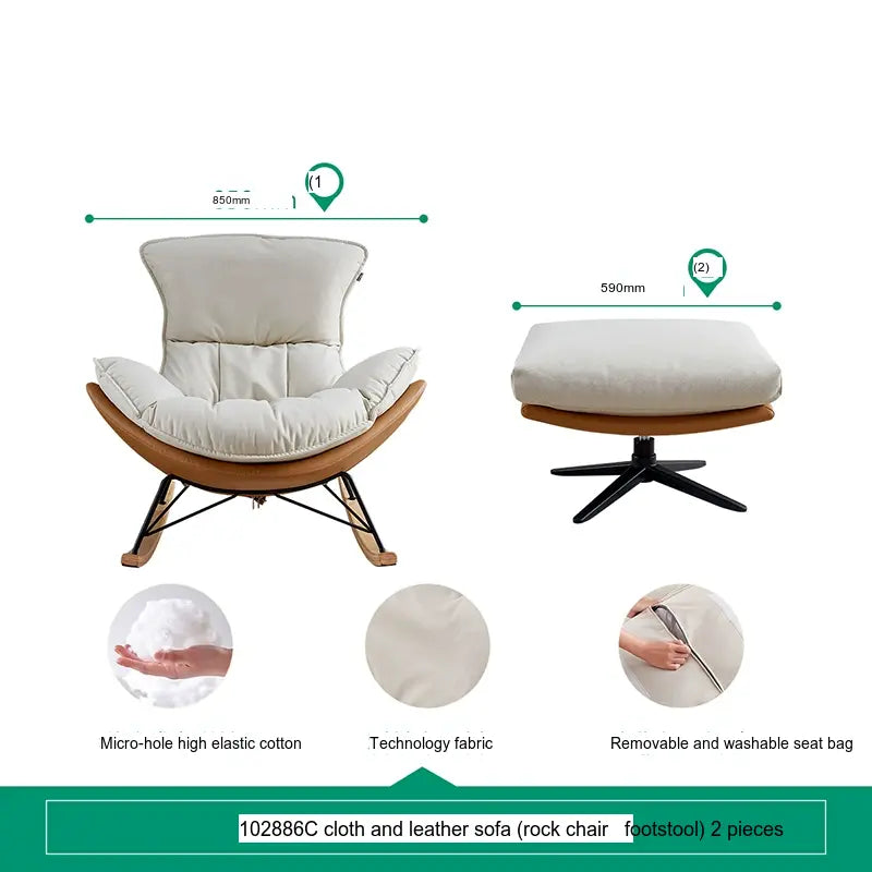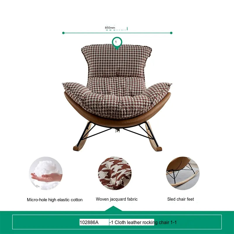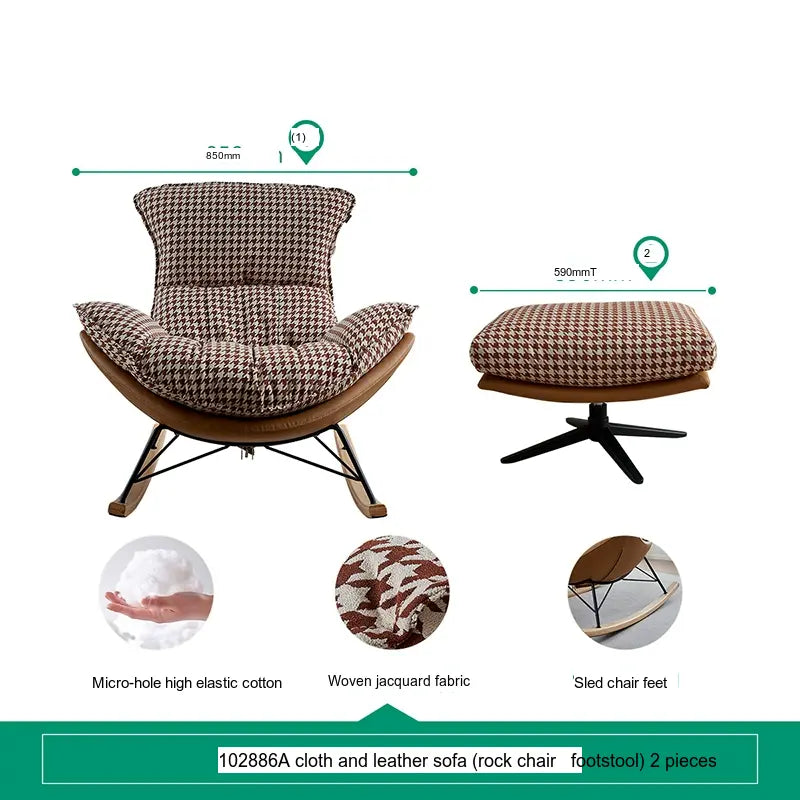 This rocking chair stands out with its fashion-forward color options, allowing you to choose from Caramel Houndstooth Jacquard complemented by Orange Imitation Leather or the classic elegance of Black and White Houndstooth Jacquard paired with Dark Gray Black Imitation Leather. Each variant can be customized with or without a matching footstool, ensuring that your relaxation space looks and feels exactly how you desire. Its chic, contemporary style makes it an excellent addition to modern decor, while the compact dimensions ensure it fits flawlessly into smaller spaces without compromising on comfort.