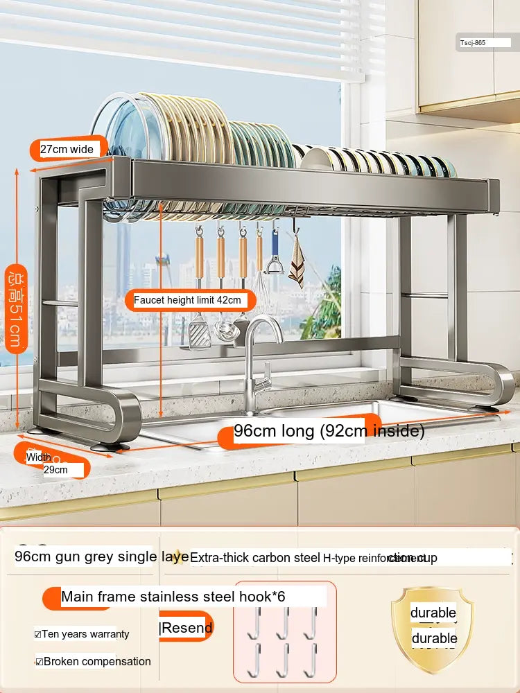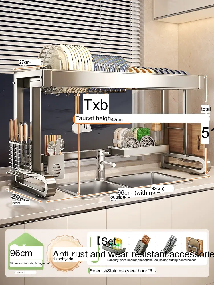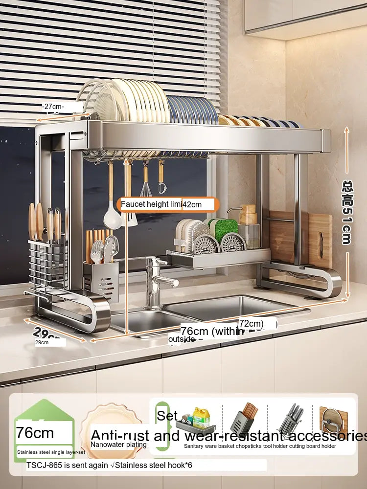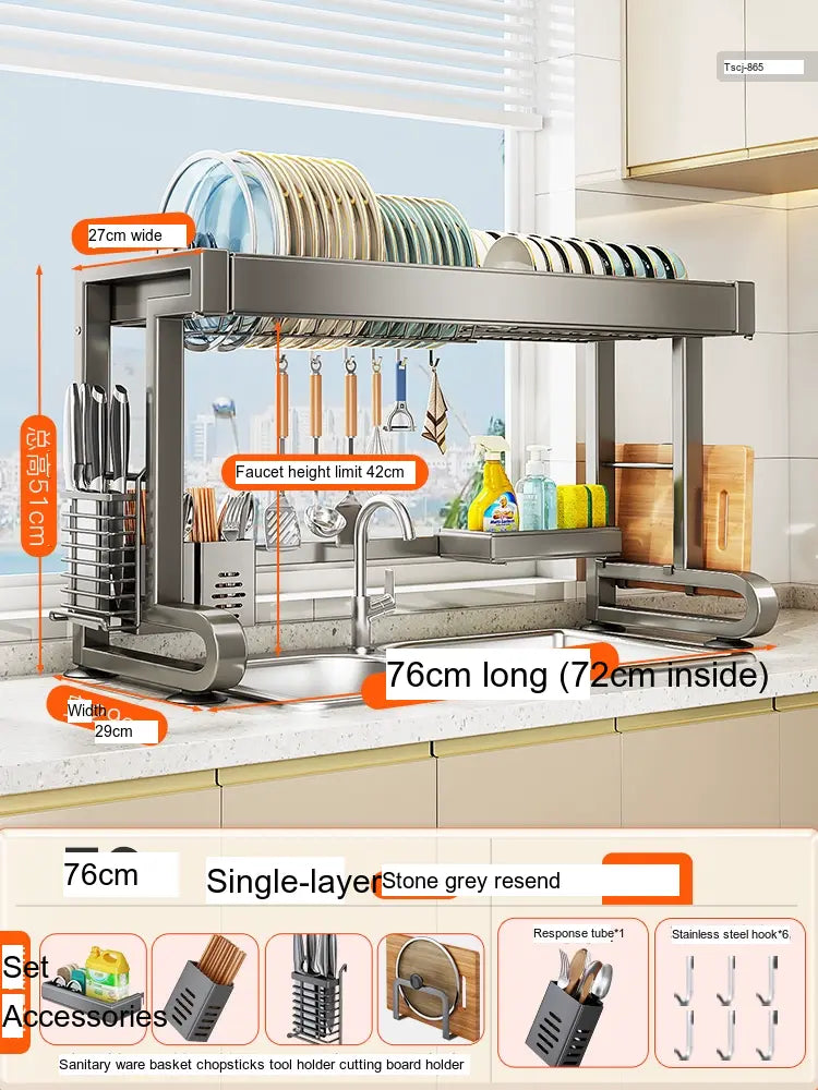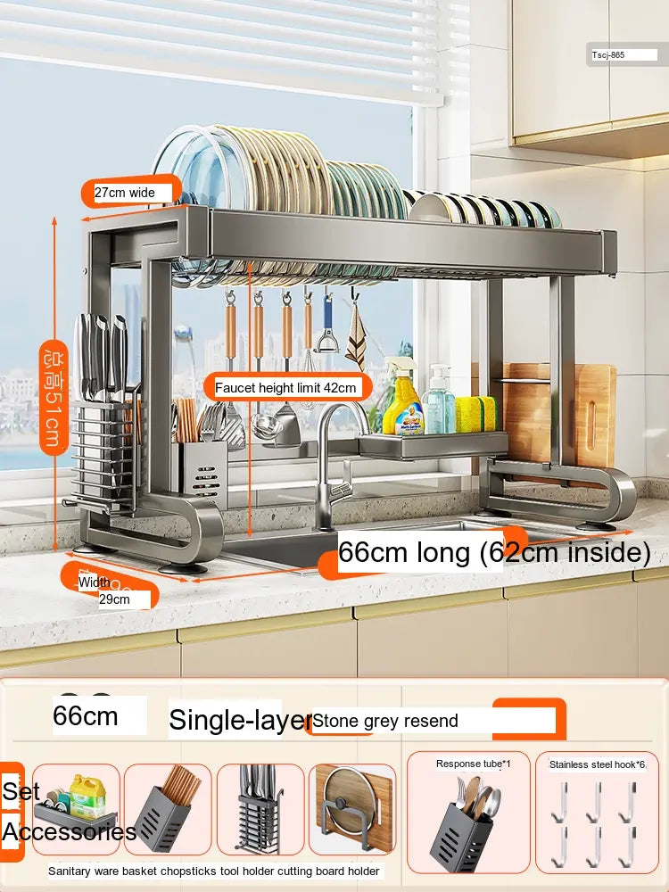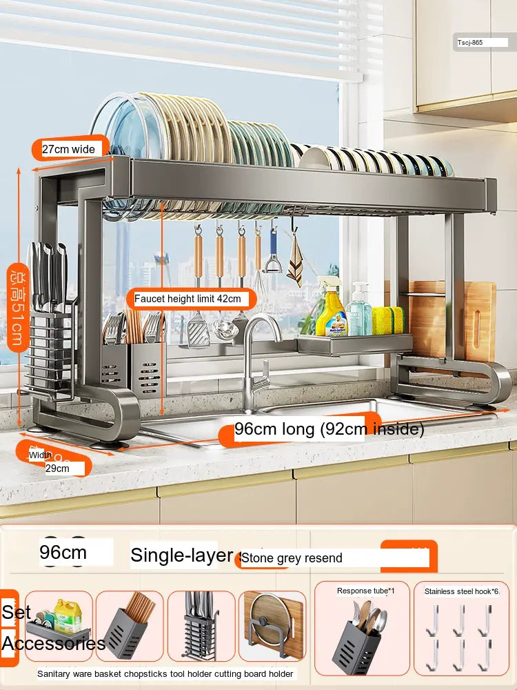 The Elowen Kitchen Sink Rack features a spacious single-layer design that is perfect for storing utensils like bowls, plates, and other kitchen essentials. The carefully designed layout includes a dedicated knife holder, a chopsticks drum, and a sanitary ware rack, which guarantees that all your cutlery and tools are organized and easy to access.