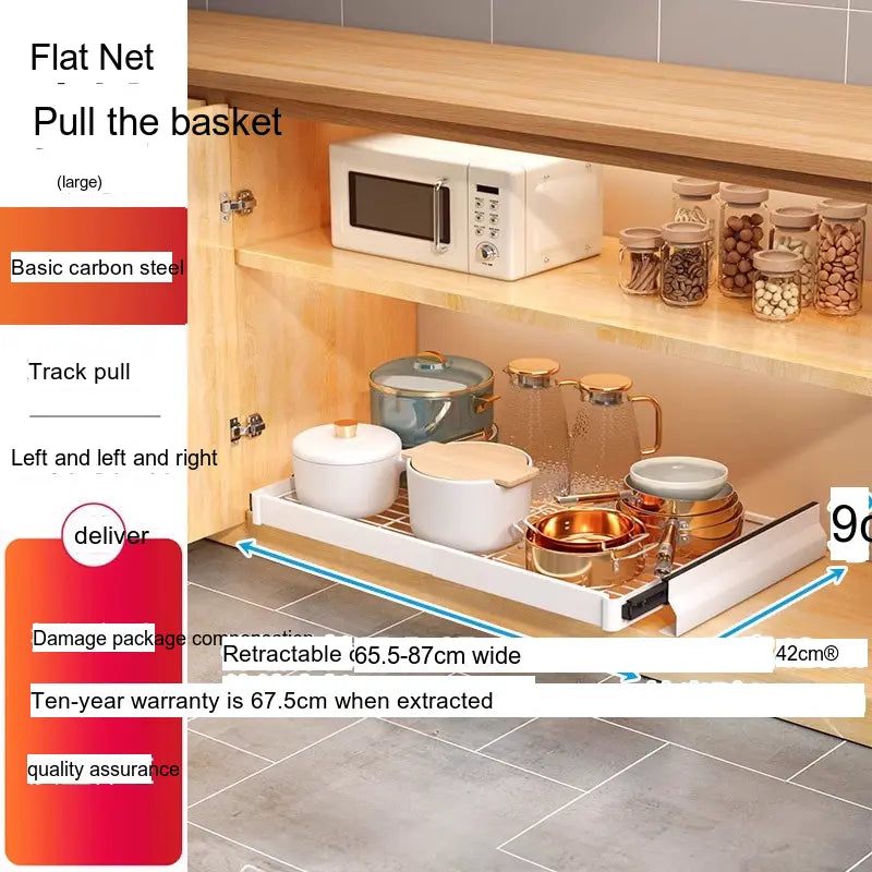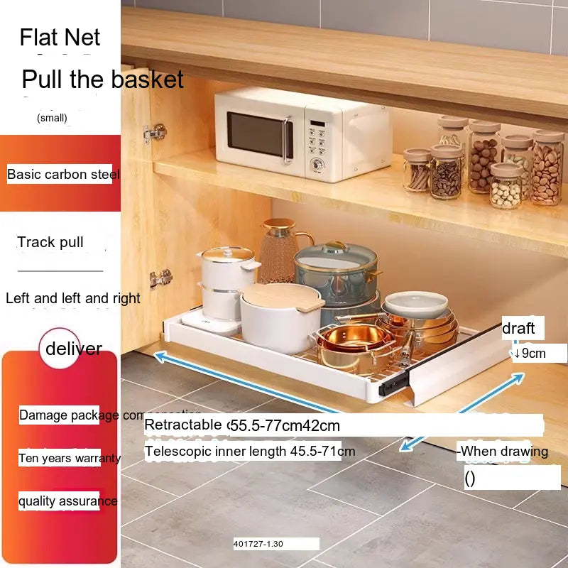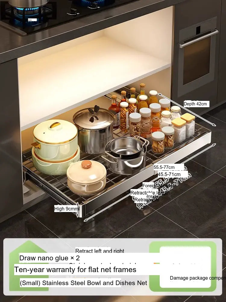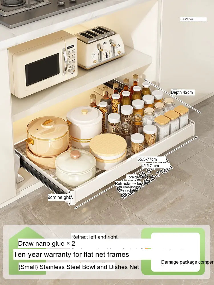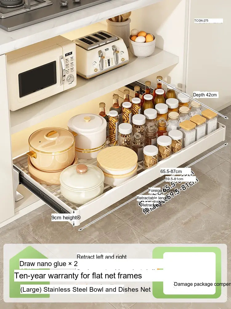 This pull basket comes with an array of options, including stainless steel bowls, trays, and flat mesh storage types available in both large and small sizes. This customization allows you to tailor your kitchen organization to your specific needs. Choose from multiple color options, including a timeless cream white and a bold original color, to perfectly coordinate with your kitchen's aesthetic.