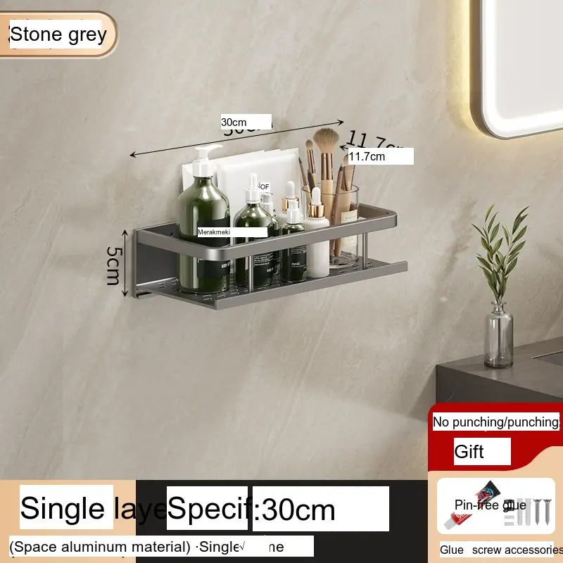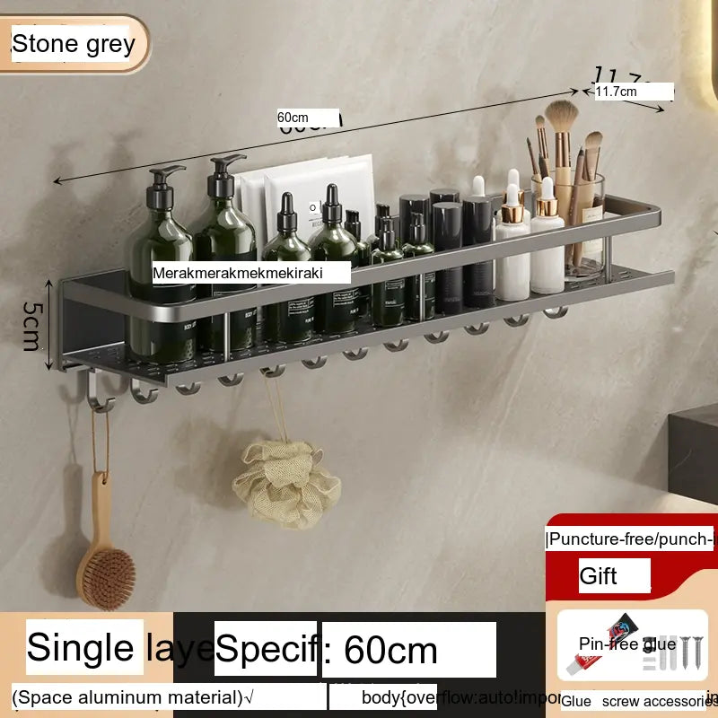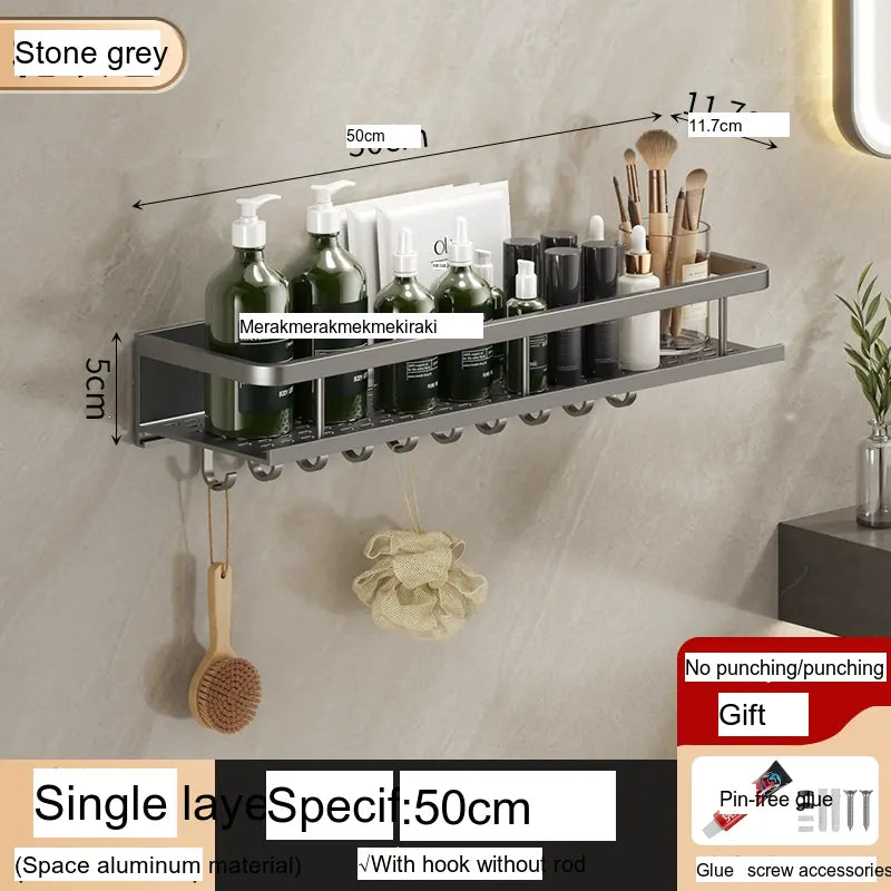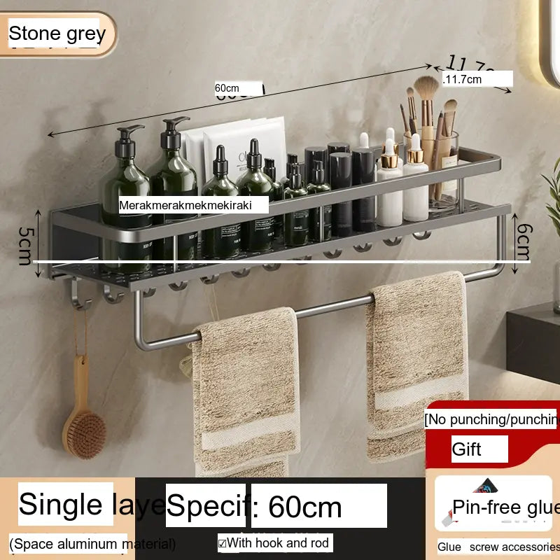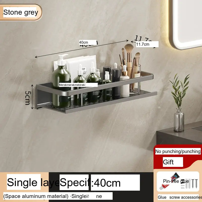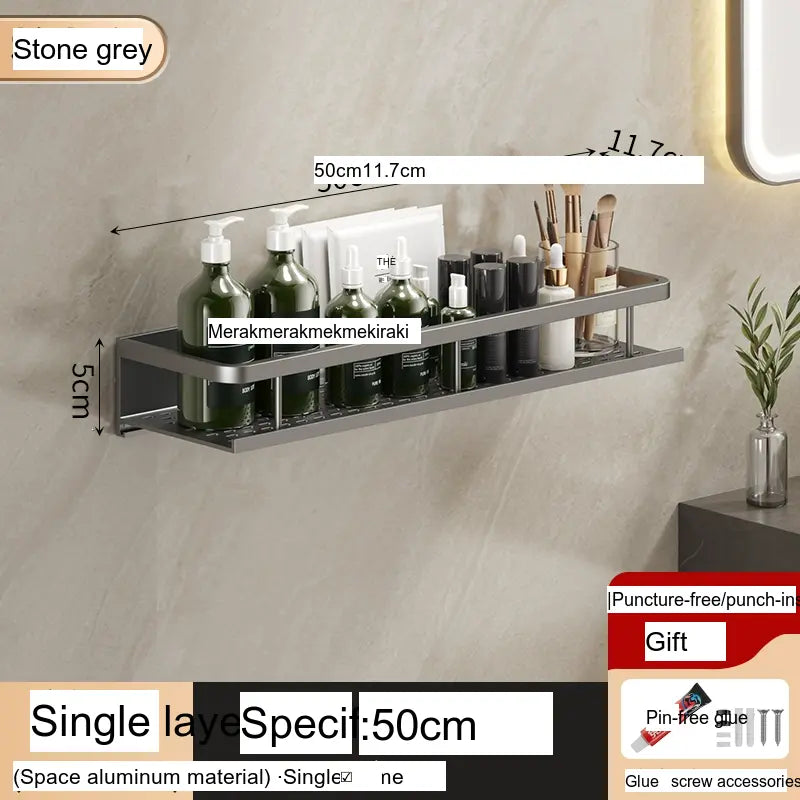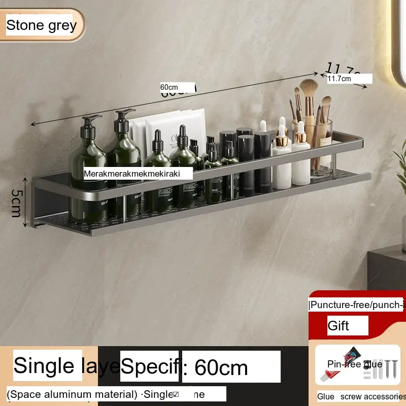 Constructed from high-quality space aluminum, this shelf is designed to withstand the test of time. It is resistant to rust and corrosion, making it suitable for humid bathroom environments. With its strong load-bearing capacity, this shelf can hold various items ranging from small toiletries to heavier bathroom essentials, ensuring your storage remains secure and reliable.