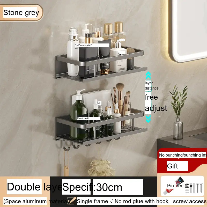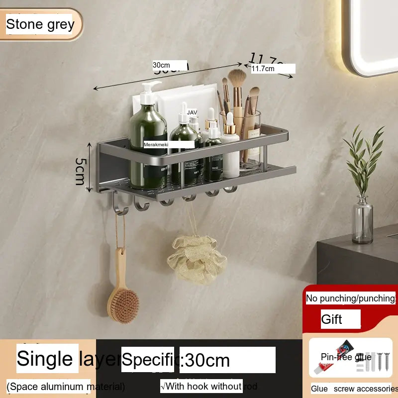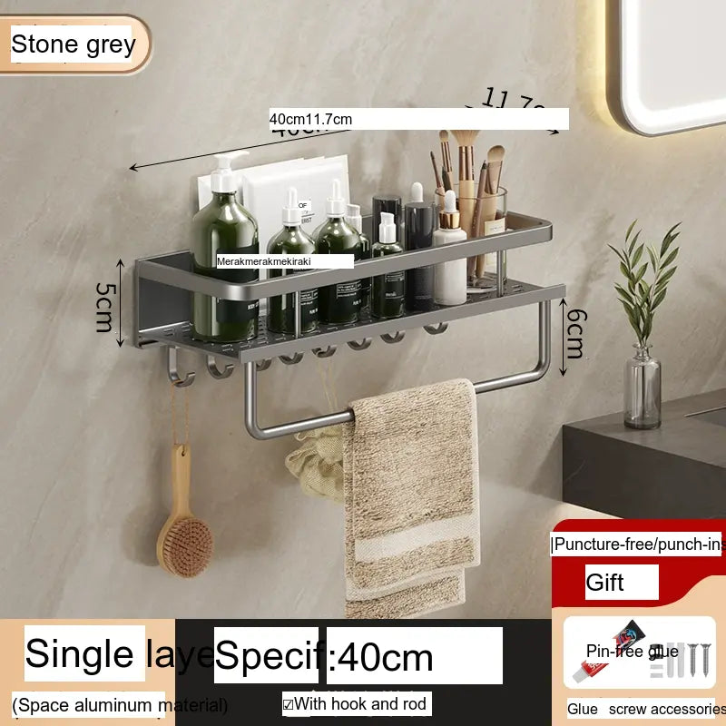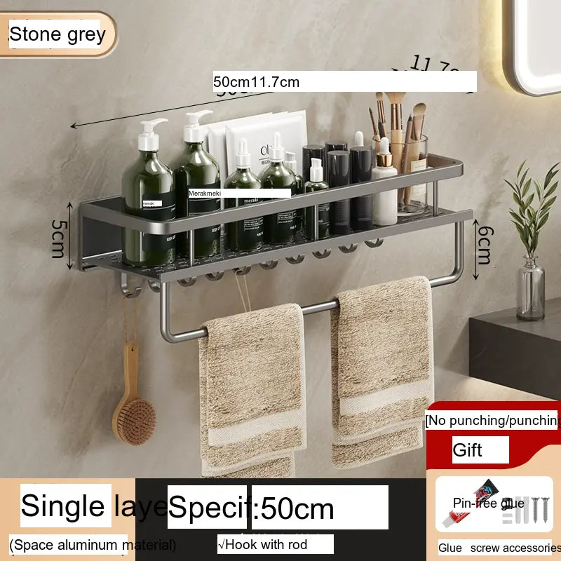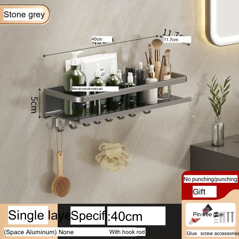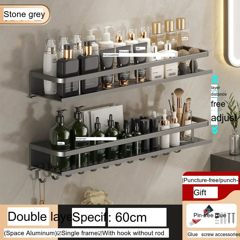 Constructed from high-quality space aluminum, this shelf is designed to withstand the test of time. It is resistant to rust and corrosion, making it suitable for humid bathroom environments. With its strong load-bearing capacity, this shelf can hold various items ranging from small toiletries to heavier bathroom essentials, ensuring your storage remains secure and reliable.