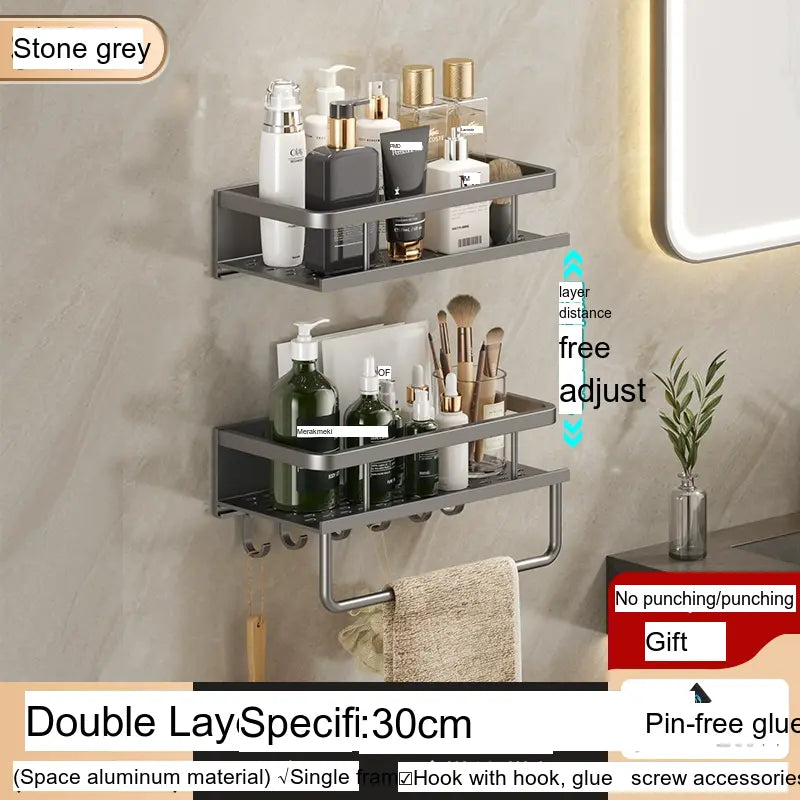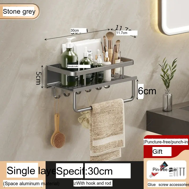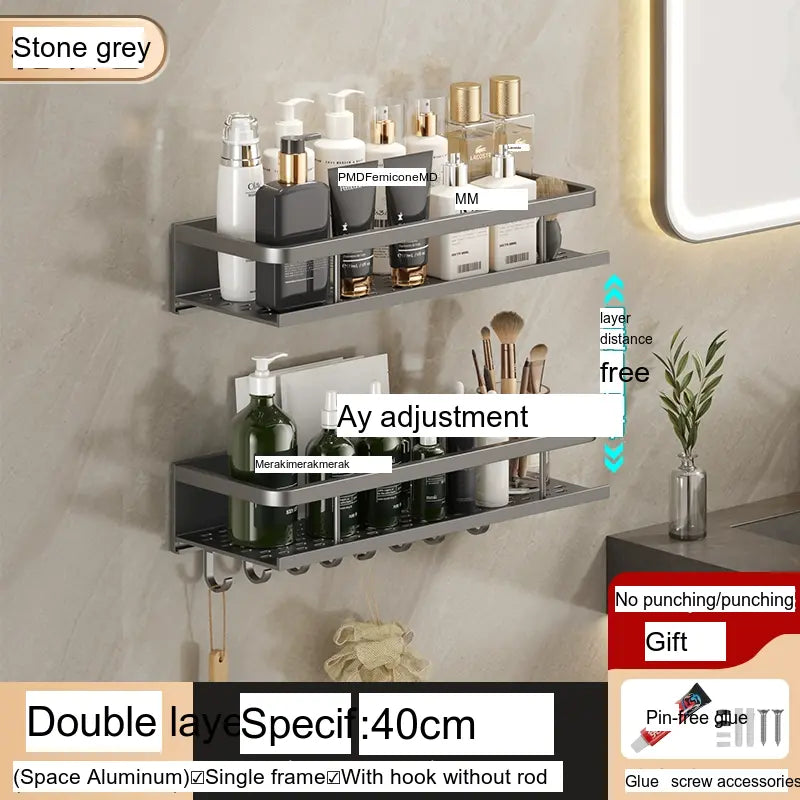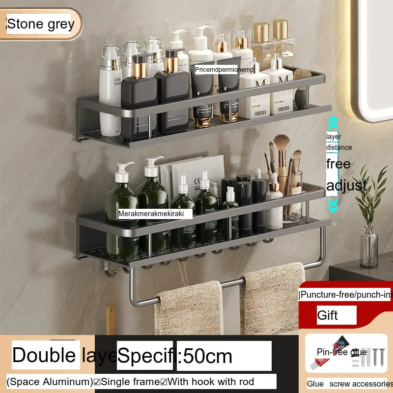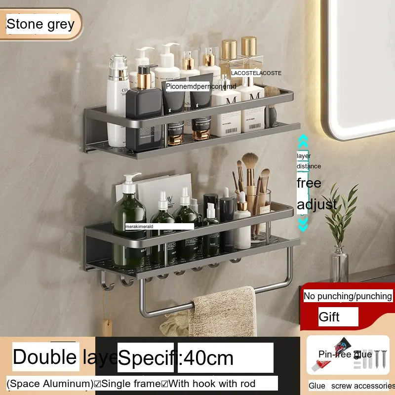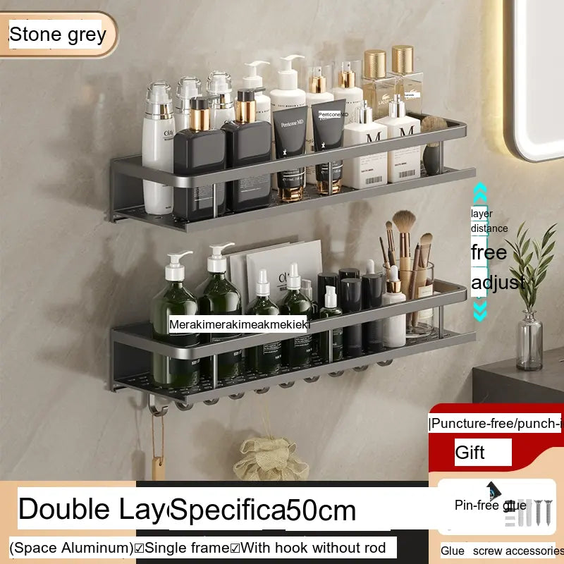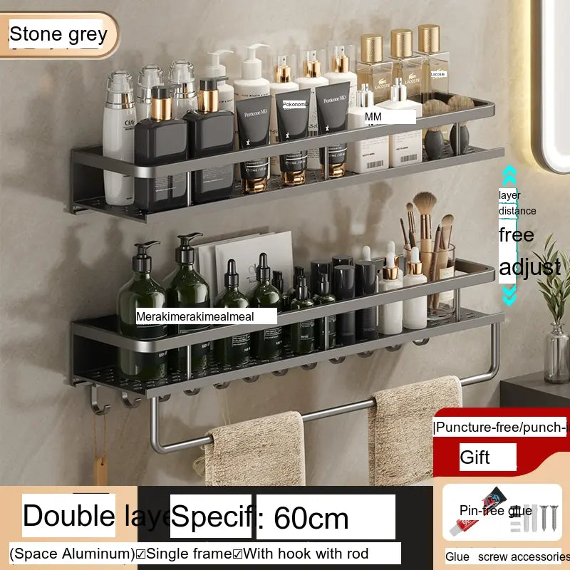 Constructed from high-quality space aluminum, this shelf is designed to withstand the test of time. It is resistant to rust and corrosion, making it suitable for humid bathroom environments. With its strong load-bearing capacity, this shelf can hold various items ranging from small toiletries to heavier bathroom essentials, ensuring your storage remains secure and reliable.