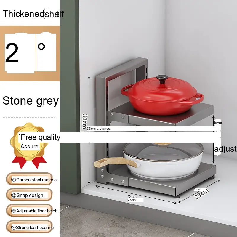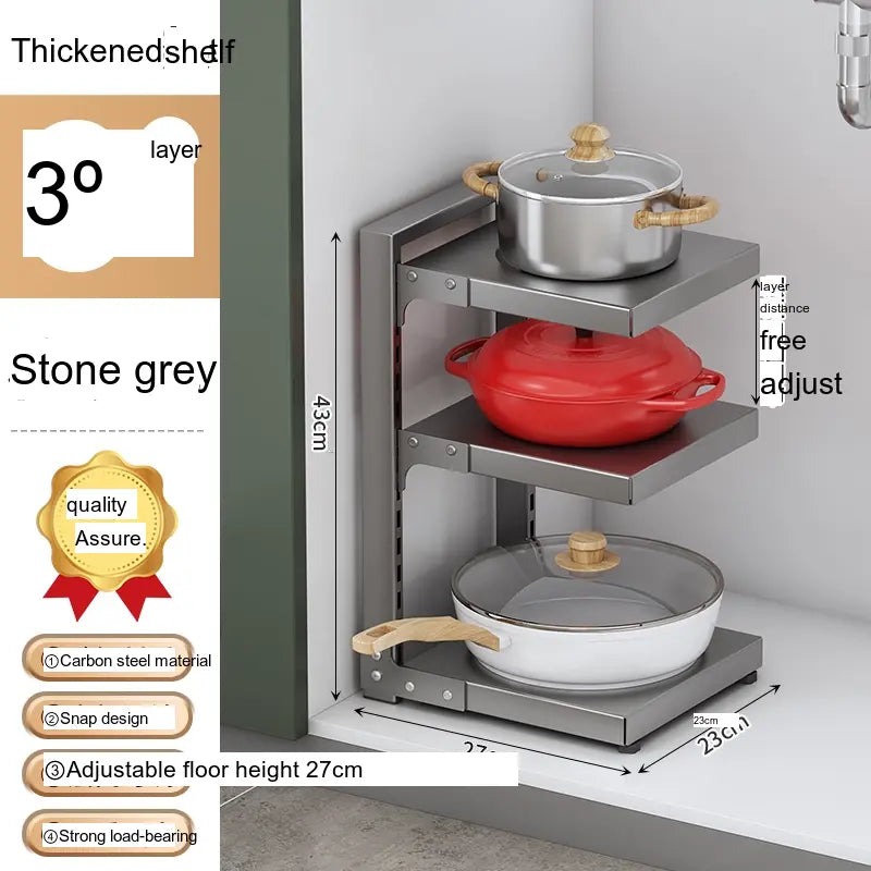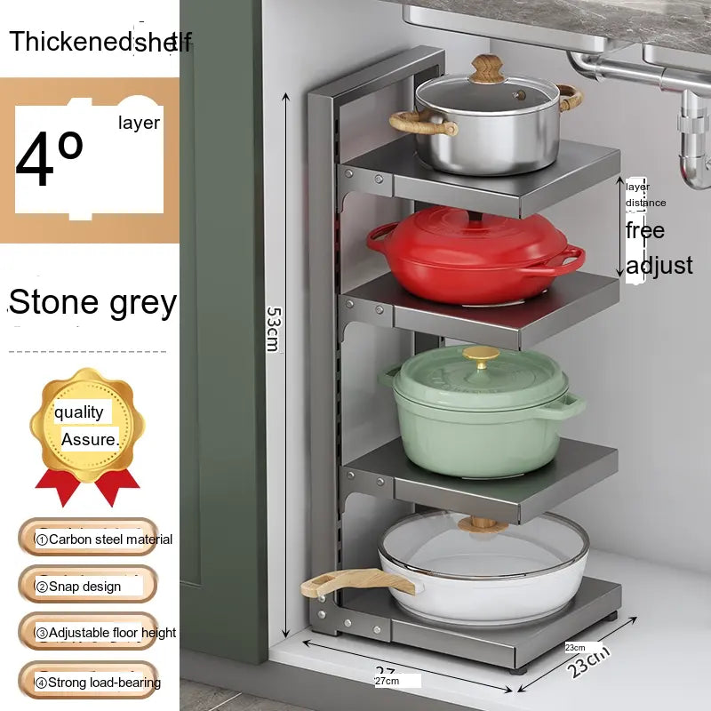 Built with practicality in mind, this rack accommodates a variety of cookware, dishware, and cleaning supplies. The modular tiered design allows height adjustments between levels, supporting flexible organization beneath sinks where space is limited.