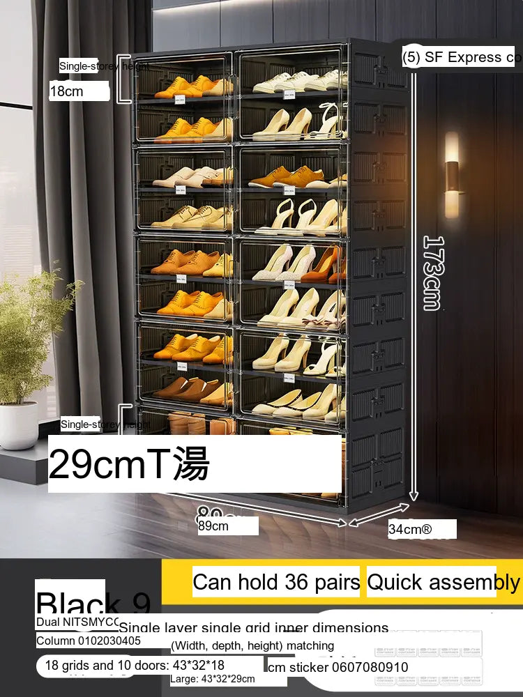 The transparent front panels allow you to easily view and display your shoes while protecting them from dust. With a clean modern frame and sleek design, this cabinet integrates seamlessly into entryways, bedrooms, or walk-in closets.