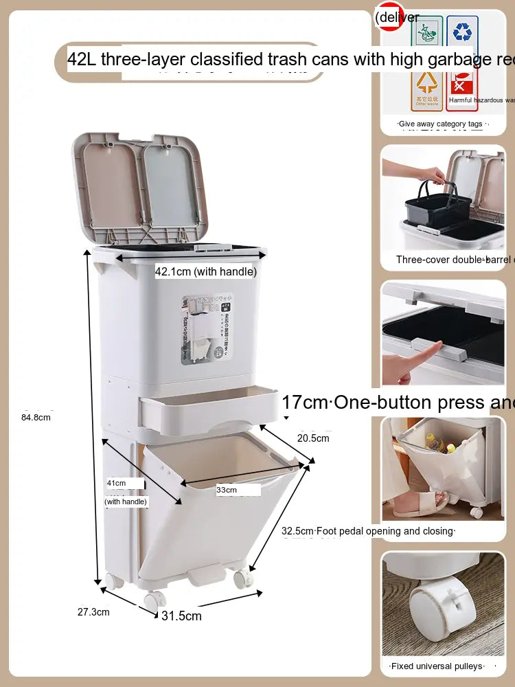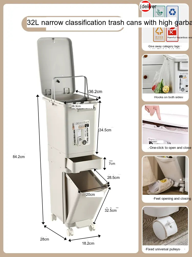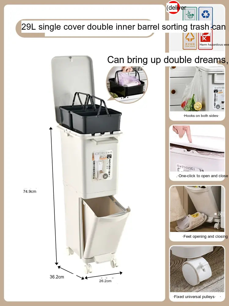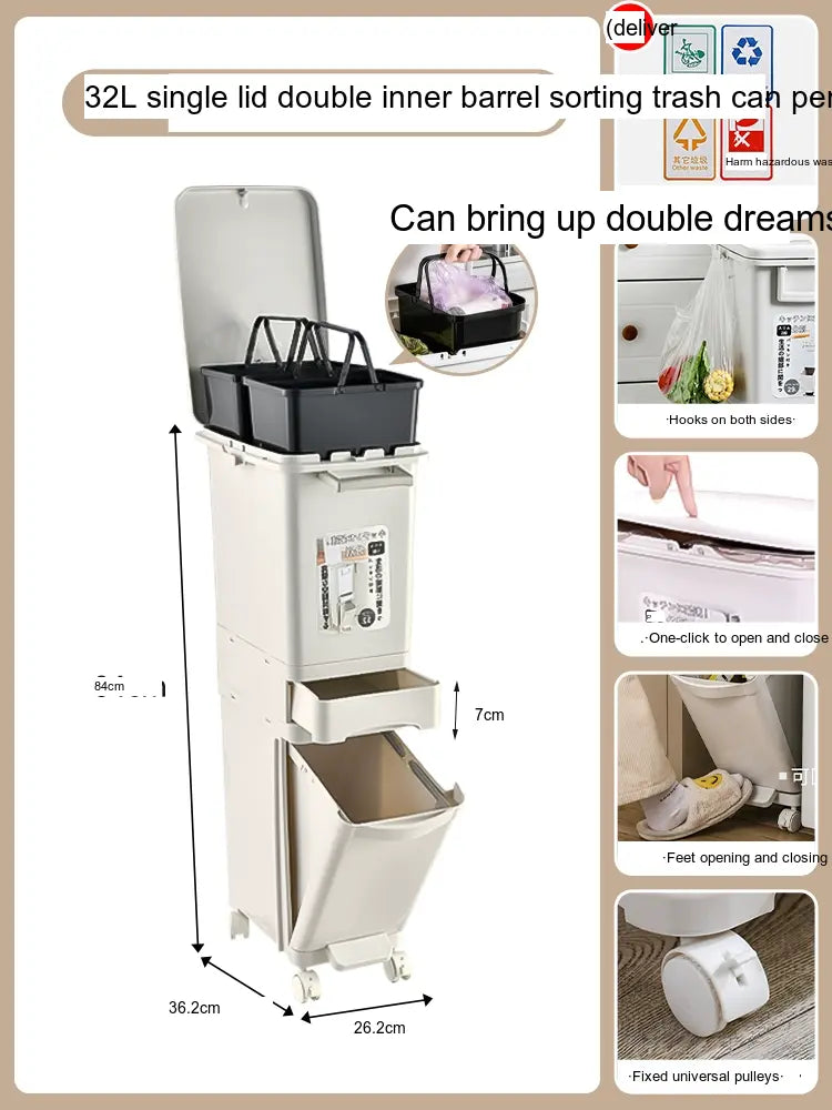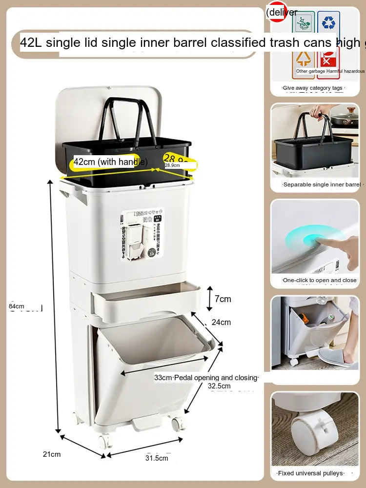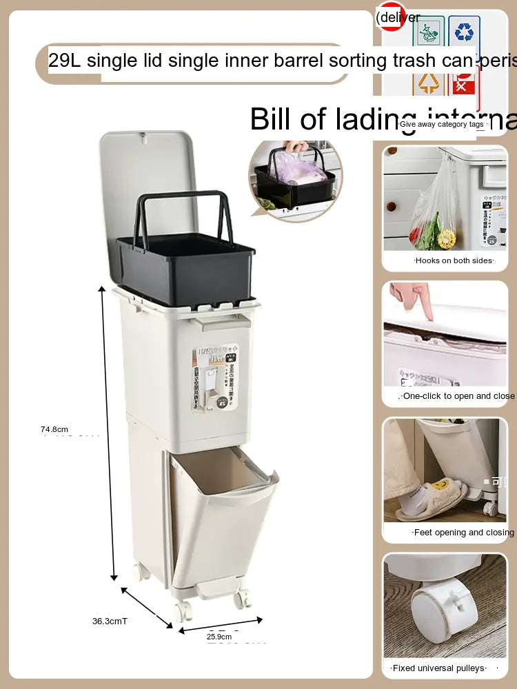 Function: Equipped with pull-out drawers, flip-top lids, and detachable inner bins with handles
